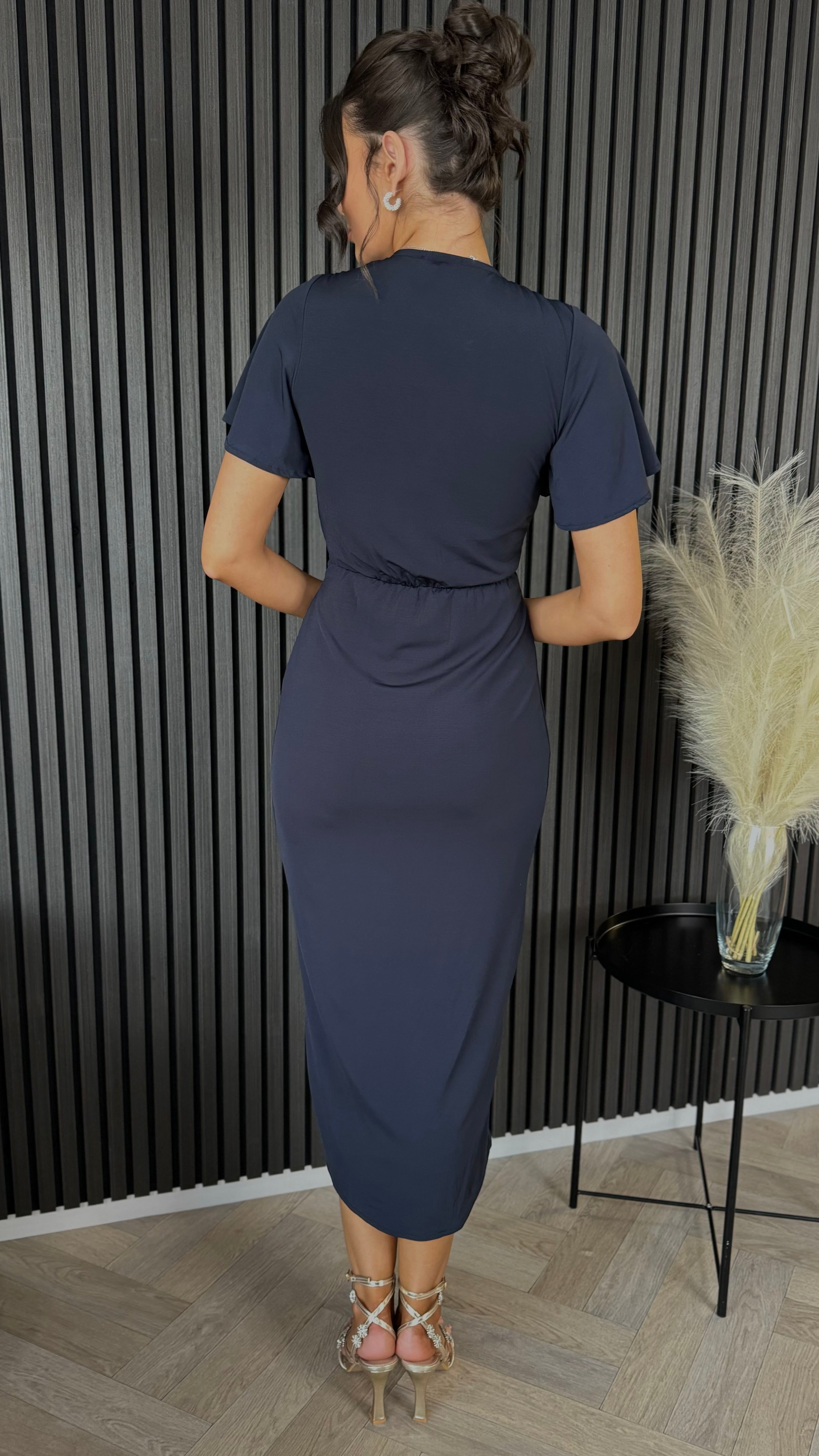 Susannah Navy Short Sleeve Ring Detail Wrap Midi Dress