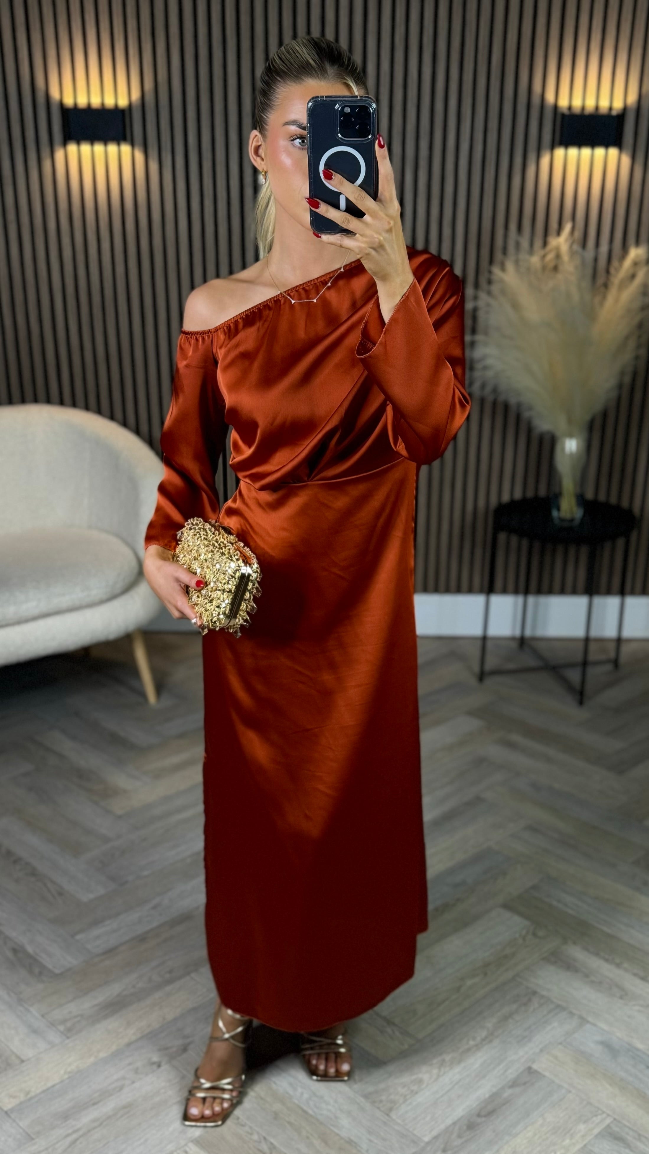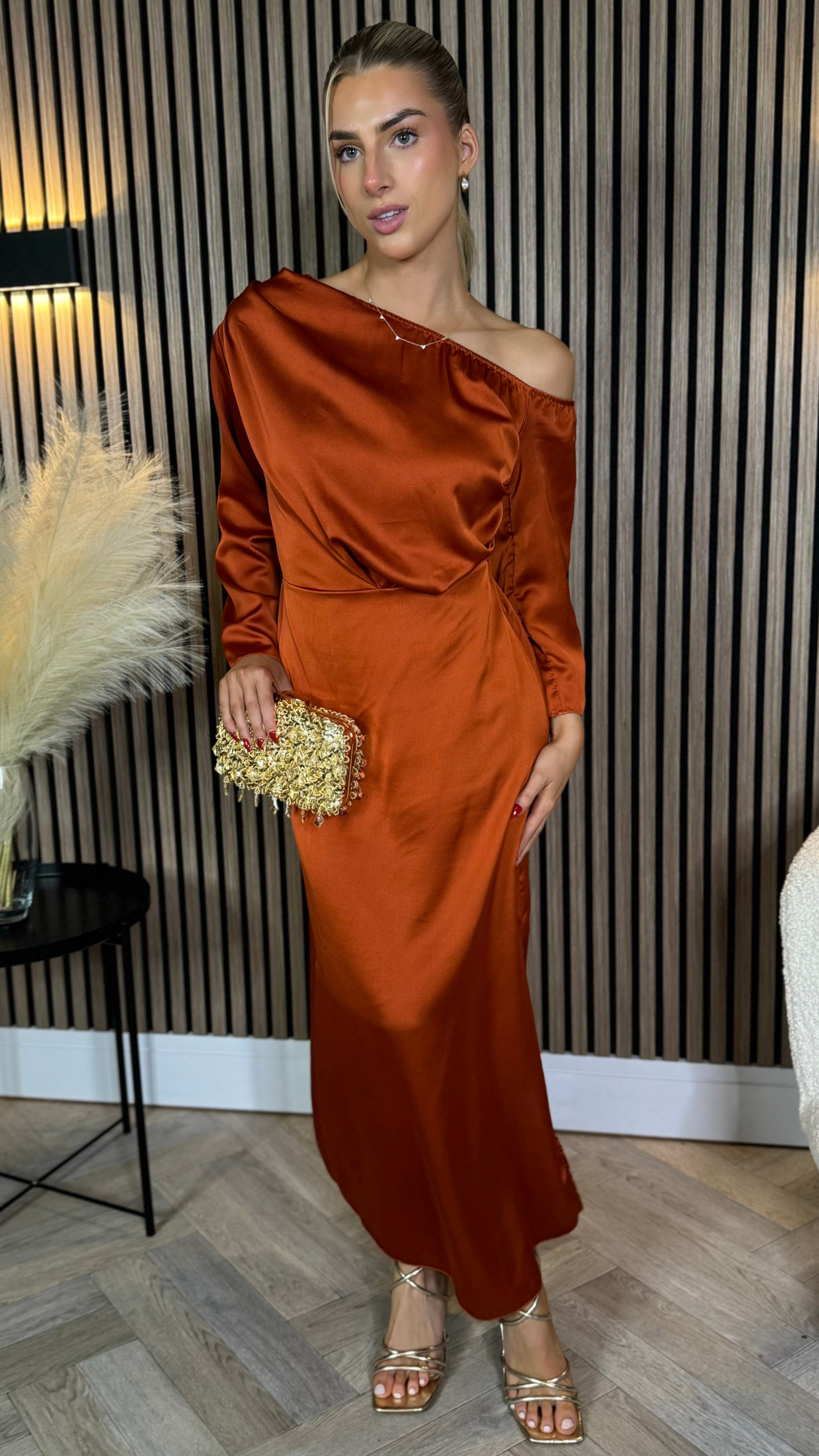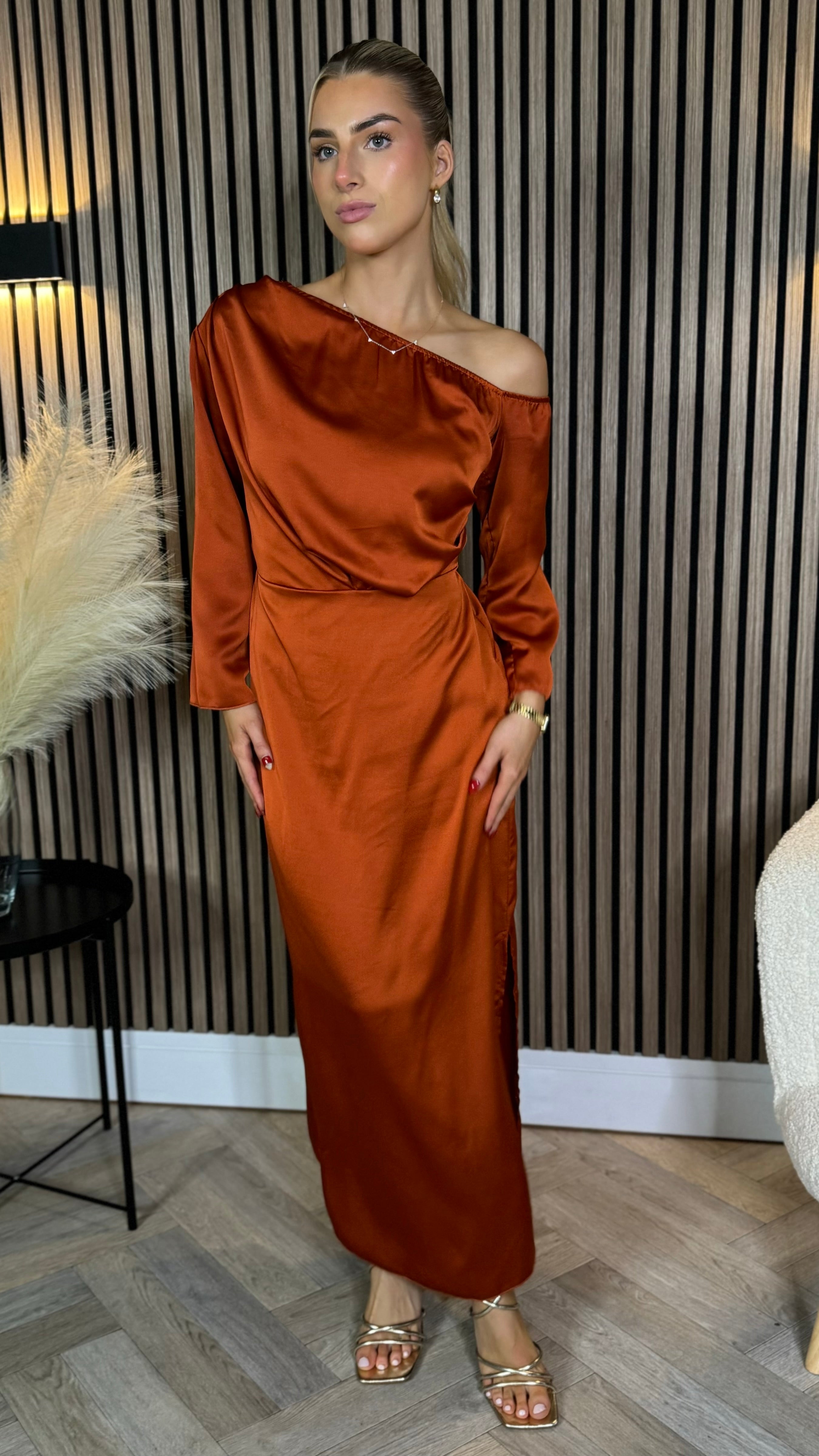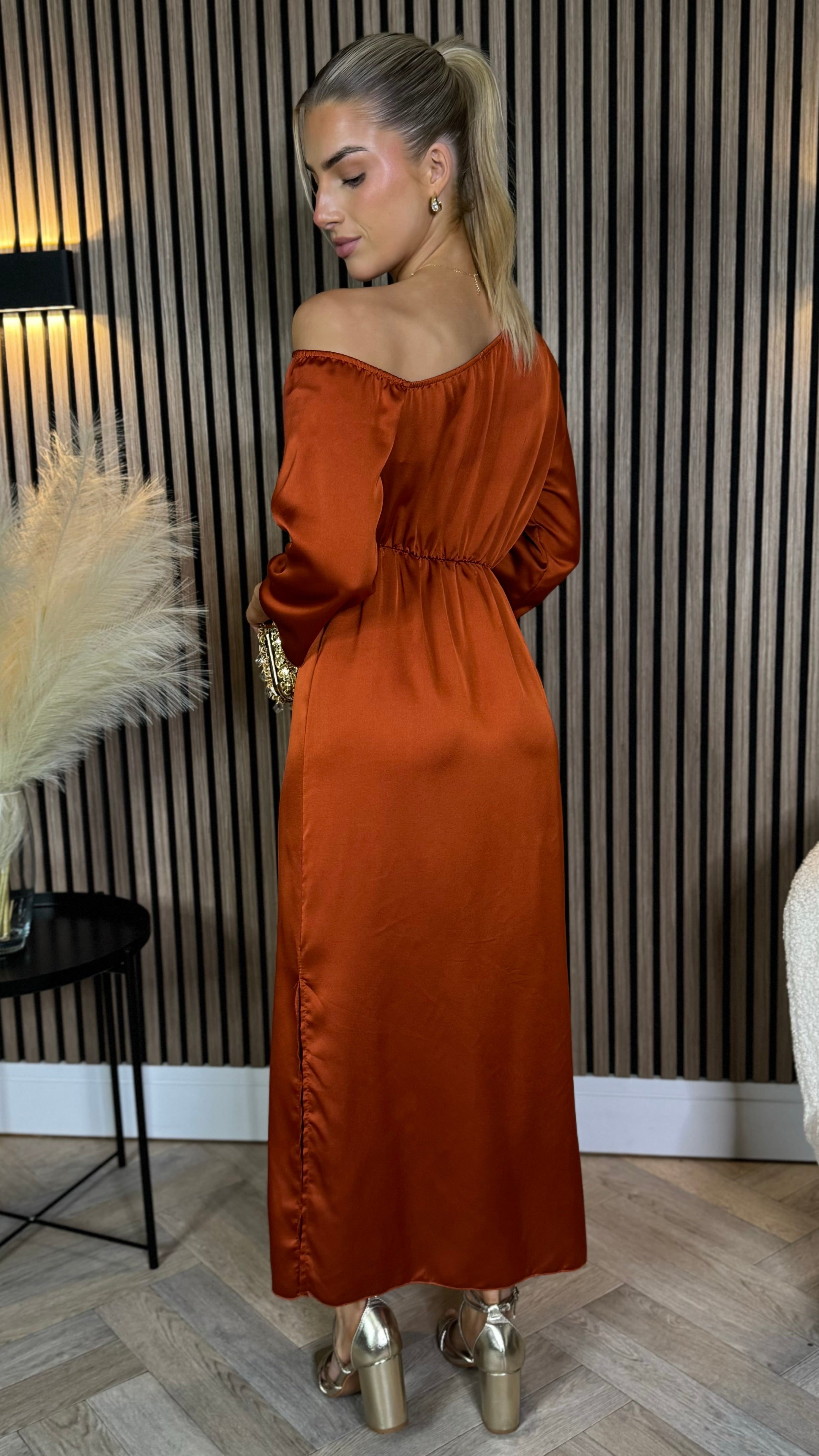 Tamera Rust Off The Shoulder Long Sleeved Ruched Midi Dress
