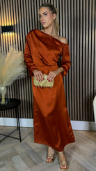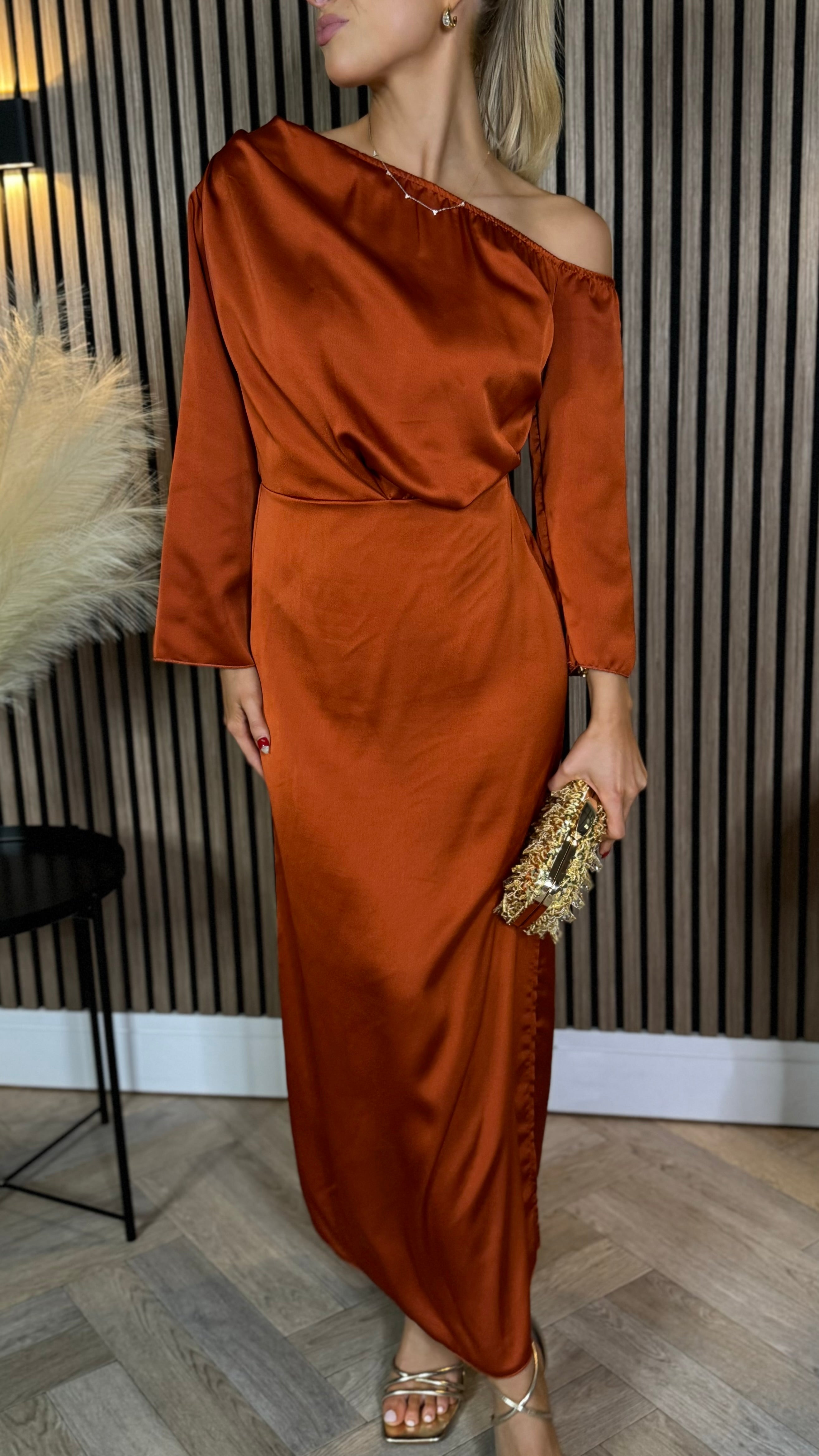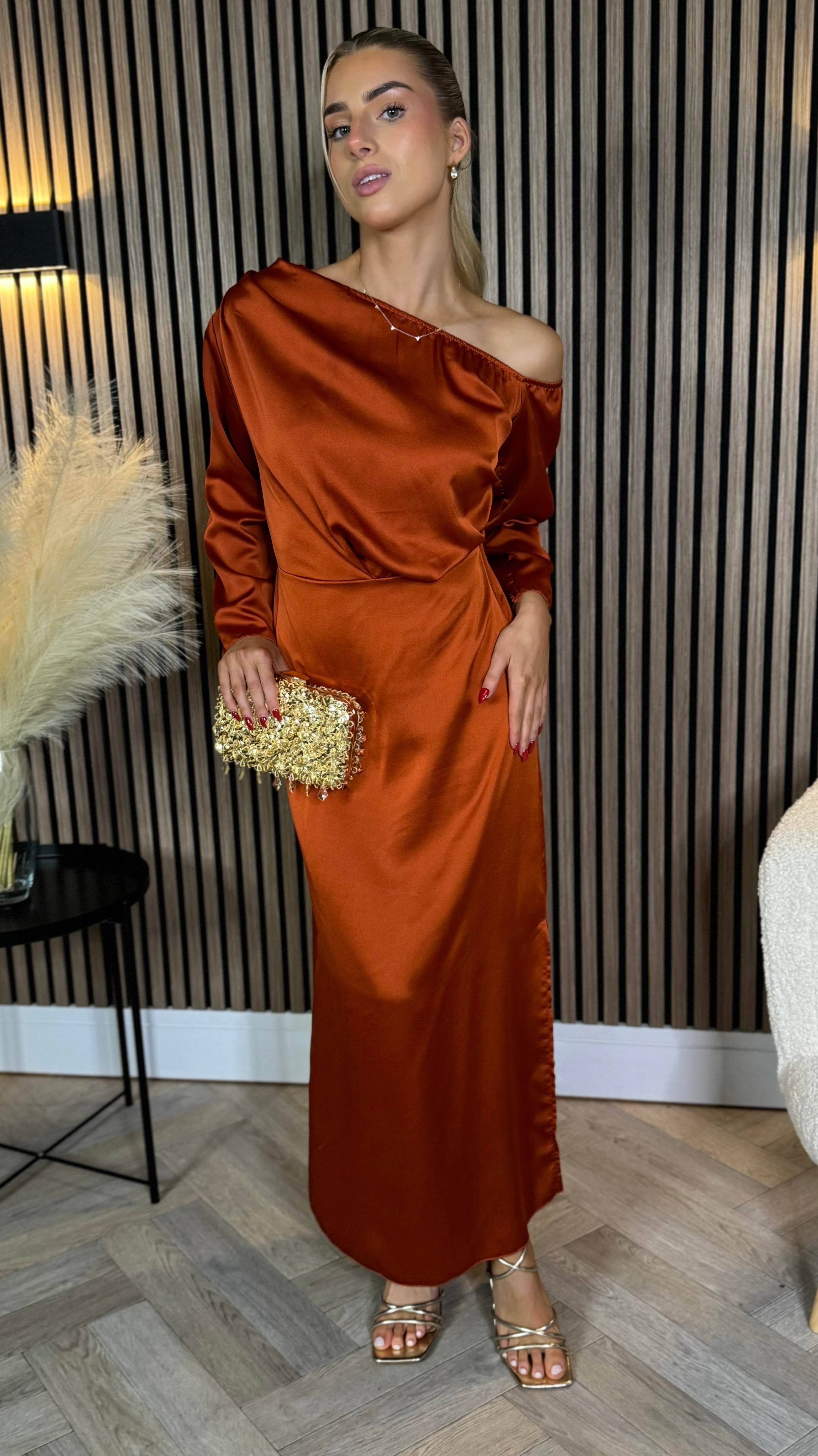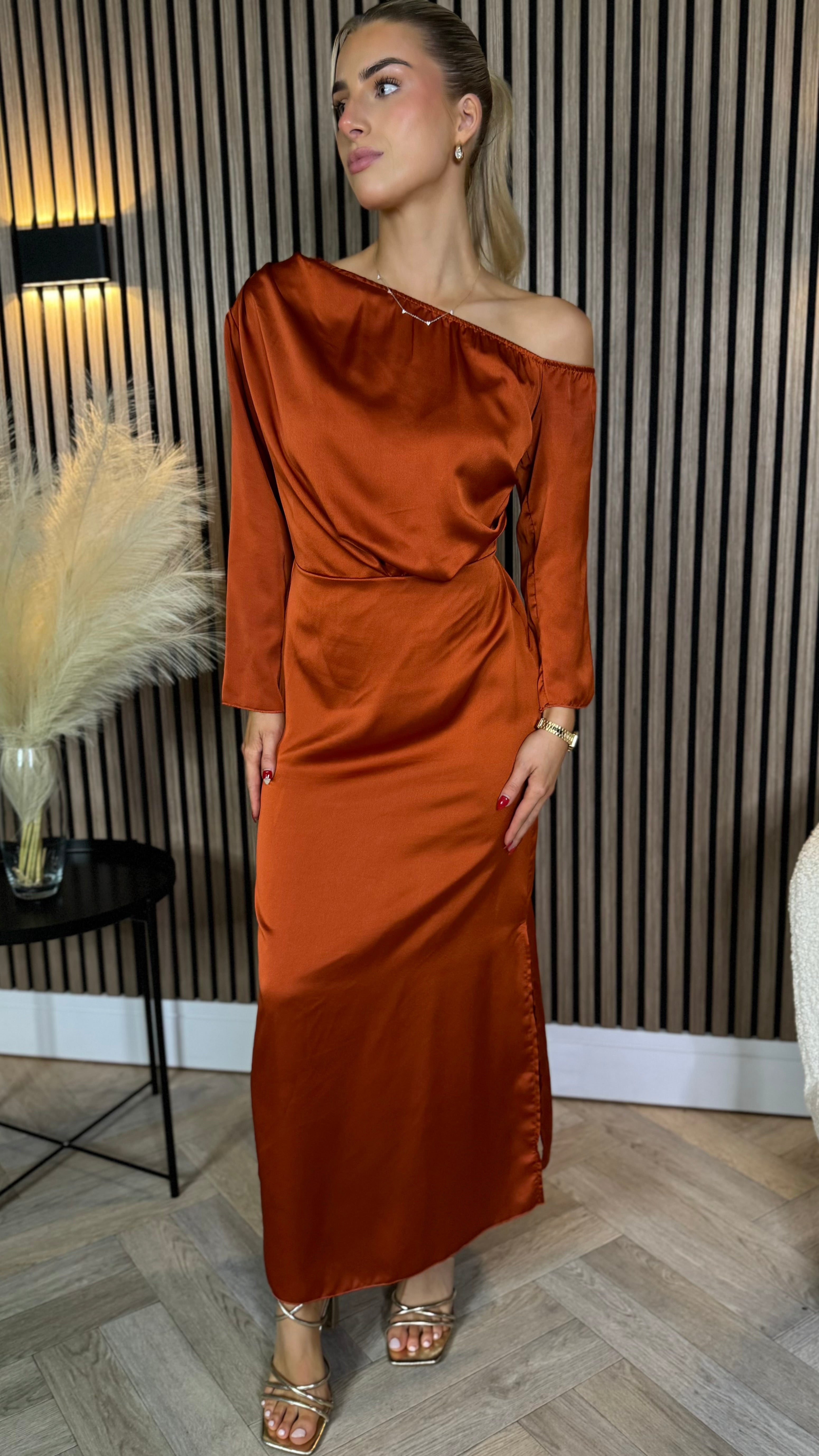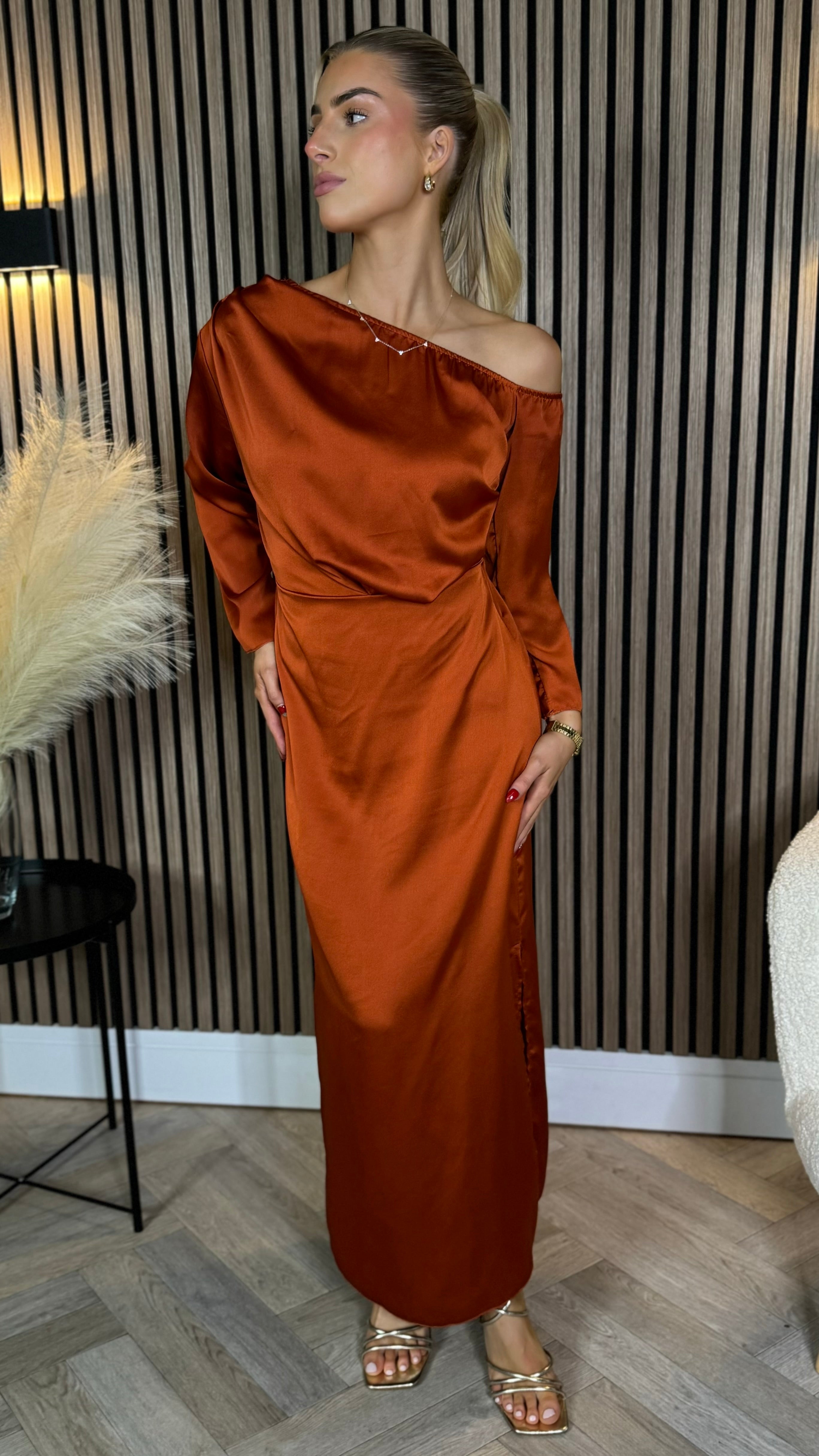 Tamera Rust Off The Shoulder Long Sleeved Ruched Midi Dress
