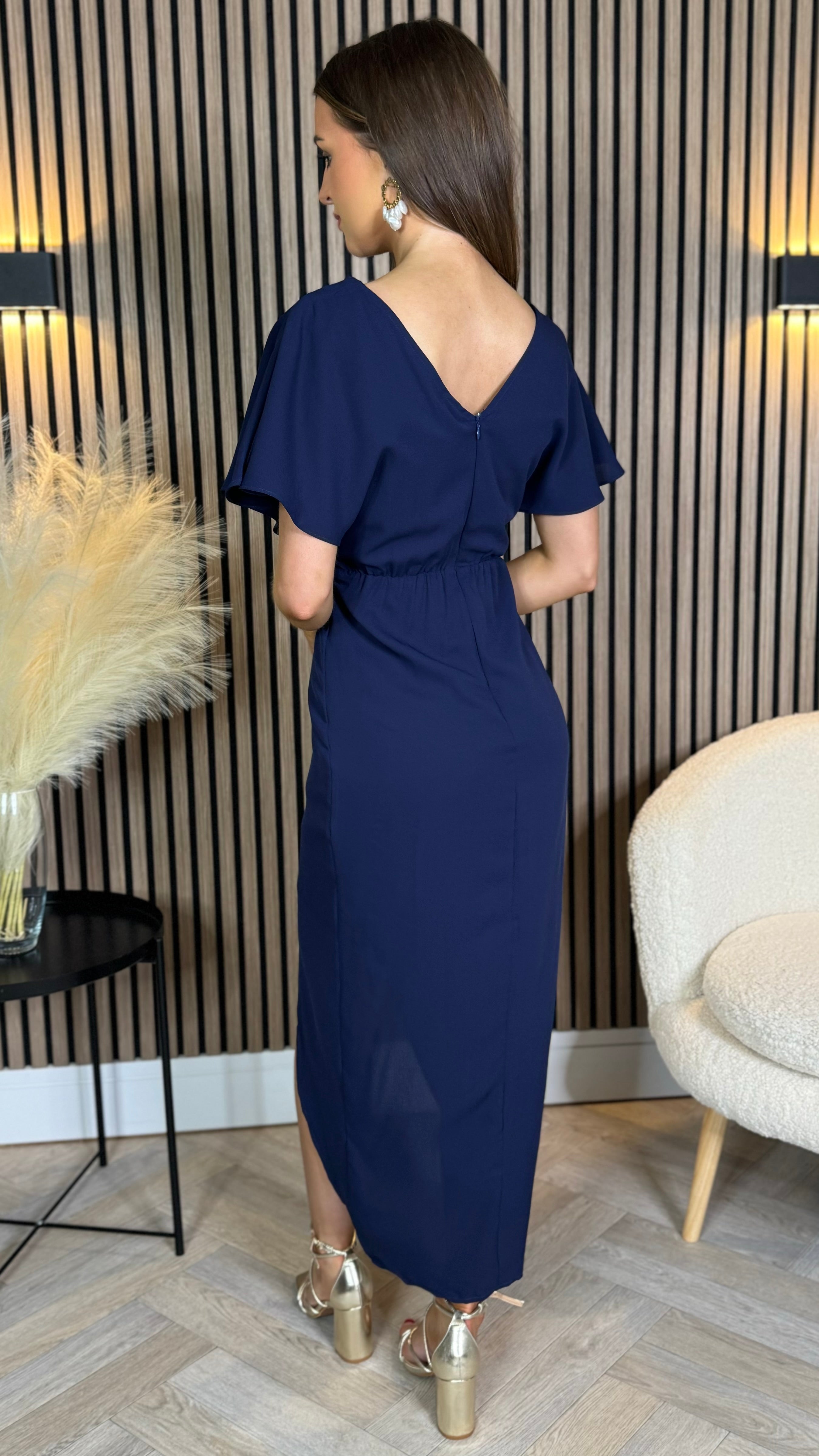 Get ready to slay the day in our Tasmin Navy Wrap Over Midi Dress. This versatile piece features an elasticated waist and ruched detailing for a comfortable and flattering fit. The wrap skirt with a slit adds a touch of sass, while the wrap front top completes the chic look. Add your favorite heels and matching clutch, and you're ready to take on the world! 💃