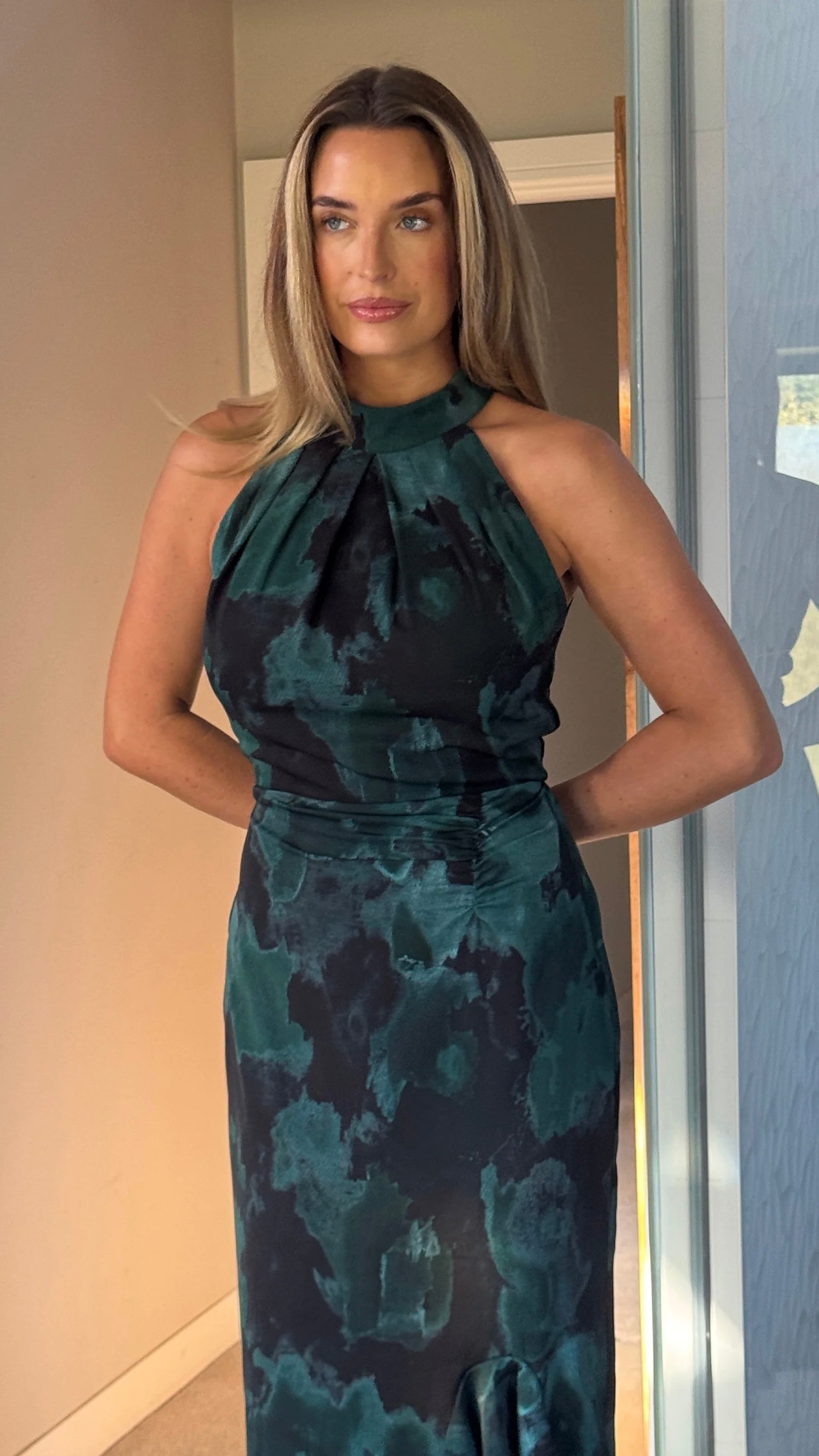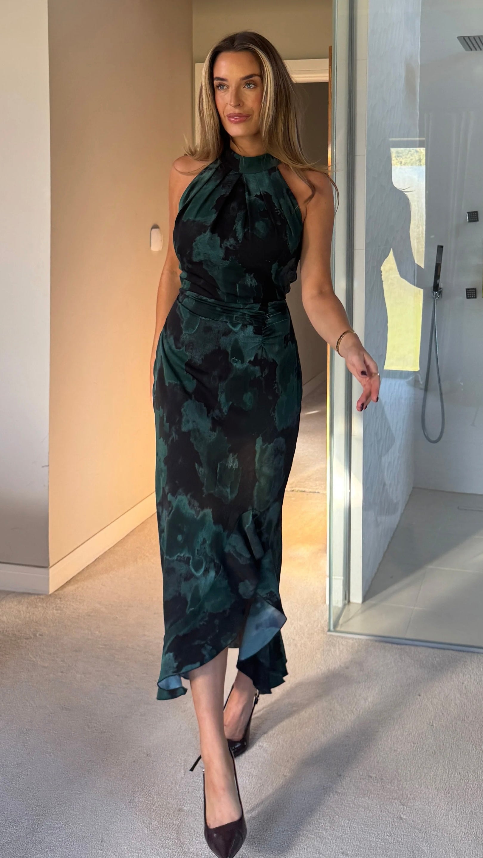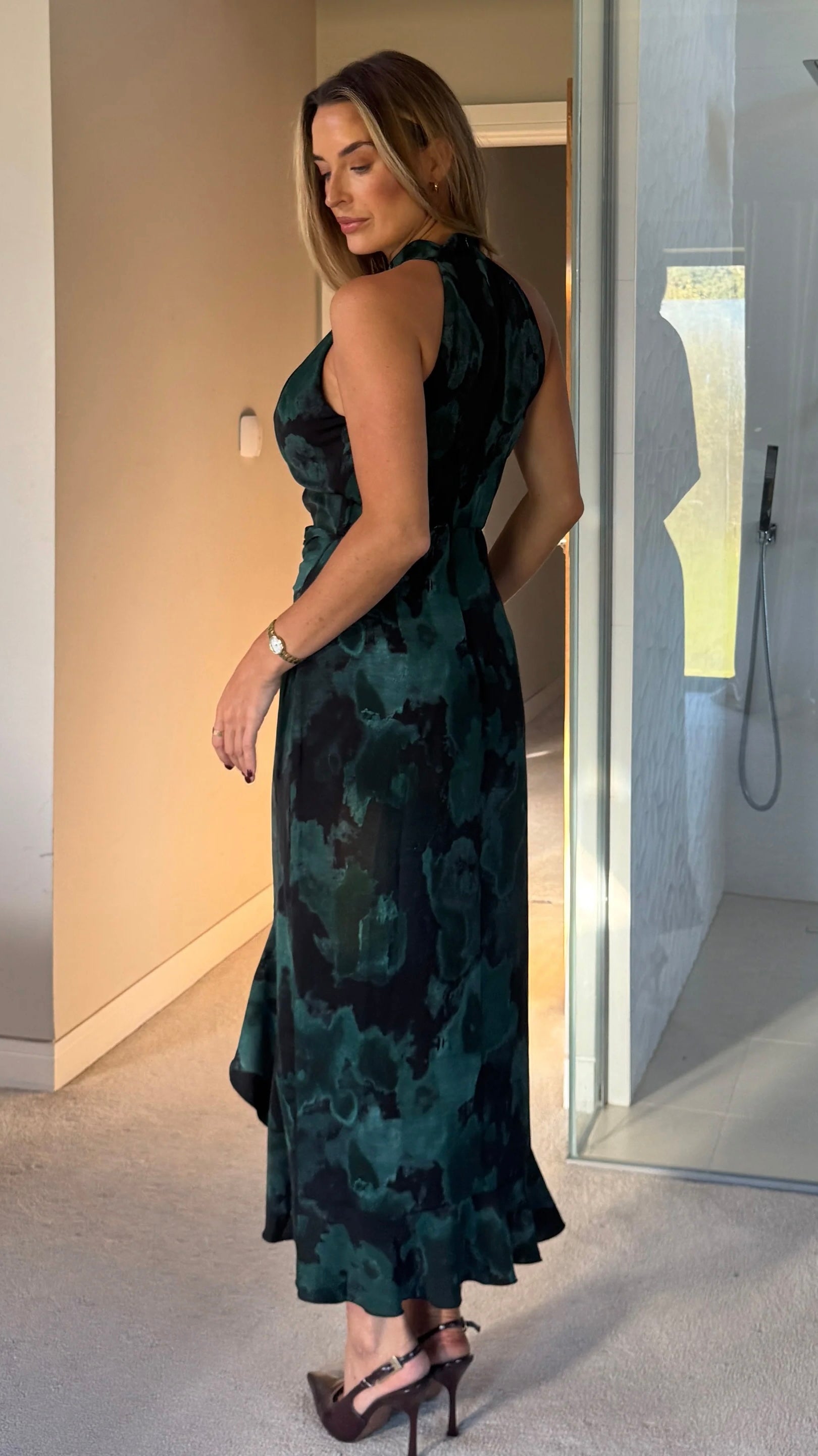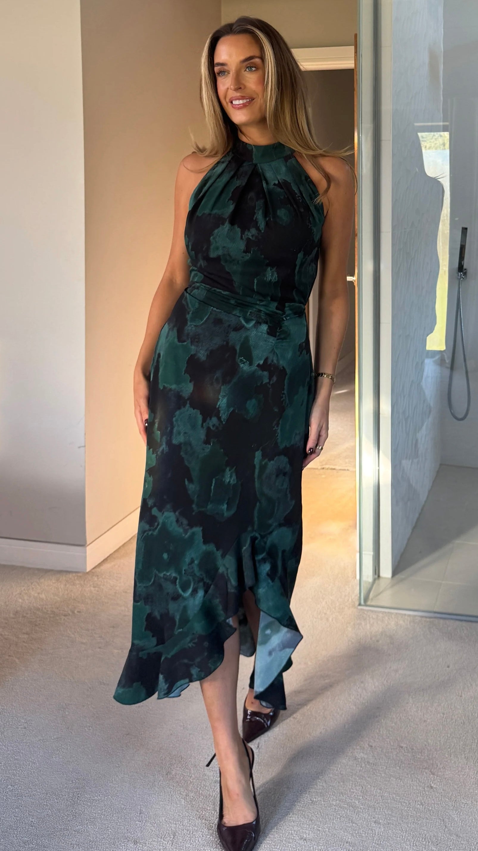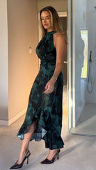 Slip into this stunning green printed midi dress and let the ruching do all the talking! The flattering halter neckline frames your shoulders beautifully, while the cleverly concealed back zip keeps things sleek and seamless. A playful frill hem adds just the right amount of movement and personality to your look. Perfect for turning heads at any occasion, this dress combines chic sophistication with fun, flirty details that'll have you feeling fabulous.