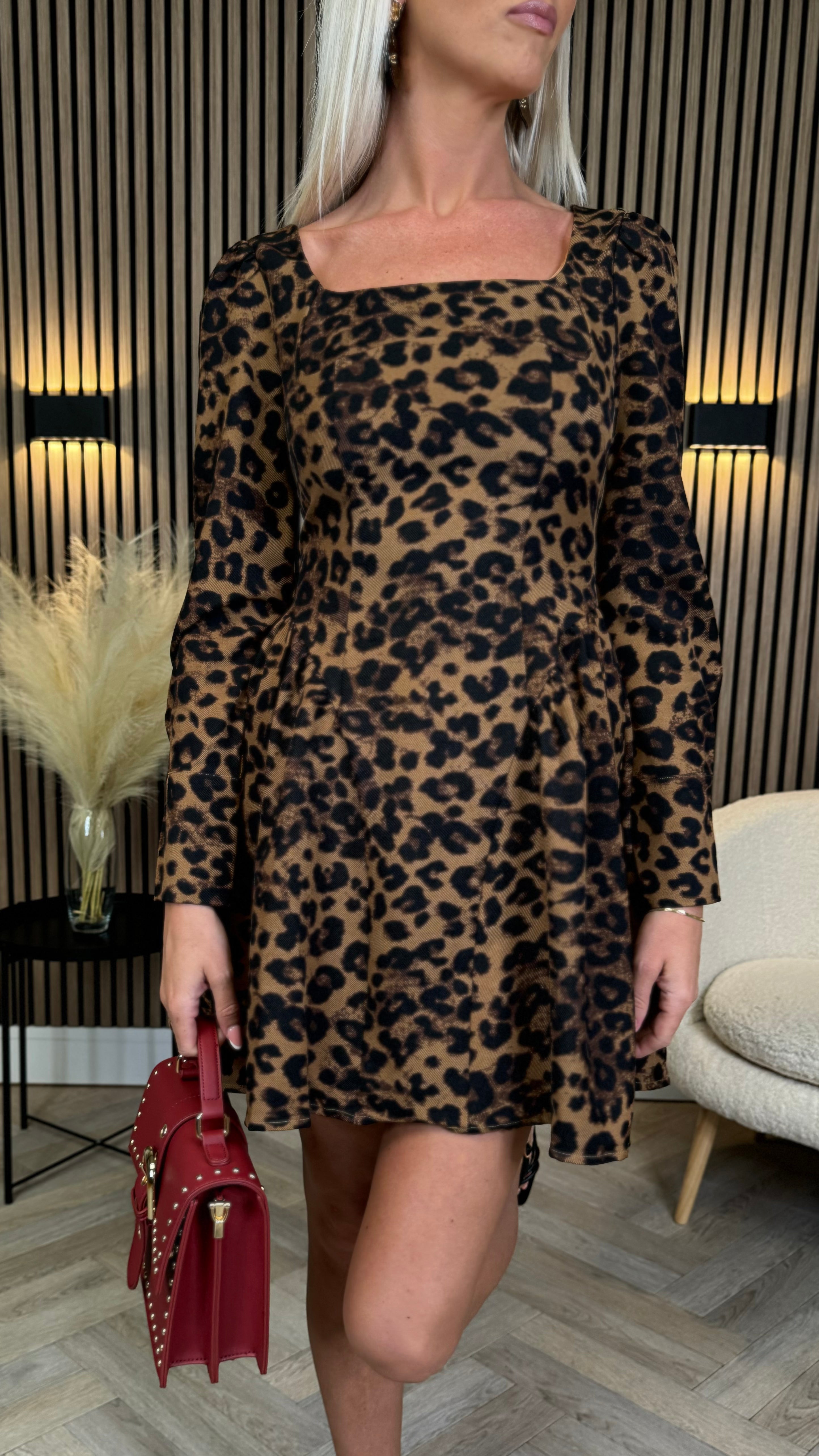 Tiffany Beige & Black Leopard Print Square Neck Mini Dress