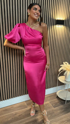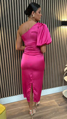 Turn heads in the Amaya Cerise Pink One Shoulder Satin Finish Midi Dress! 🤩 This stunning dress features an asymmetrical top and a single short puff sleeve, guaranteeing a unique and bold look. The fitted design will accentuate your figure, making you feel confident and beautiful. 💃