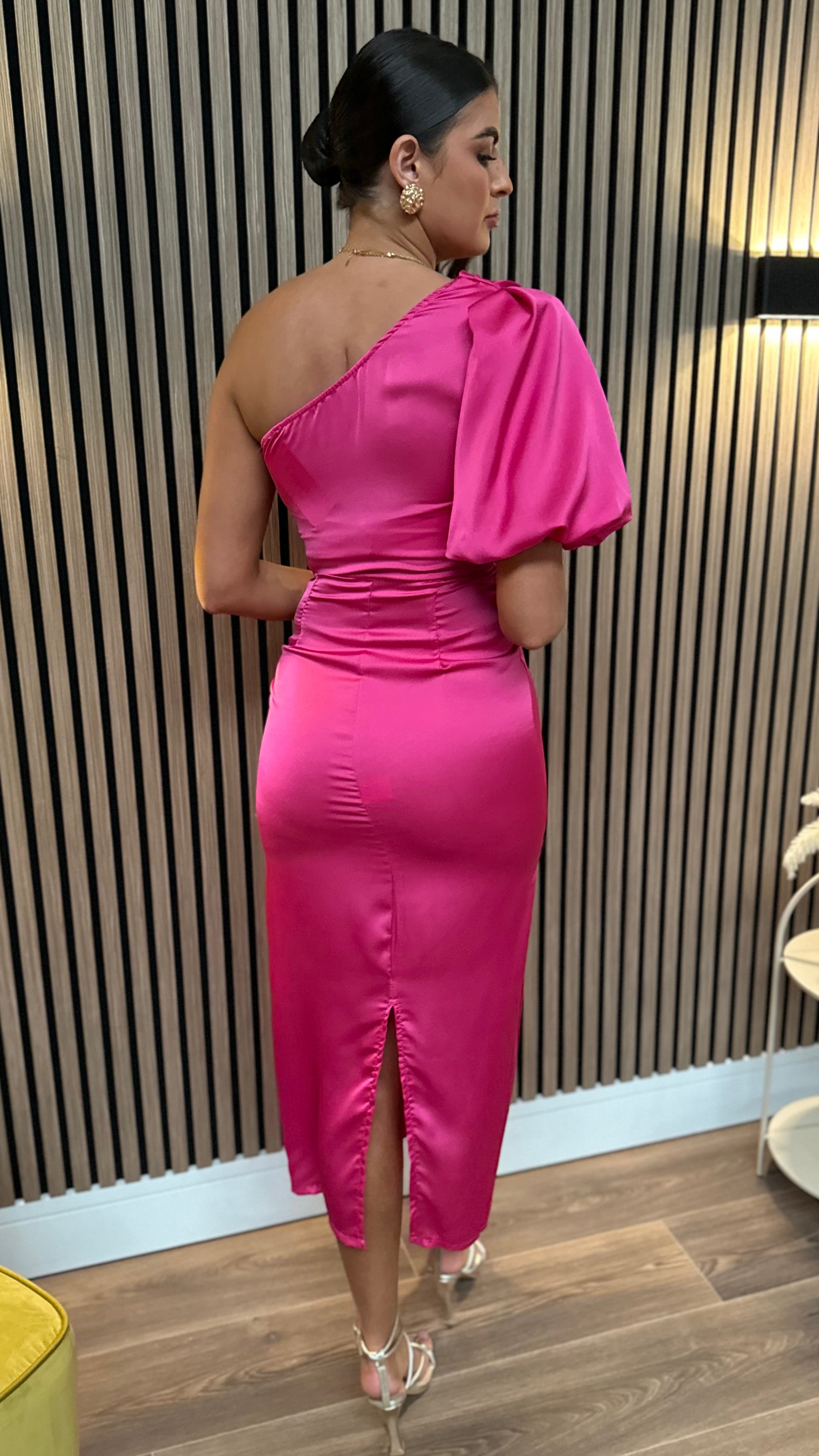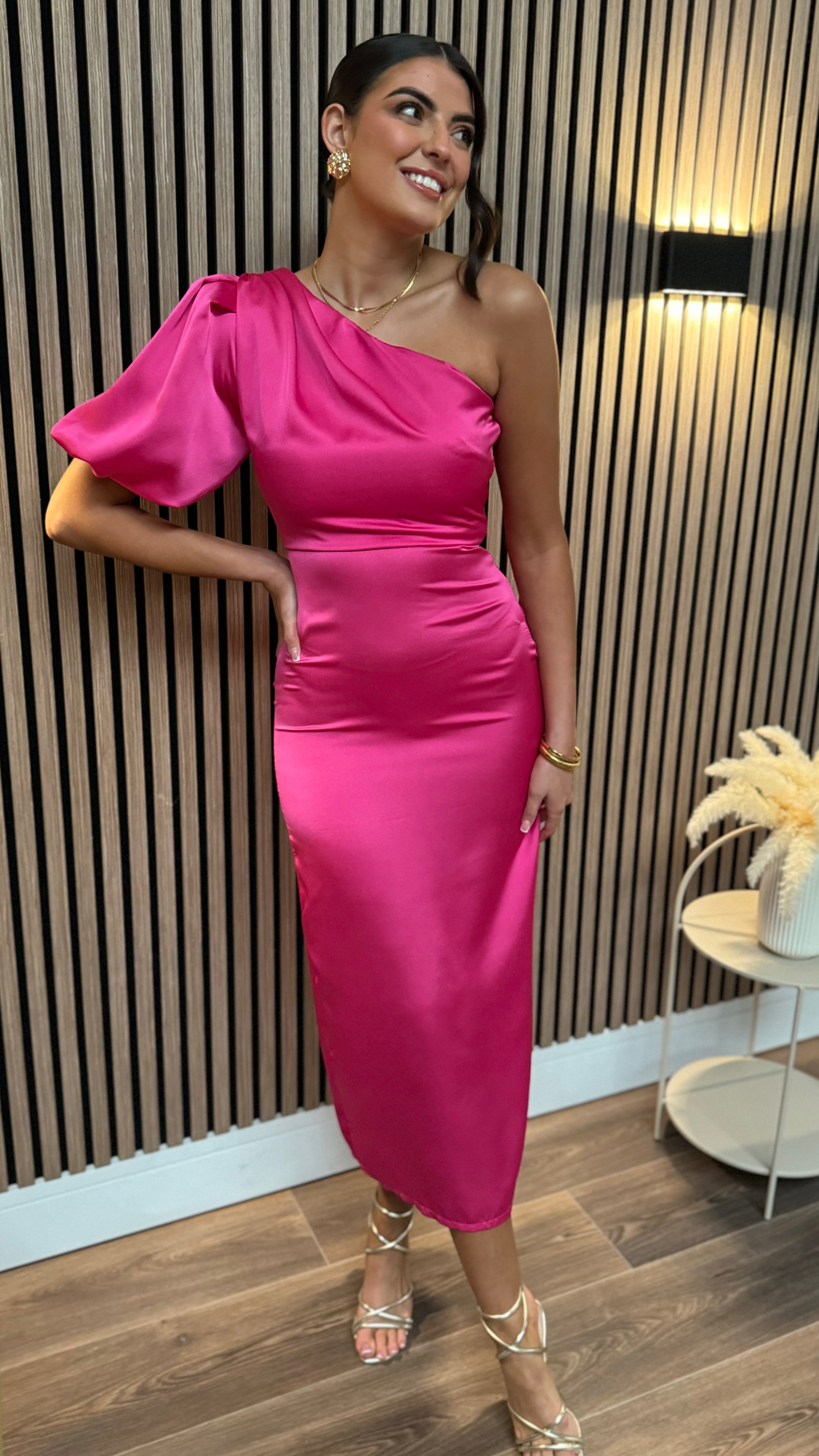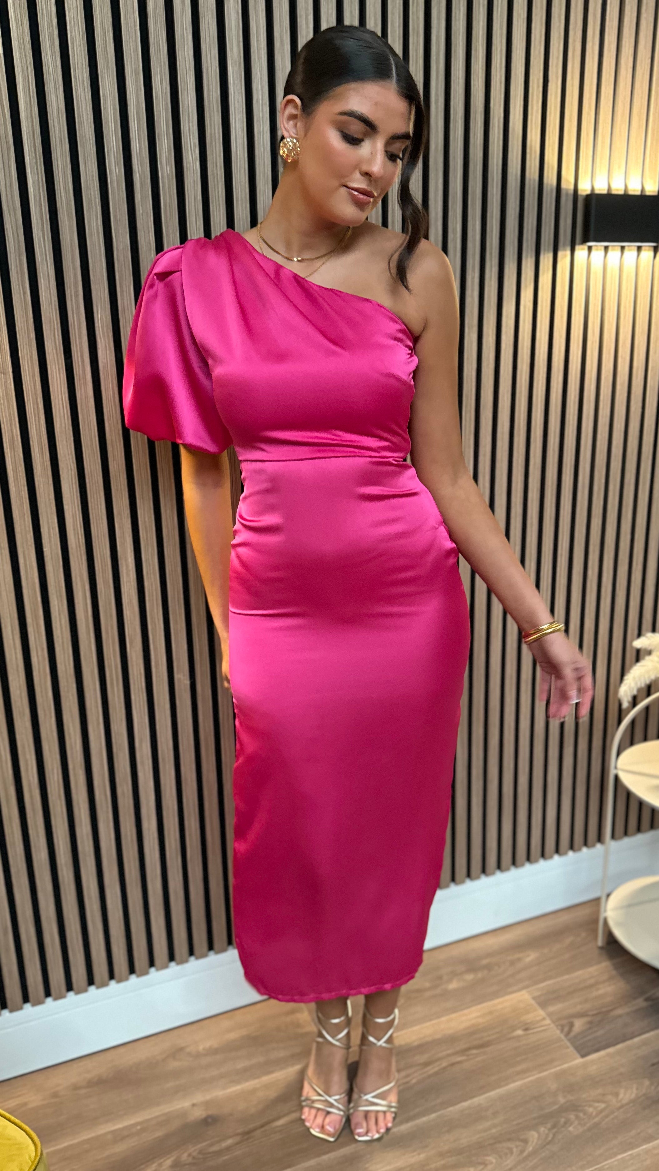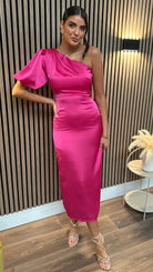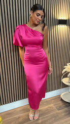 Amaya Cerise Pink One Shoulder Satin Finish Midi Dress