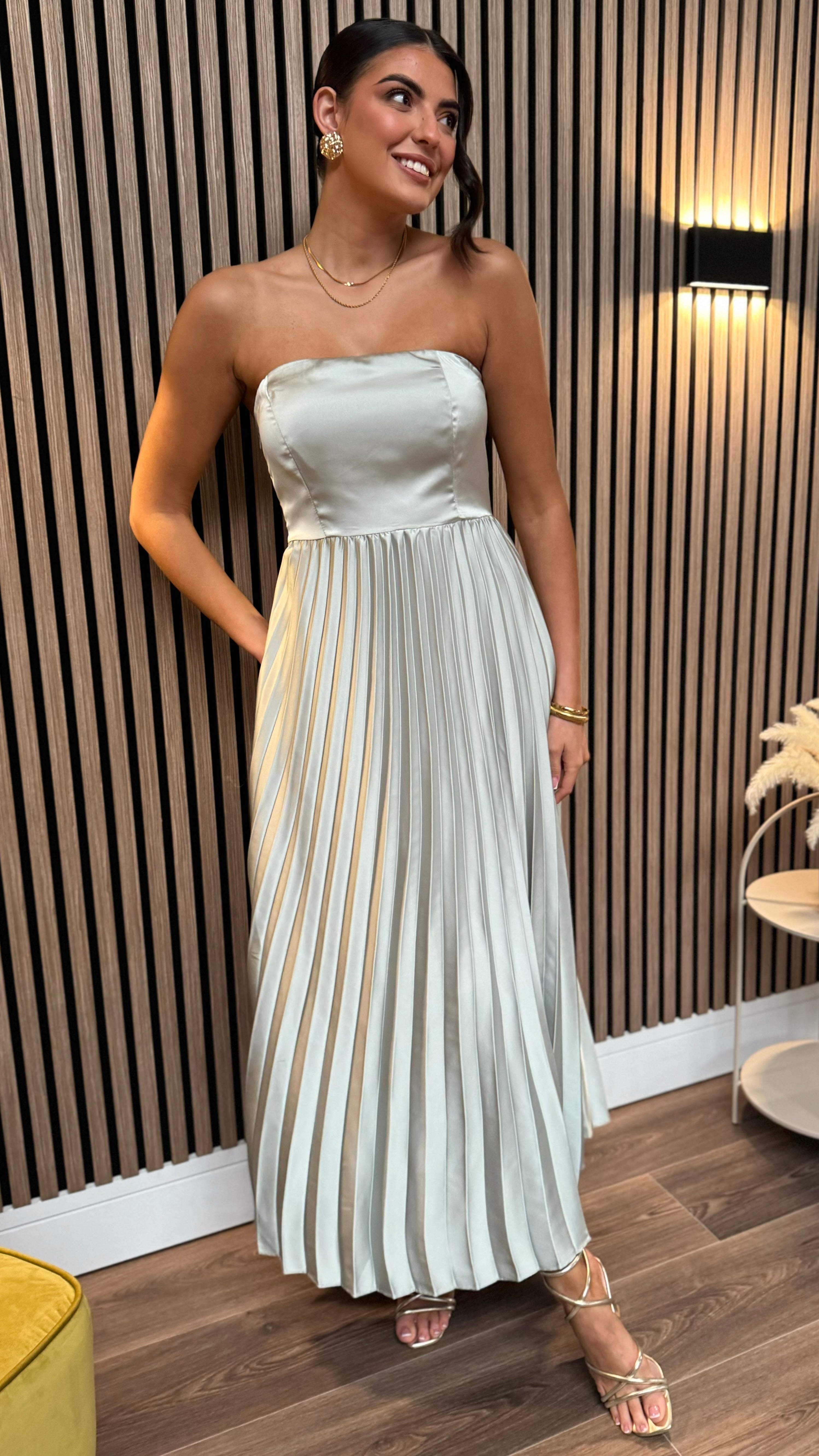Athena Light Green Satin Strapless Pleated Midi Dress