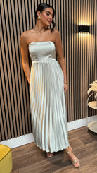 Spice up your wardrobe with the Athena Light Green Satin Strapless Pleated Midi Dress! This dress features a playful bandeau design, a flowing pleated skirt, and a convenient concealed zip. And with a non-slip inner band, you can dance the night away without worrying about wardrobe malfunctions. 🔥