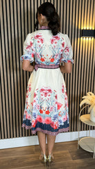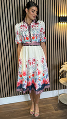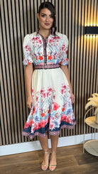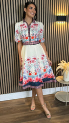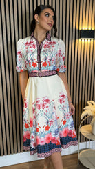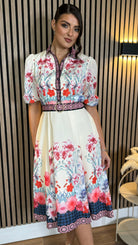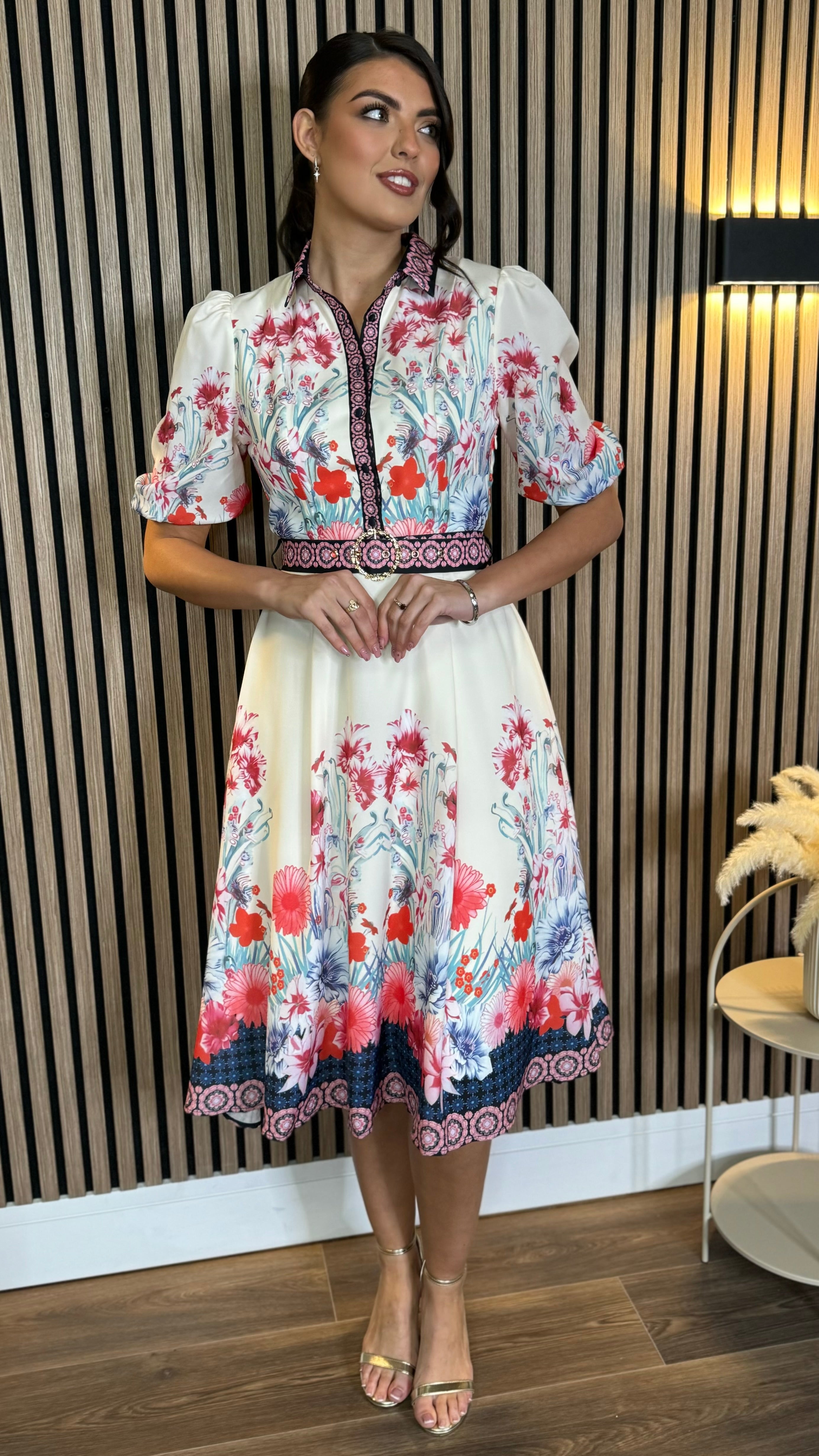 Introducing the Blythe Cream Floral Border Print Midi Dress - the epitome of luxury fashion. Elegantly adorned with a border print of delicate blooming flowers, this midi dress exudes sophistication and exclusivity. Its intricate design and premium craftsmanship make it a true masterpiece in the world of art and fashion. Elevate your wardrobe with this exceptional piece and indulge in the beauty of its sensory-oriented details.