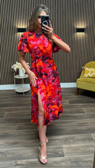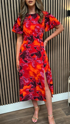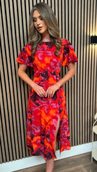 Elevate your appearance with the Brielle Orange Floral Print Angel Sleeve Midi Dress. Made from opulent printed material, this striking garment showcases a split leg style and angel sleeves for a flattering, luxurious aesthetic. Make an impression in this exquisite dress.