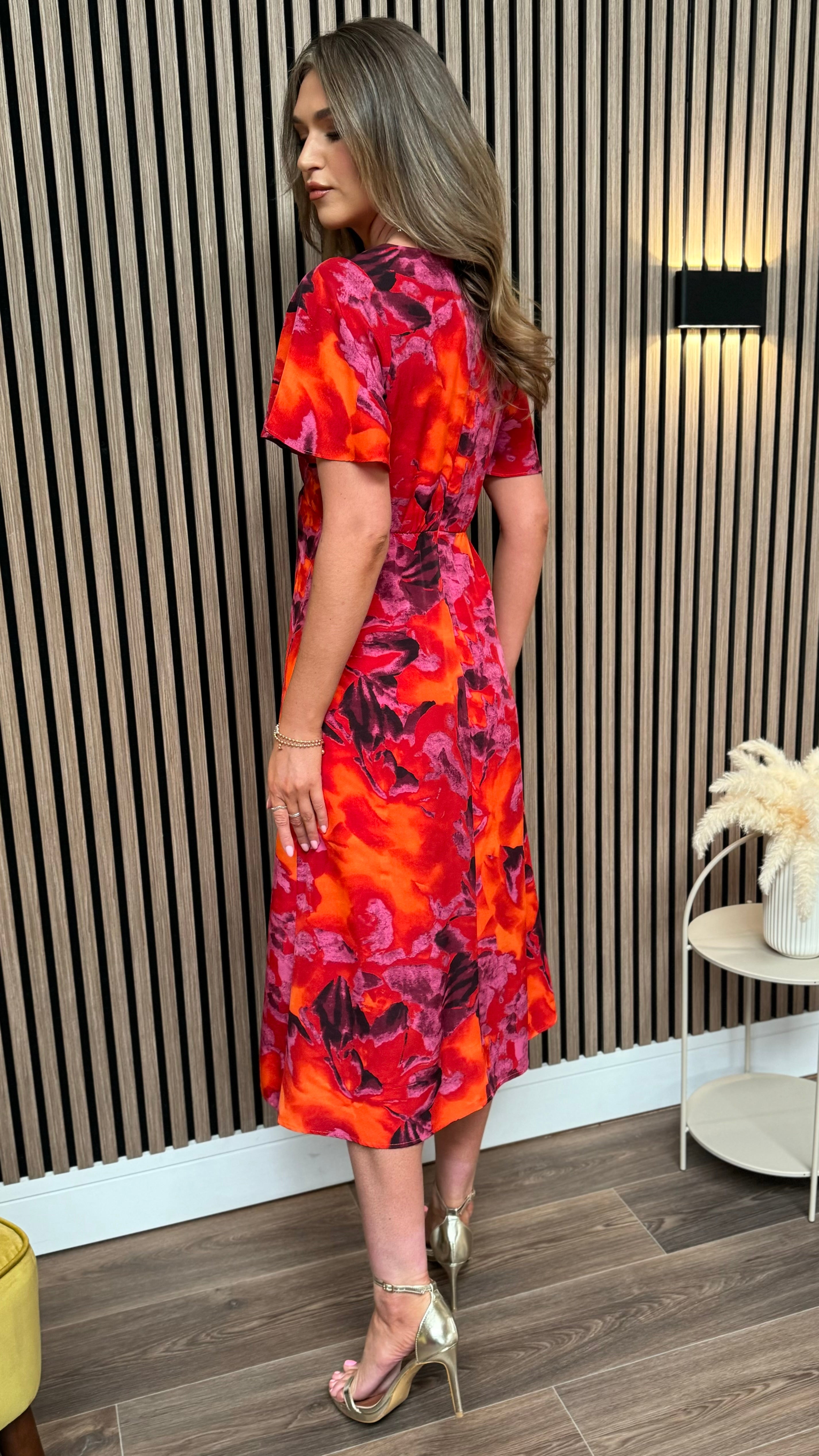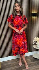 Brielle Orange Floral Print Angel Sleeve Midi Dress
