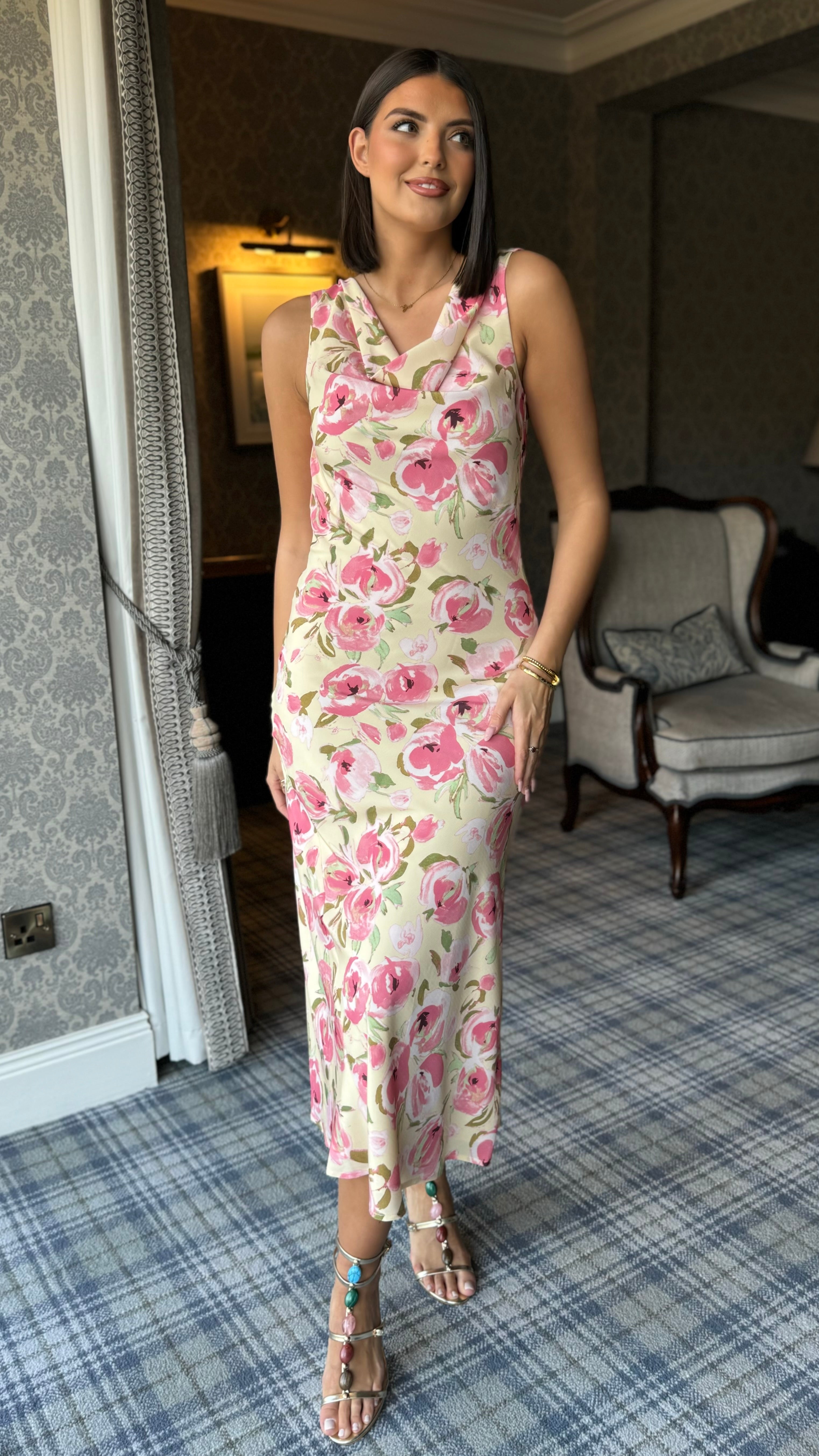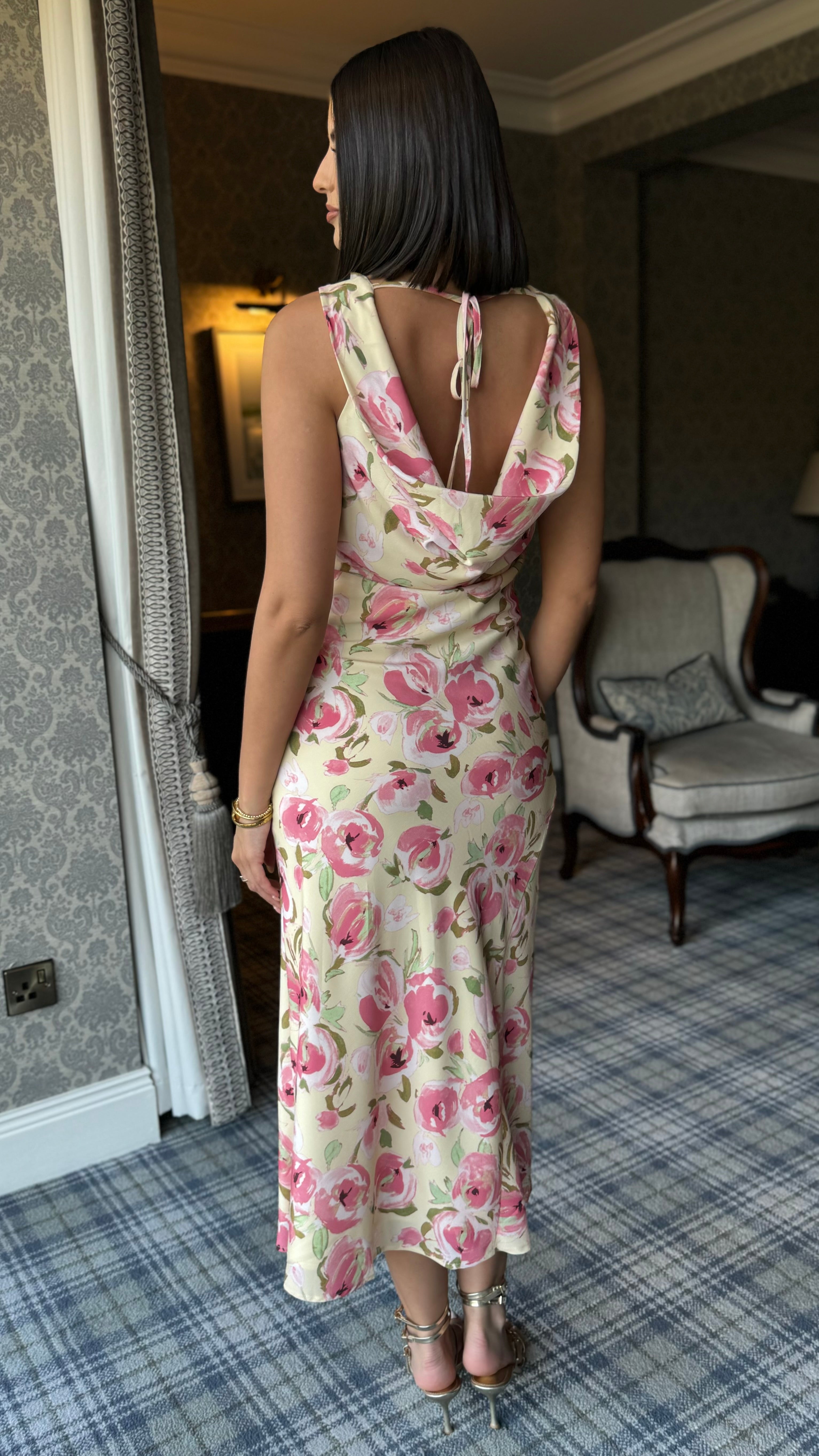 Cameron Lemon & Pink Floral Cowl Neck Midi Dress