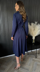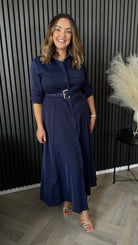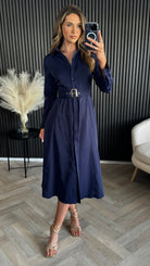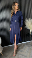 Introduce serious style vibes to your wardrobe with the Cara Navy Belted Shirt Midi Dress. The long sleeves feature tailored cuffs, while the buckle tie waist belt accentuates your figure. The shirt collar and button detailing add a unique touch to this must-have dress.