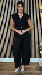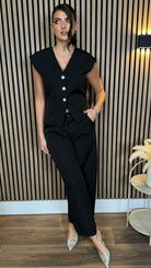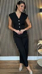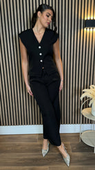 Say hello to the Darcy Black Straight Leg Trousers & Waistcoat Co Ord, the perfect combo for a sophisticated and stylish look. These straight leg trousers and waistcoat feature structured shoulders and a button down design to add a touch of elegance to your outfit. Get ready to turn heads and make a statement with this must-have set.