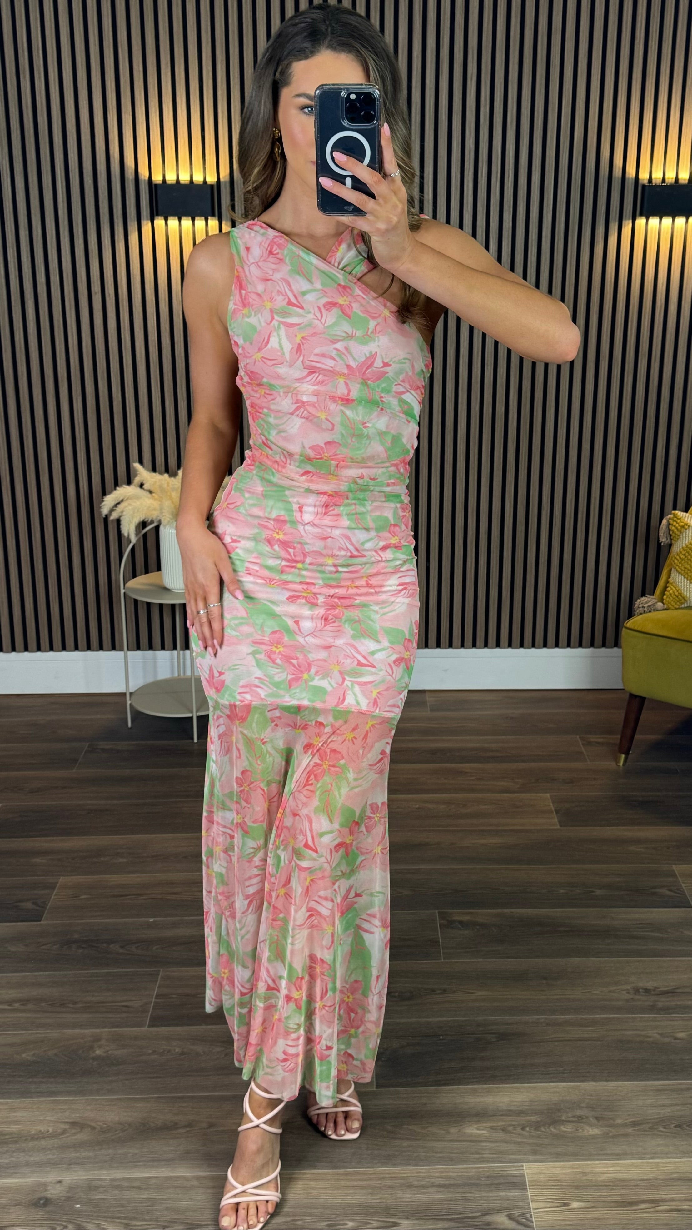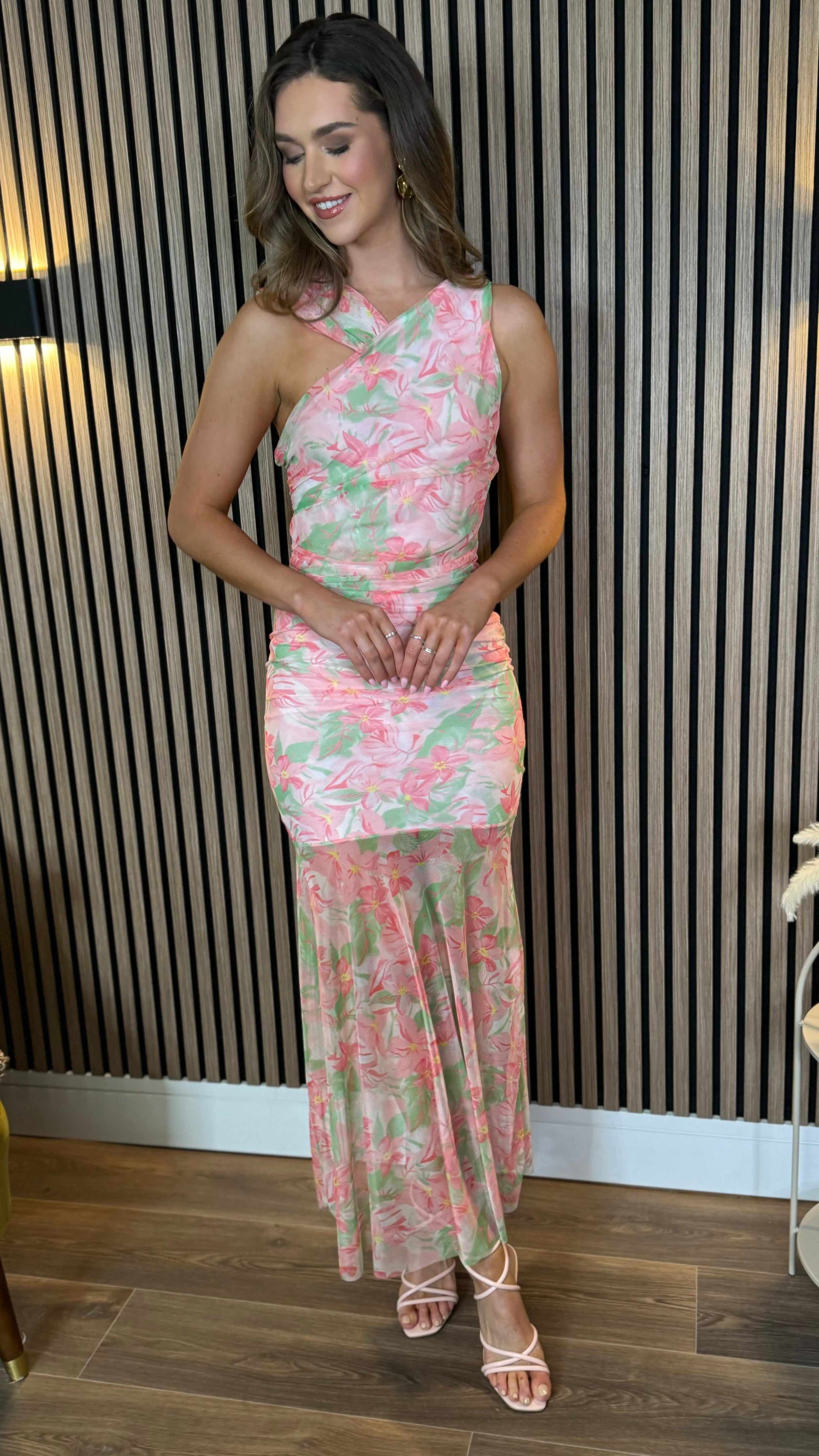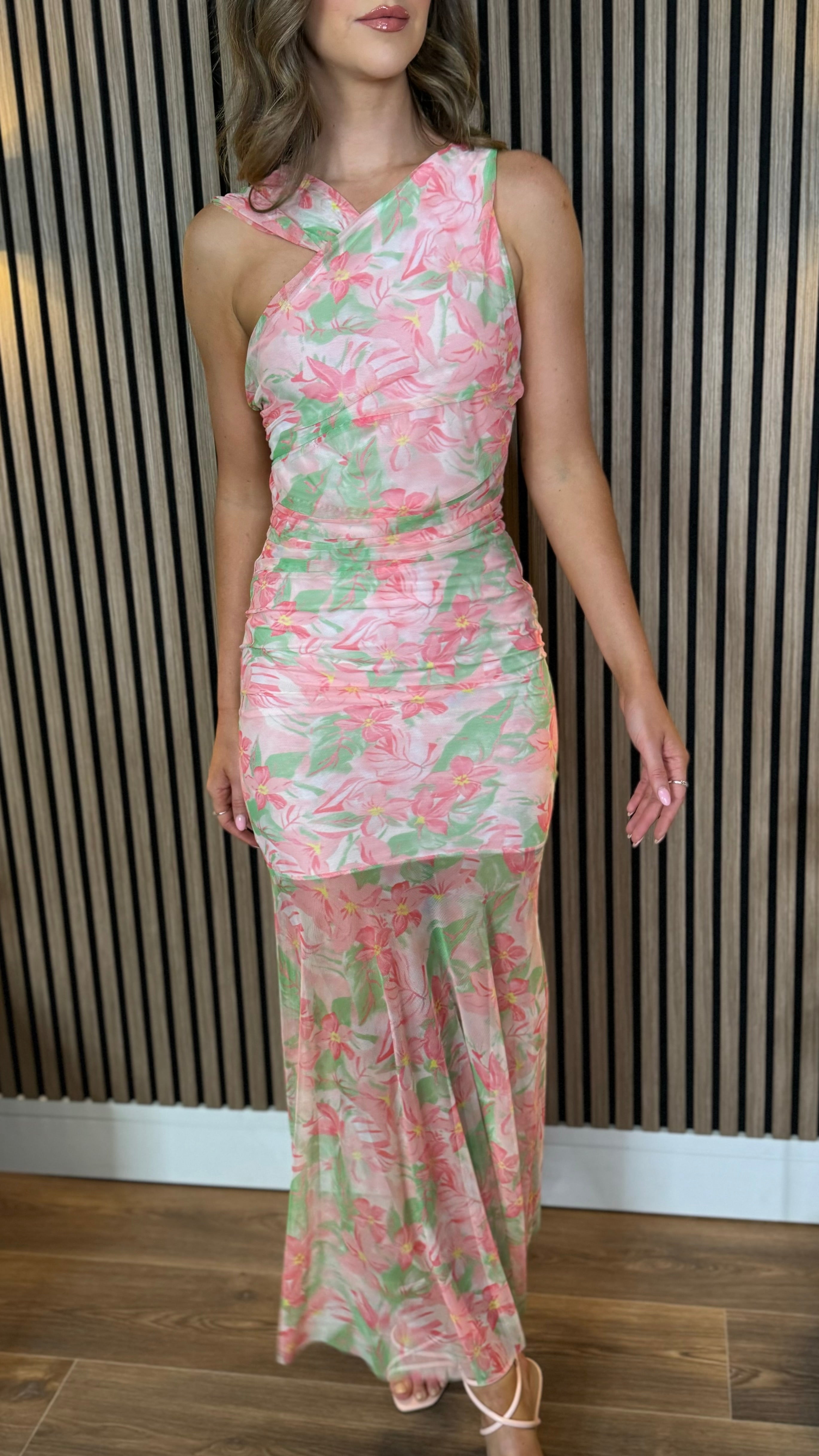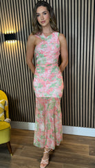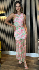 Delta Coral & Green Chiffon Shoulder Detail Midi Dress