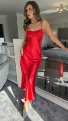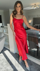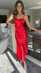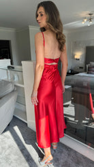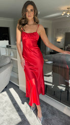 Be the life of the party with our Elena Red Cami Strap Satin Finish Midi Dress! Featuring ruched bust and back cut out details, this dress is playful and stylish. Stand out in this unique and trendy dress. 💃
