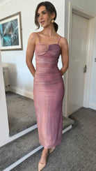 Sizing info: Our model Lauren is wearing the UK size 8 in this dress. If you're between sizes, we recommend going with the bigger size. Get ready to turn heads with the Elina Beige Ombre Printed Cami Strap Midi Dress. Featuring a playful ombre print and a flattering ruched design, this dress also has a built-in bra detail for added support. Perfect for any occasion, you'll feel confident and stylish in this quirky dress. 🔥