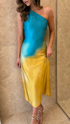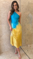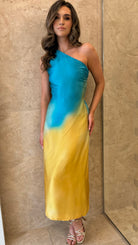 Turn heads and make a statement with our Gianna Midi Dress, in stunning sunset ombre. This one shoulder dress features a playful twist detail and an open back, perfect for summer occasions. The elasticated waist and side zip ensure a comfortable and flattering fit. Embrace the summer vibes with this must-have dress! 🌅