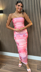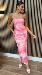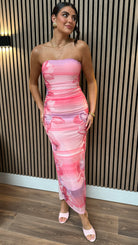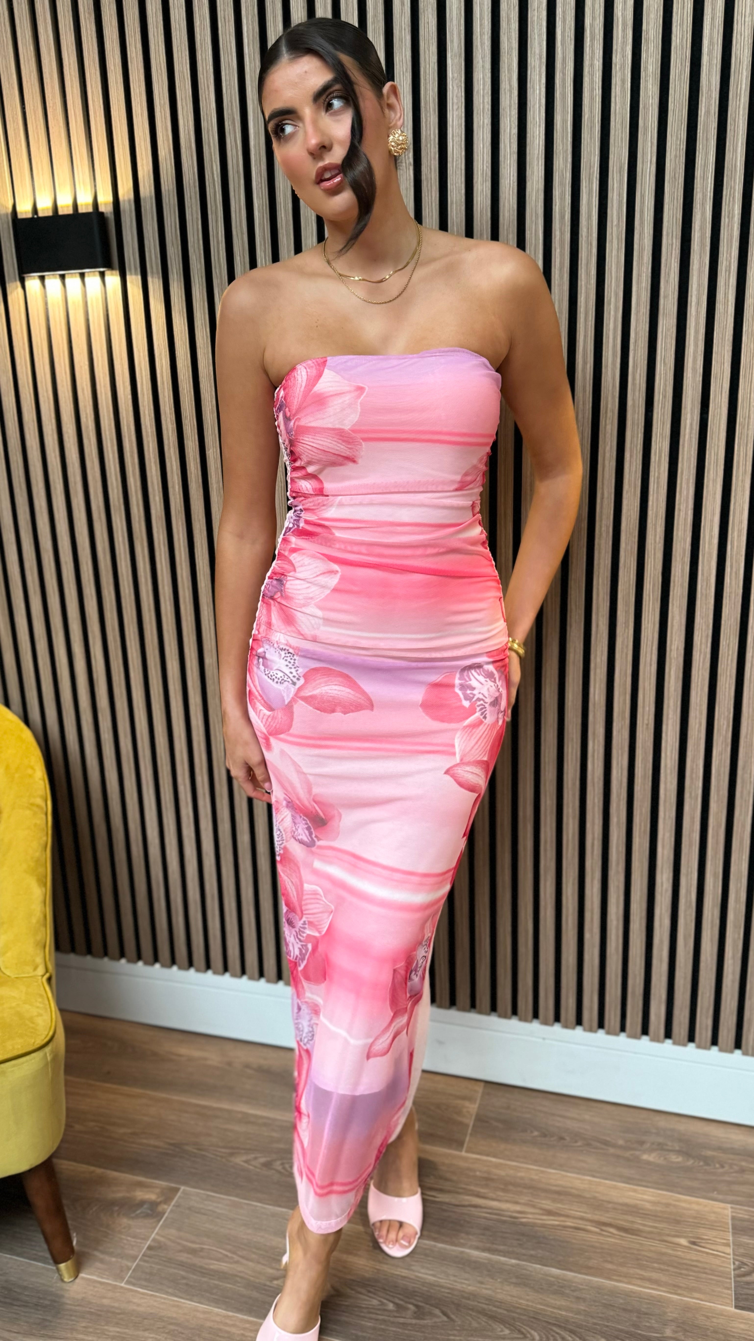 Harvey Pink Floral Printed Bandeau Ruched Midi Dress