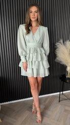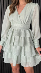 Kennedy Light Green Textured V Neckline Tiered Skirt Mini Dress