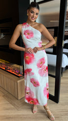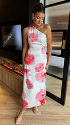 Lisa Cream & Pink Floral Print One Shoulder Open Back Twist Detail Midi Dress