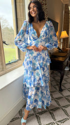 Mariah Blue Floral Tie Back Long Sleeve Tiered Maxi Dress