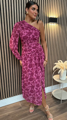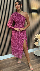 Be your own flower power with Parker's Purple Floral One Shoulder Ruched Midi Dress 🌸 Featuring an asymmetrical neck, gathered bust and waist, and flirty front split, this dress will have you feeling feminine and fierce!