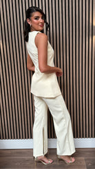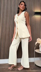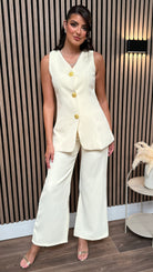 The Pia Lemon Longline Waistcoat & Trouser Co-Ord boasts a luxurious and on-trend colour, accented with elegant gold buttons. The waistcoat features split details for added flair, while the trouser features a straight leg design, combining sophistication with a touch of edge.