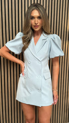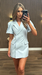 Introducing the Roxie Blue Mini Blazer Dress - an absolute must-have with its playful cut-out detail on the back and short puff sleeves. The perfect mix of chic and quirky, this dress will surely make a statement.