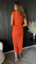 Introducing the Sarah Ruched High Neck Midi Dress. With delicate ruching and seaming, this plisse dress creates a flattering silhouette and exudes sophistication. The unique texture adds a touch of elegance, making it perfect for any occasion. Elevate your wardrobe with this luxurious orange dress.