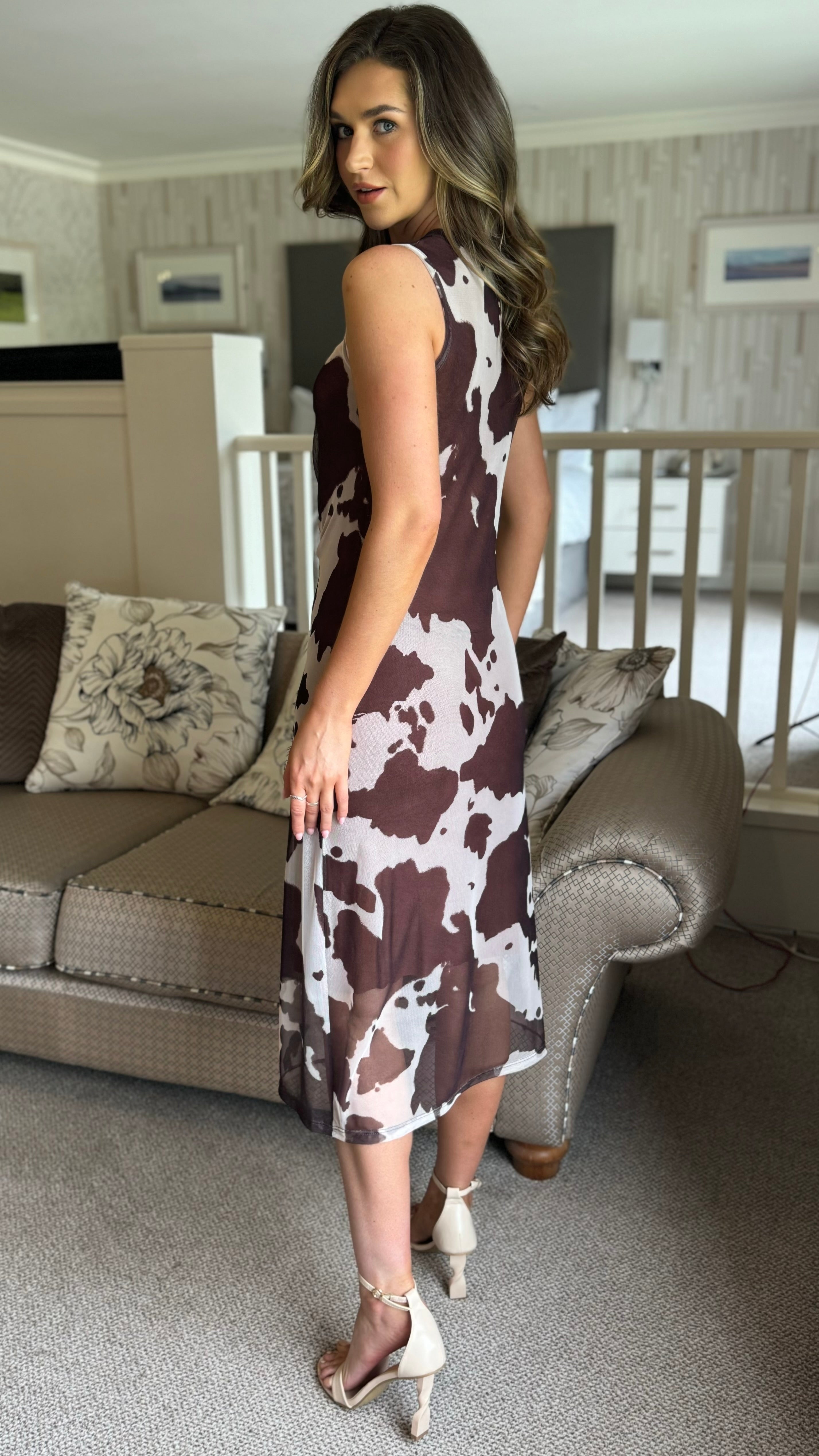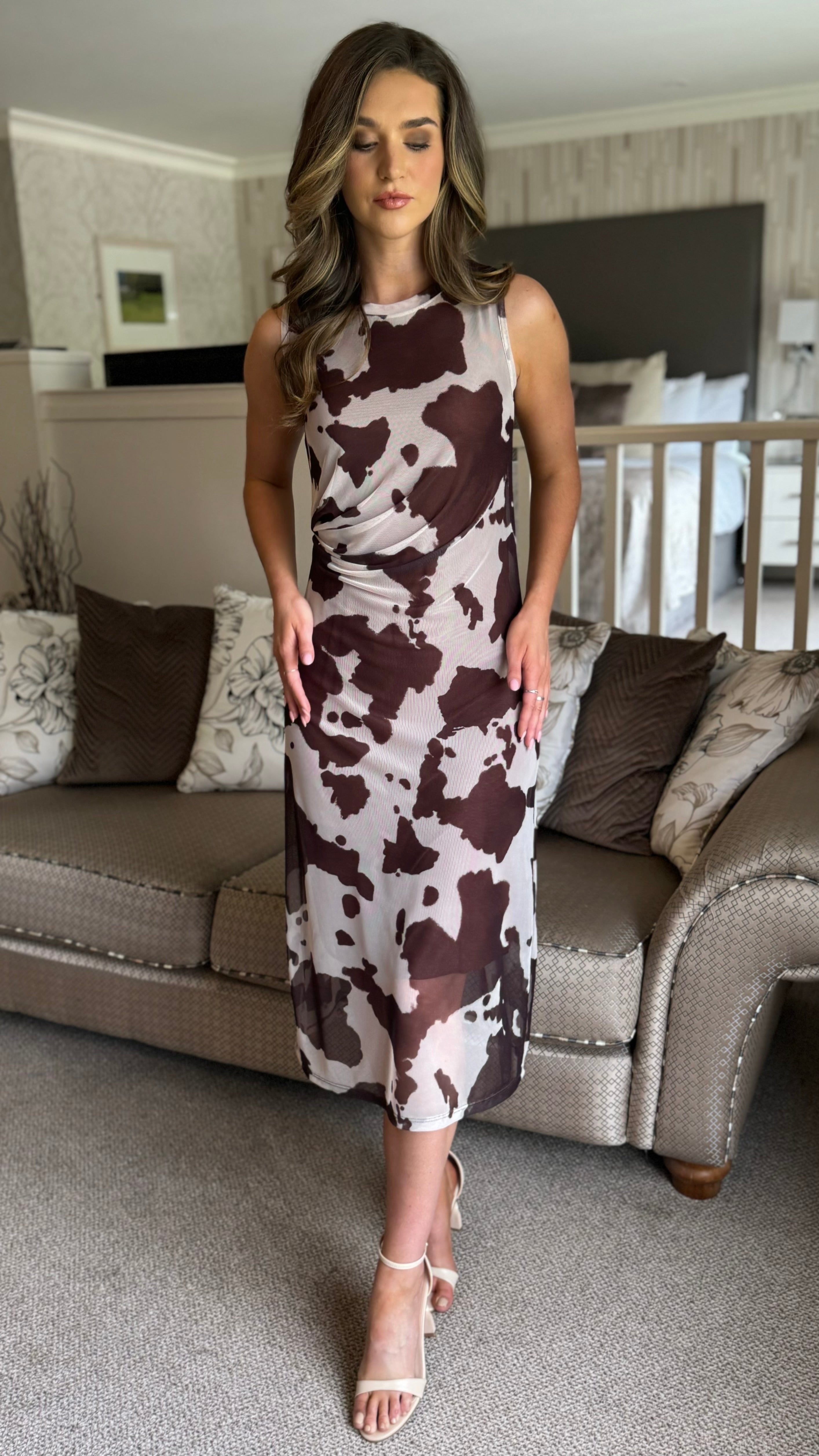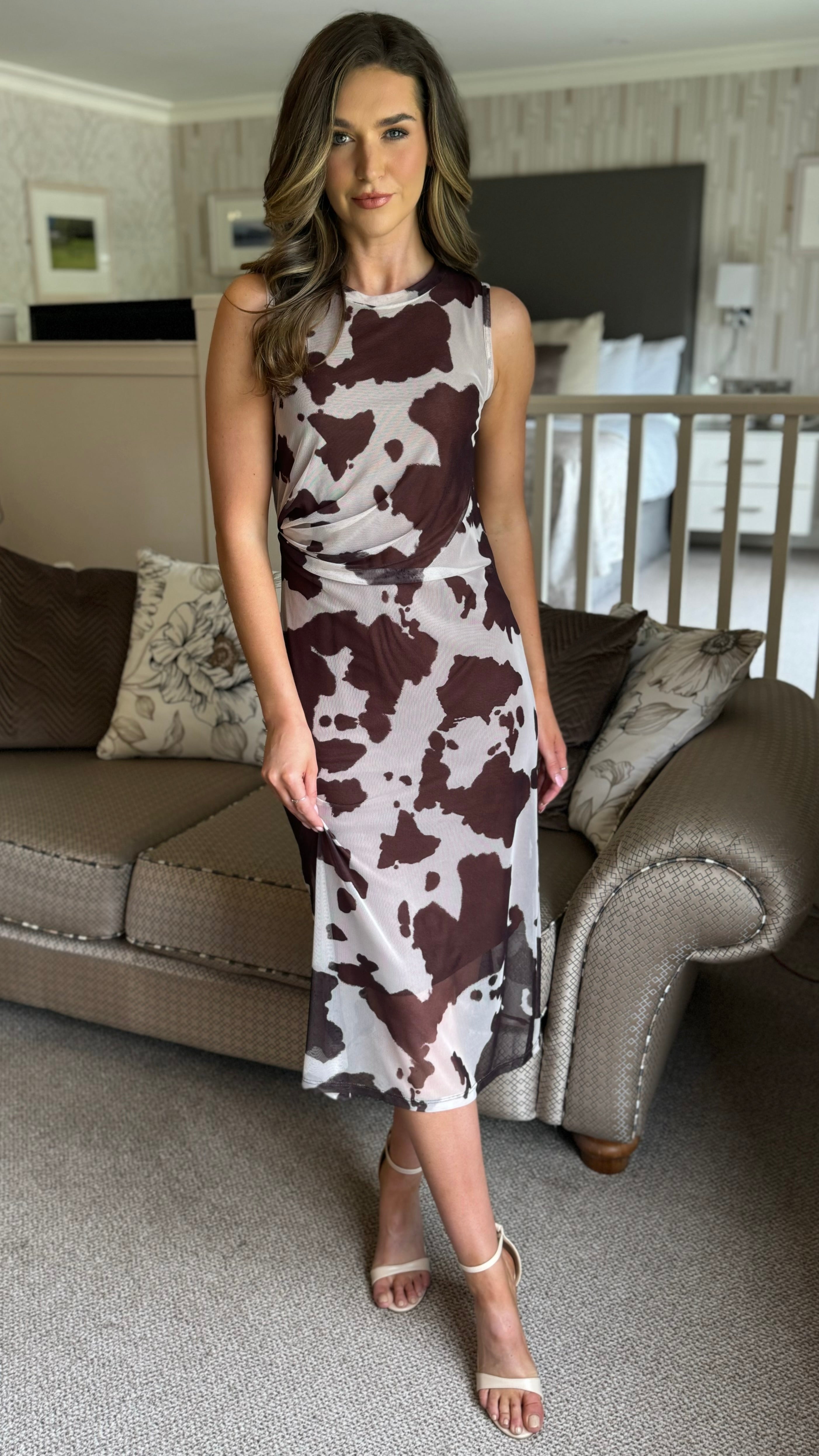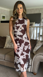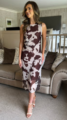 Tamira Cream and Brown Abstract Print Ruched Detail Sleeveless Midi Dress