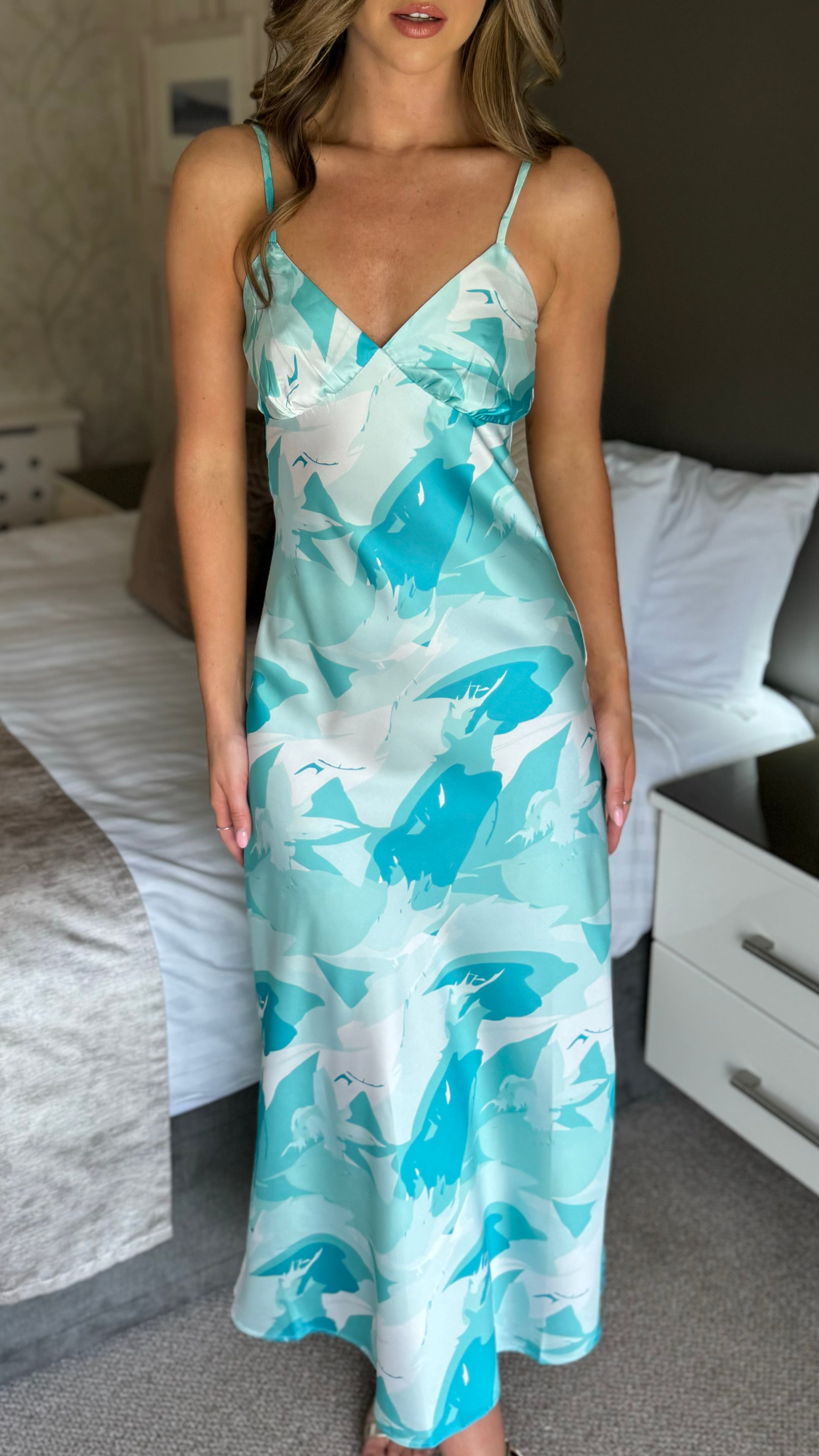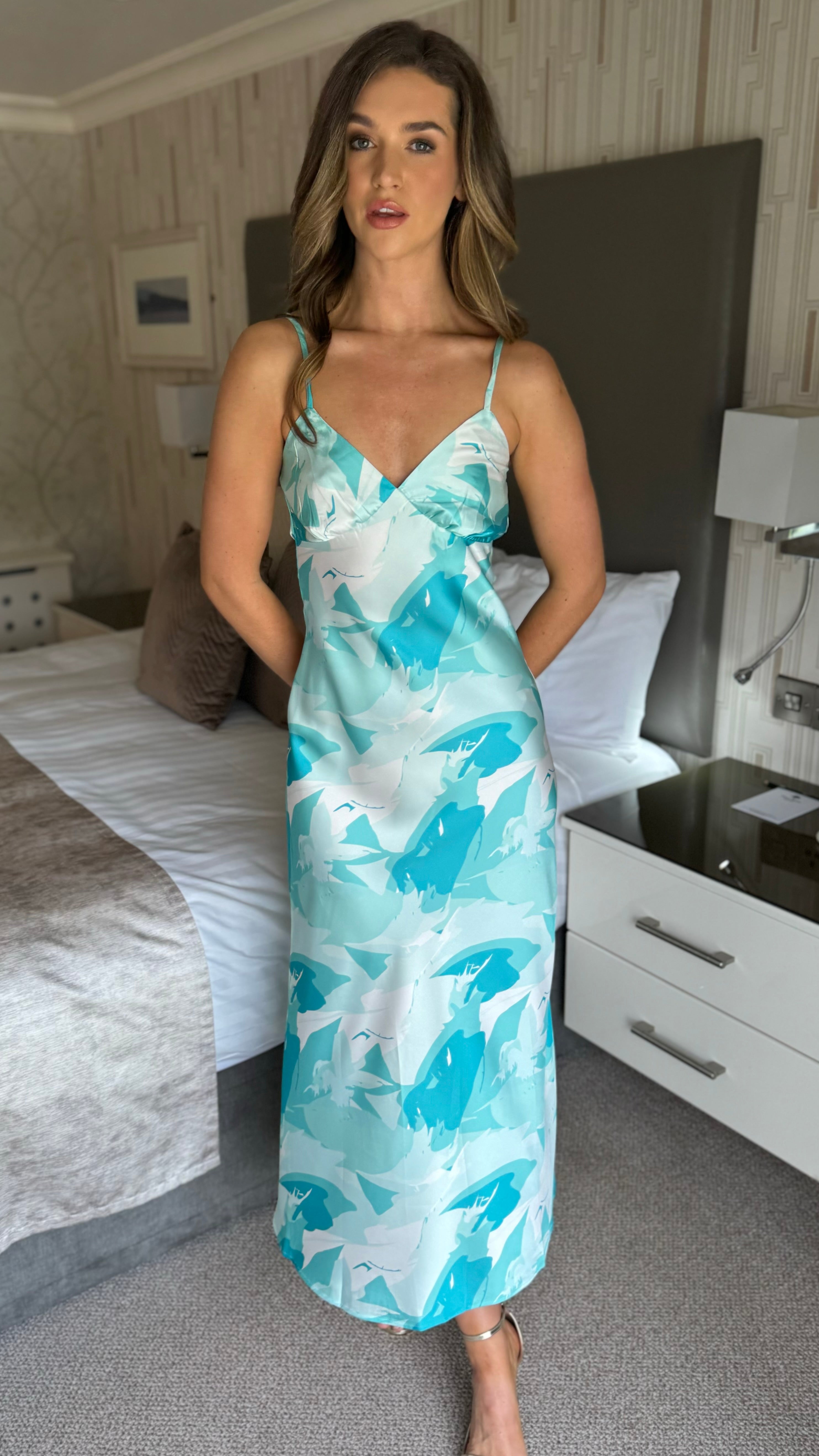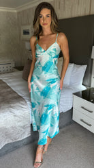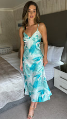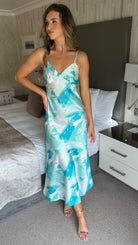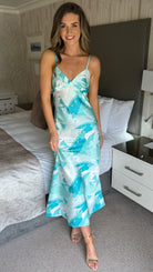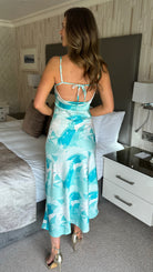 Una Green Sweetheart Cami Strap Printed Satin Midi Dress