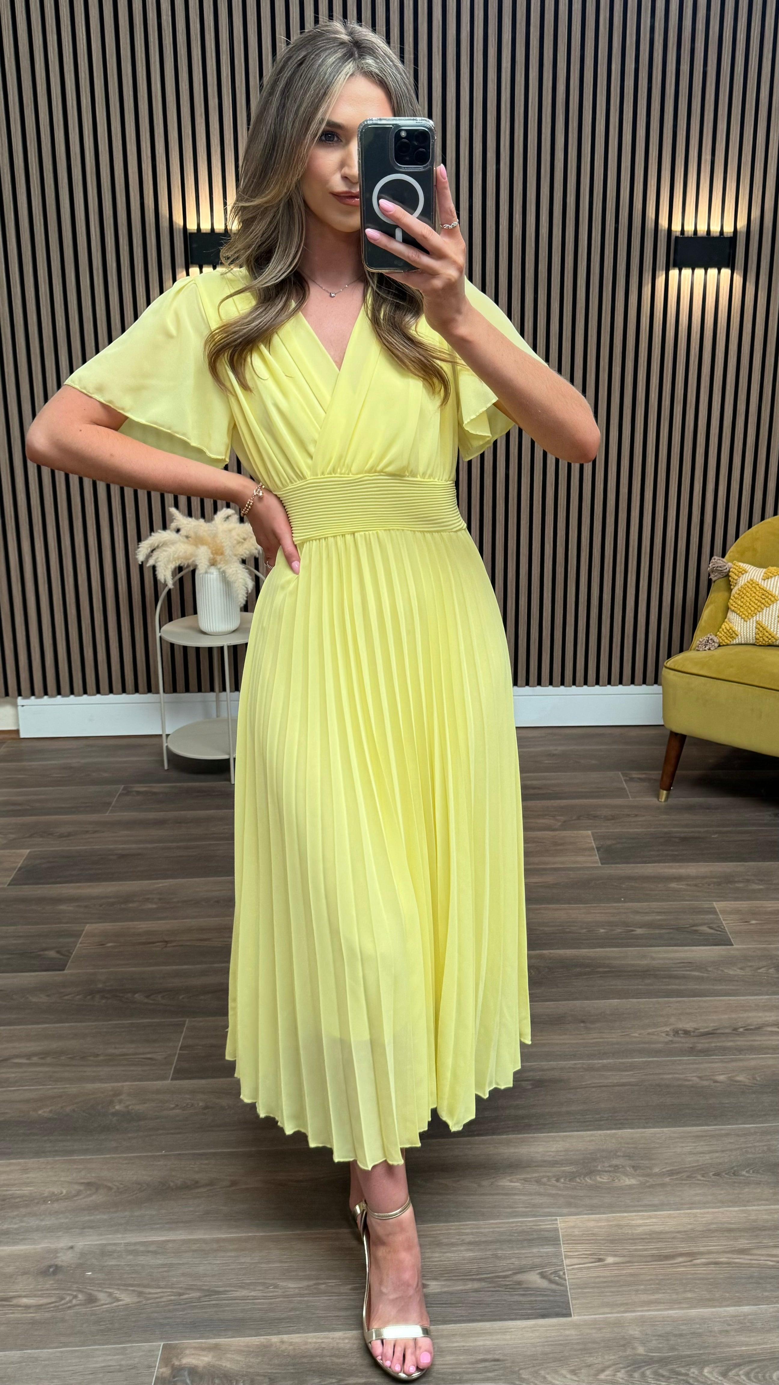 Get ready to make a statement in our Wavery Yellow Pleated V Neck Midi Dress. Featuring a unique pleated design and a playful v neck, this dress will add a touch of quirkiness to your wardrobe. Perfect for any occasion, this dress will have you feeling confident and stylish!