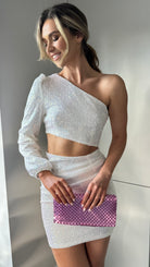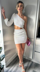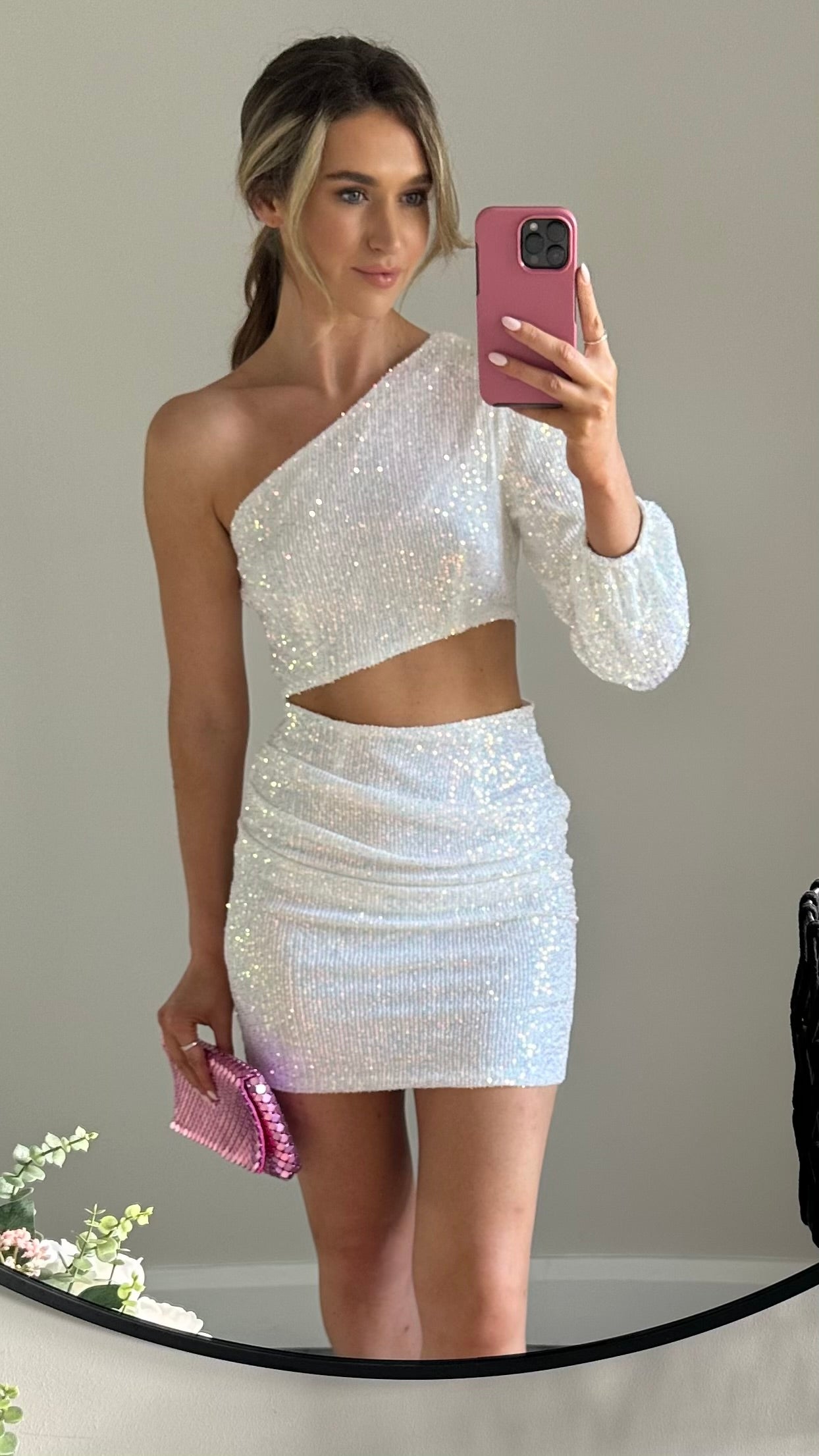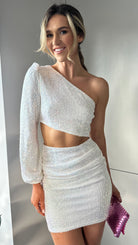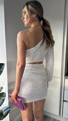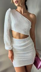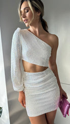 Harriet White Sequin One Sleeve Cut Out Mini Dress