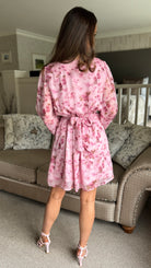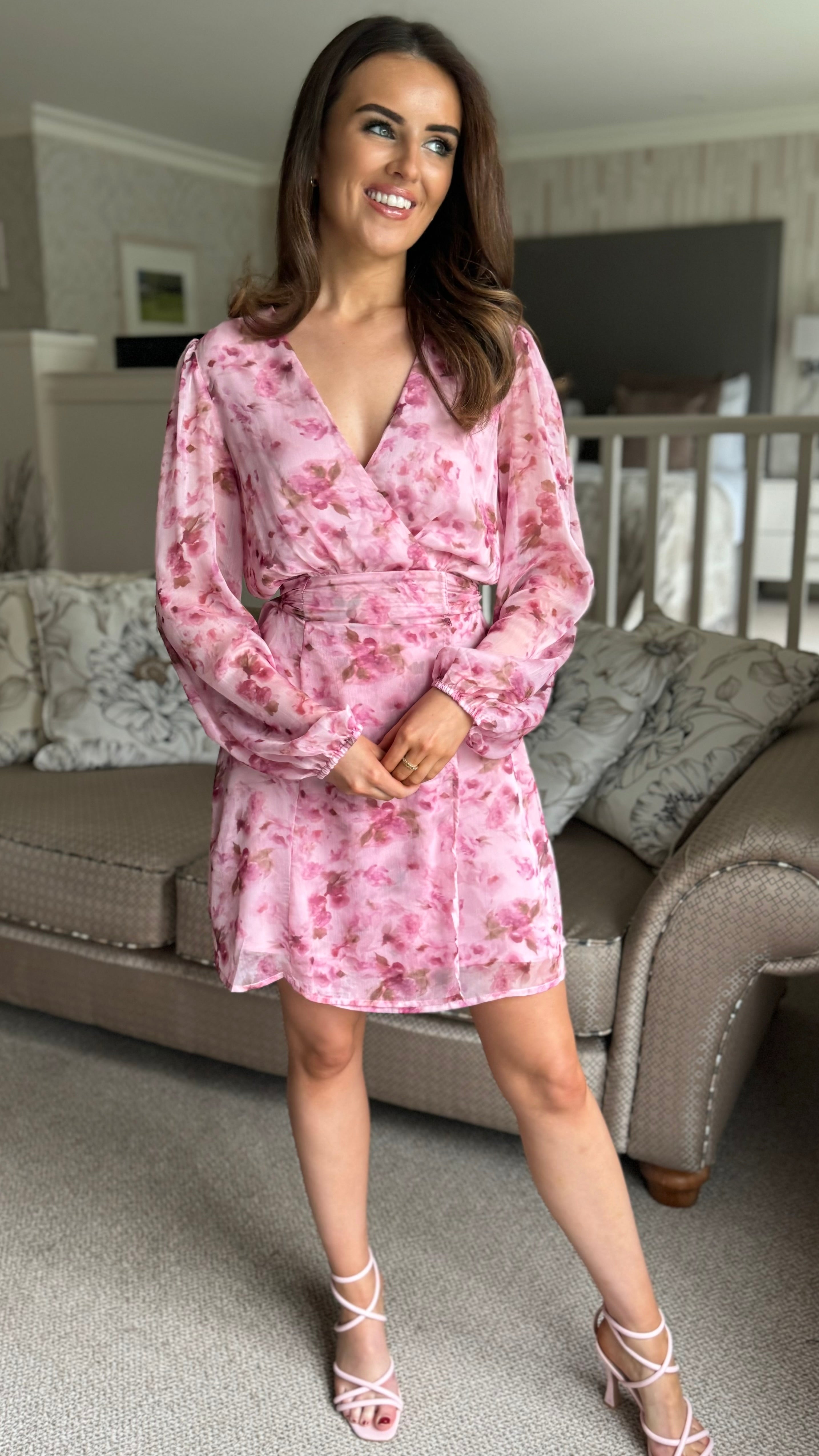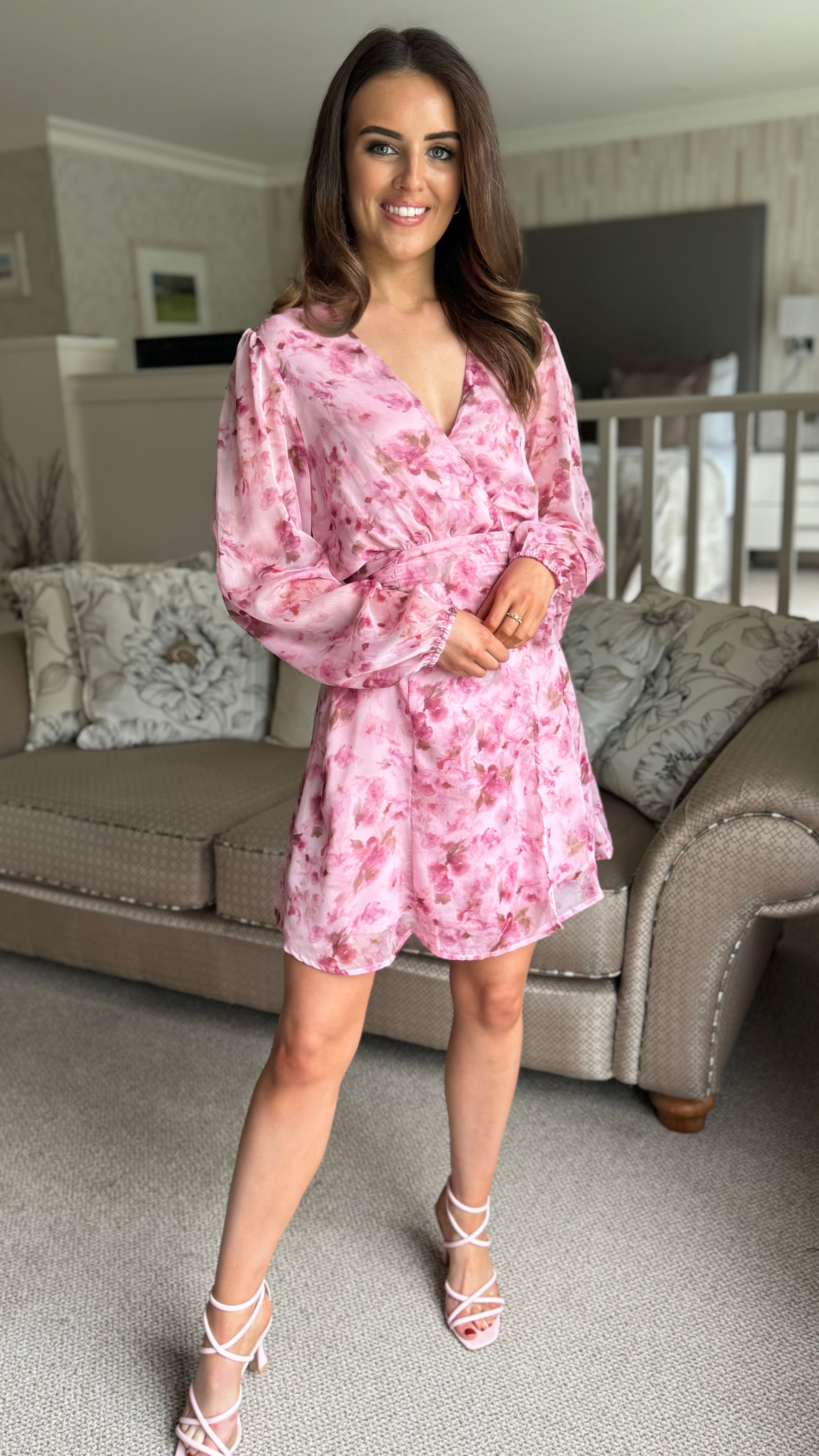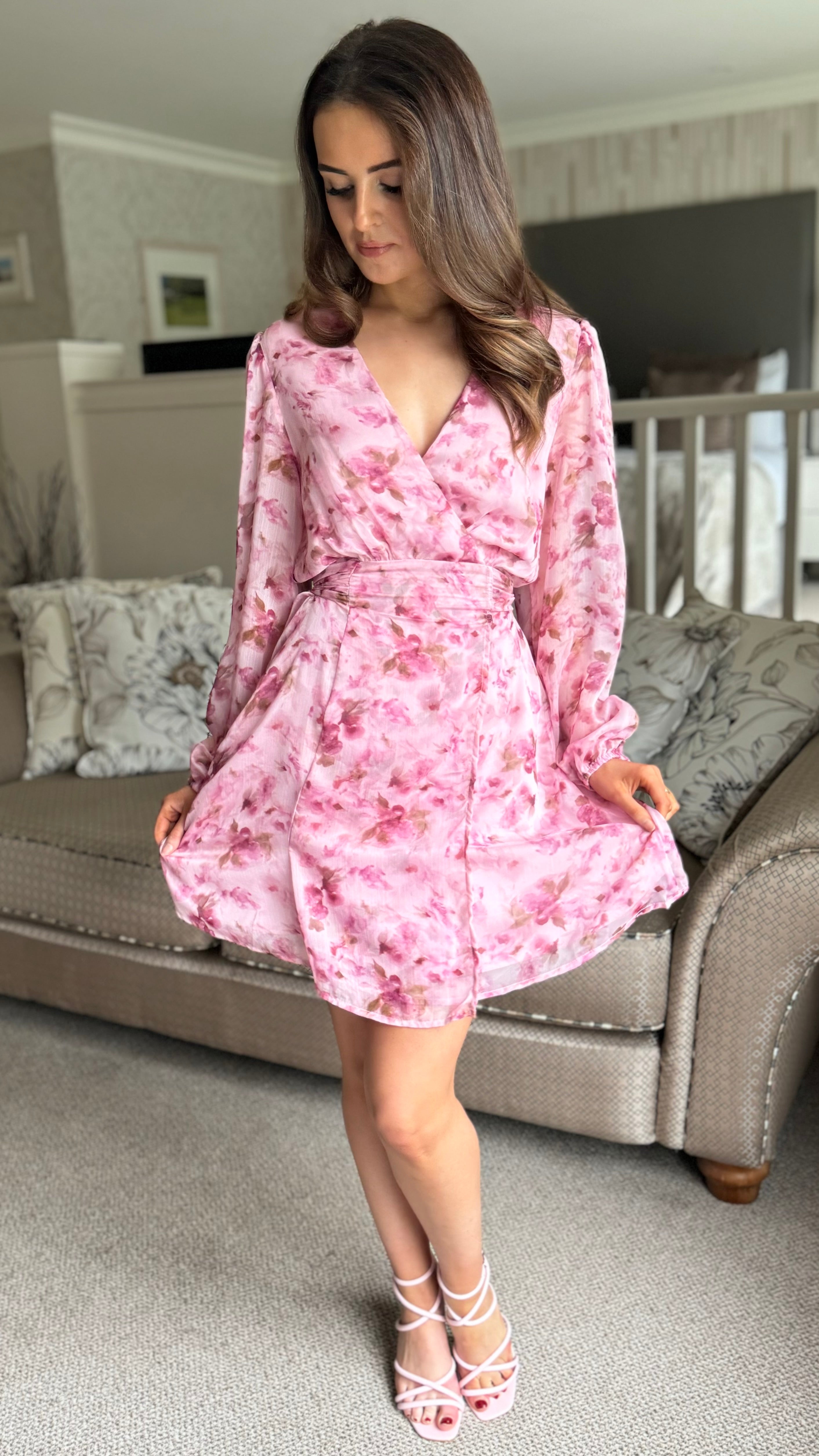 Esther Pink Floral V Neck Long Sleeve Mini Dress