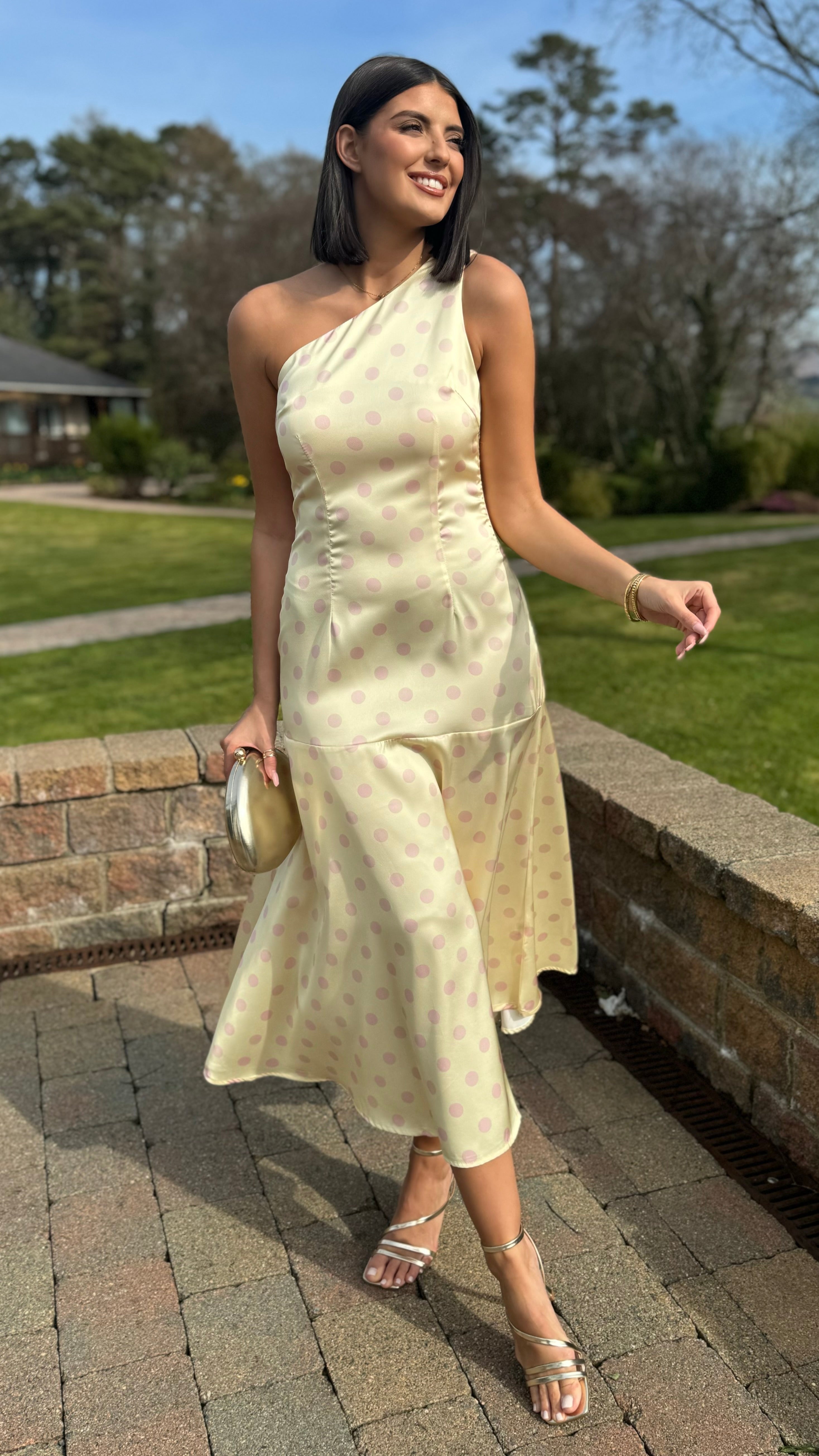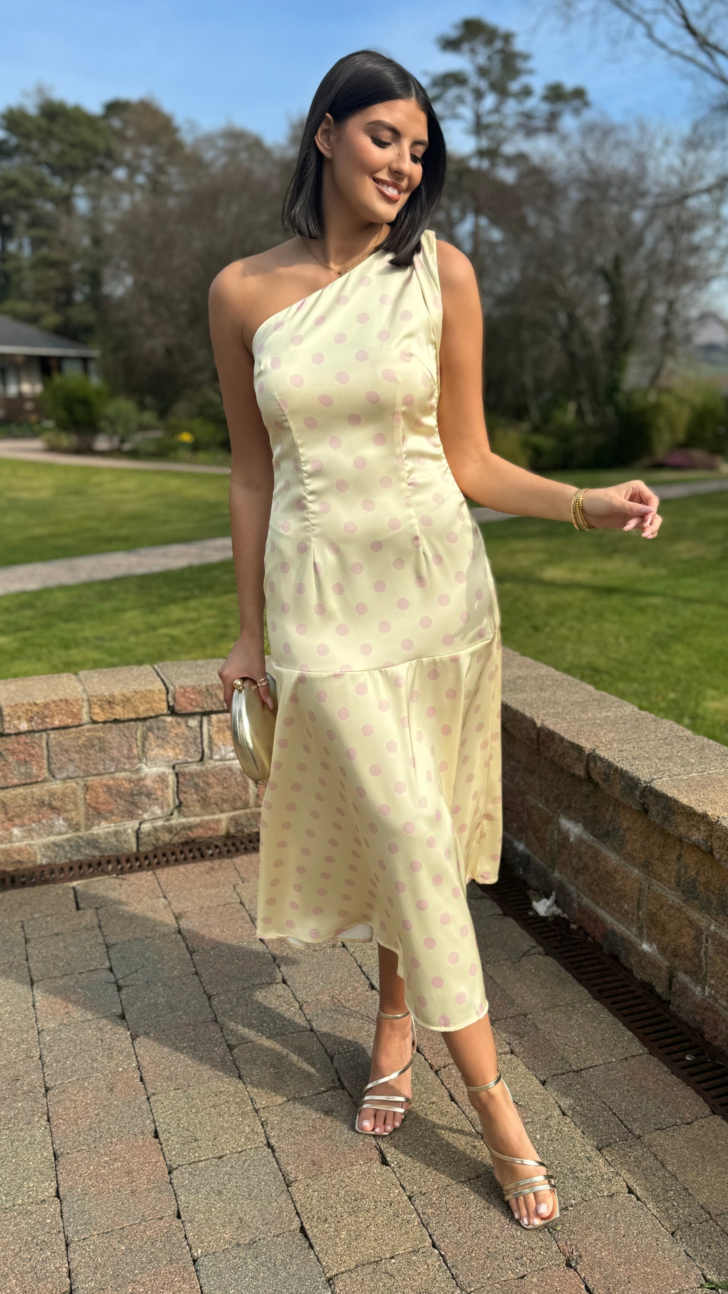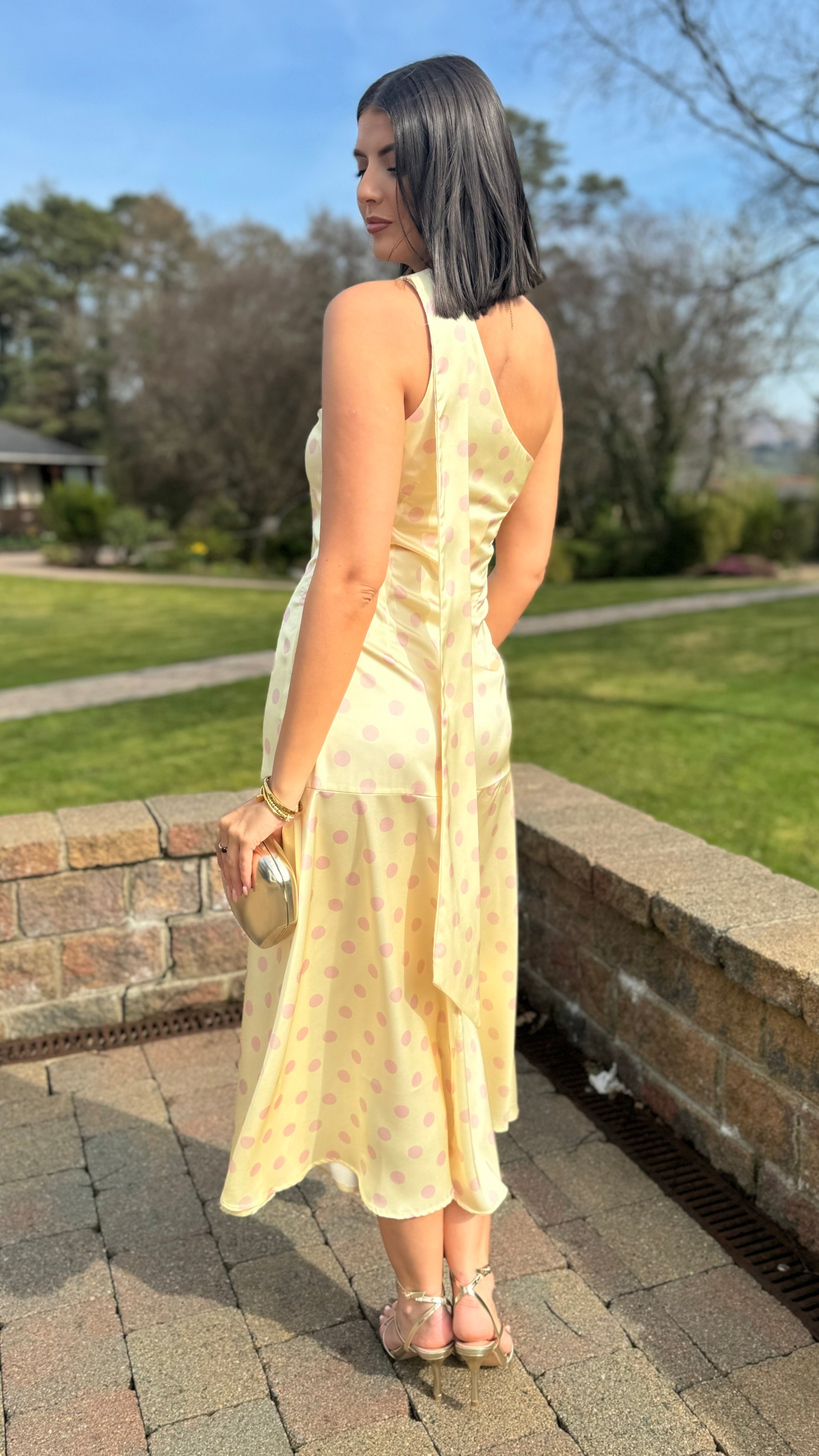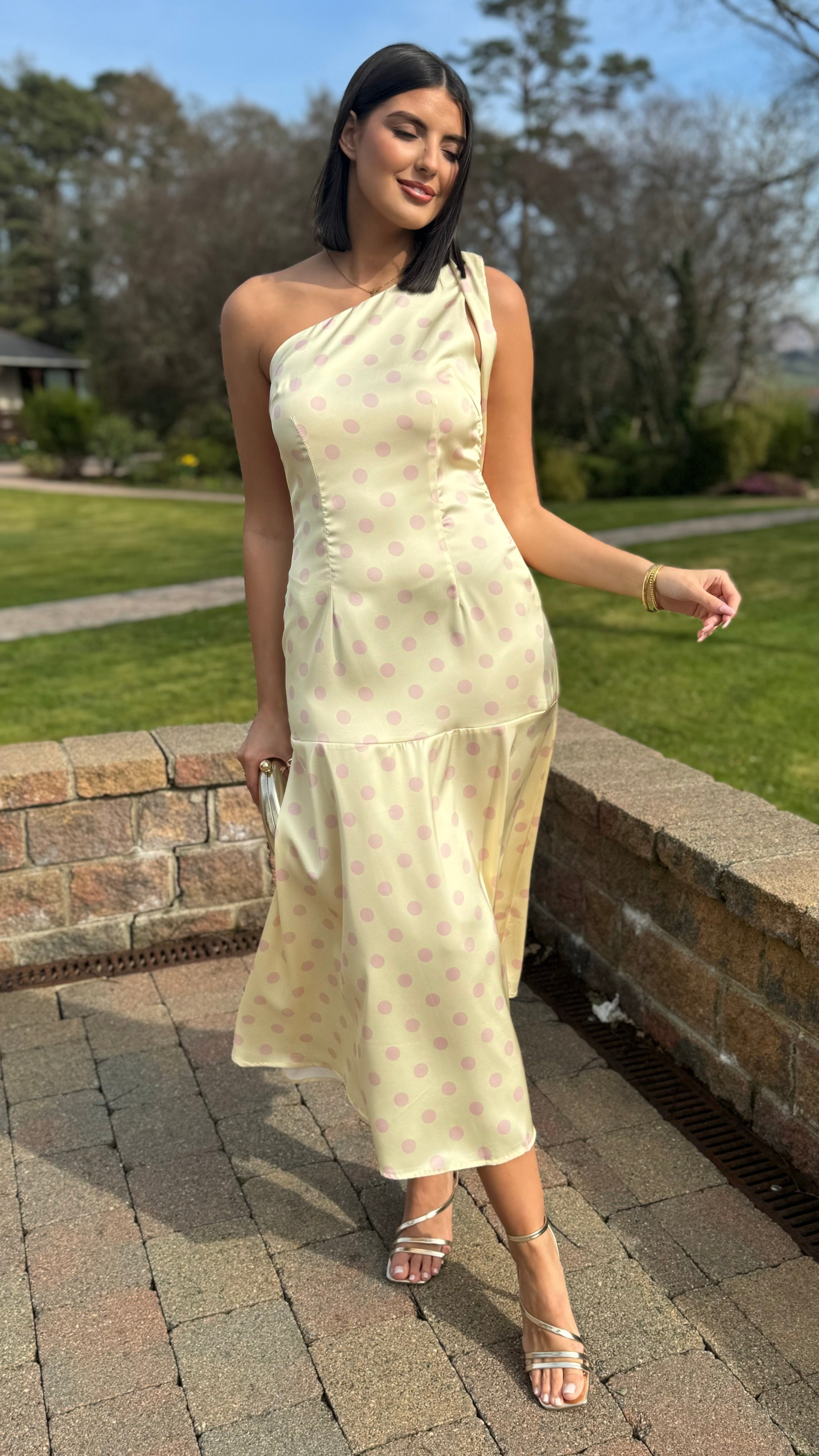 Ainslee Yellow & Pink Polka Dot Asymmetric Midi Dress