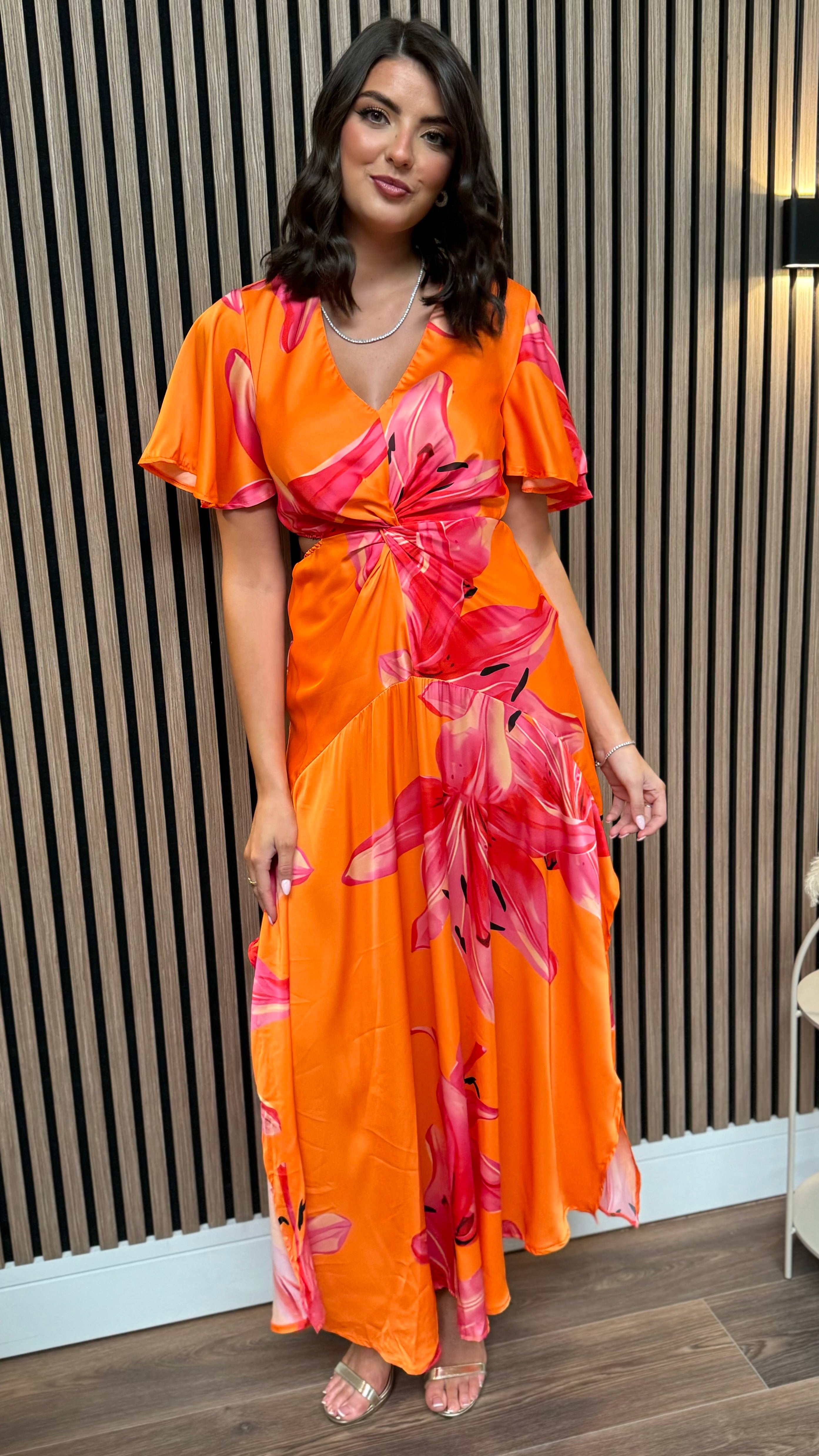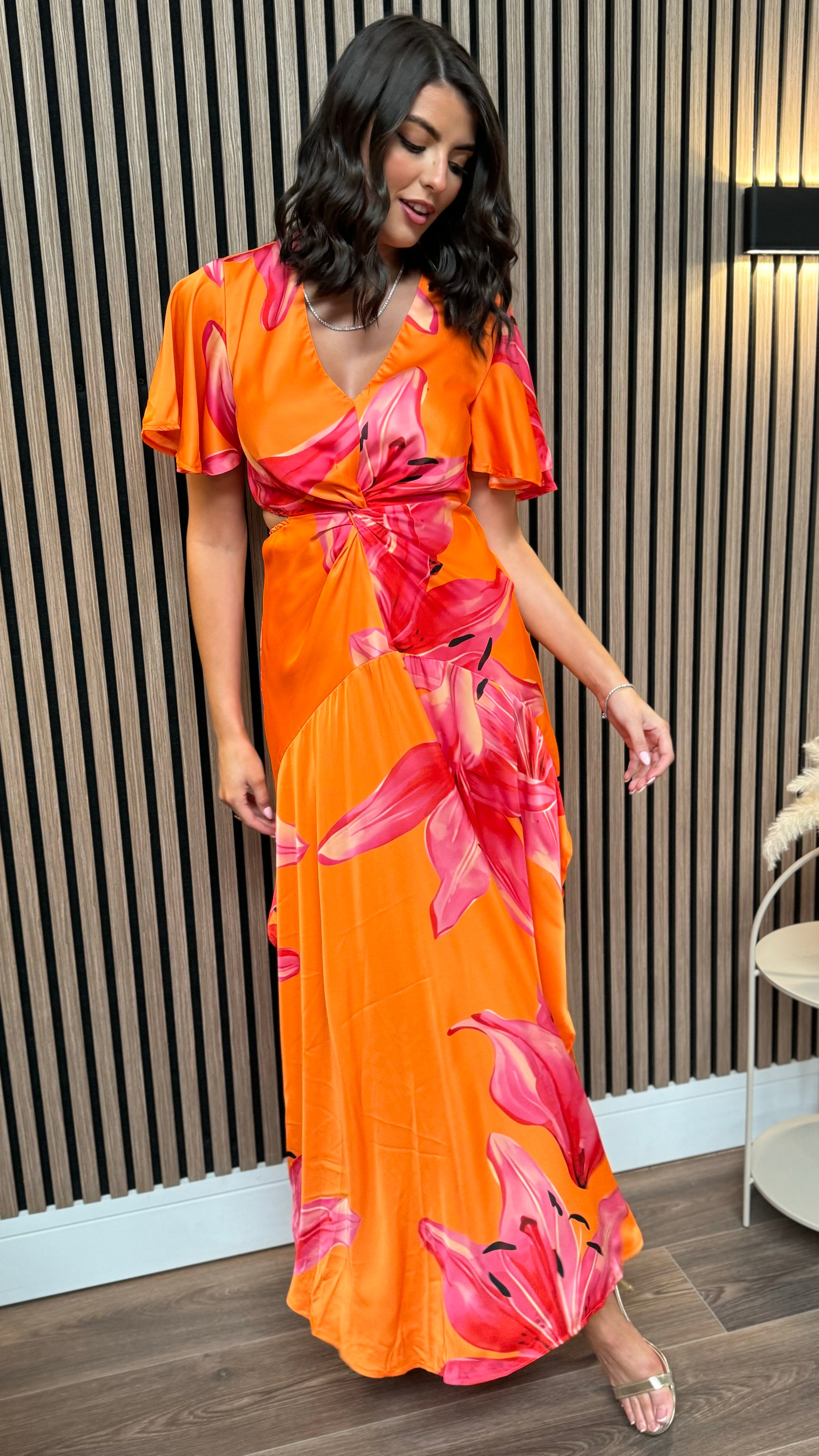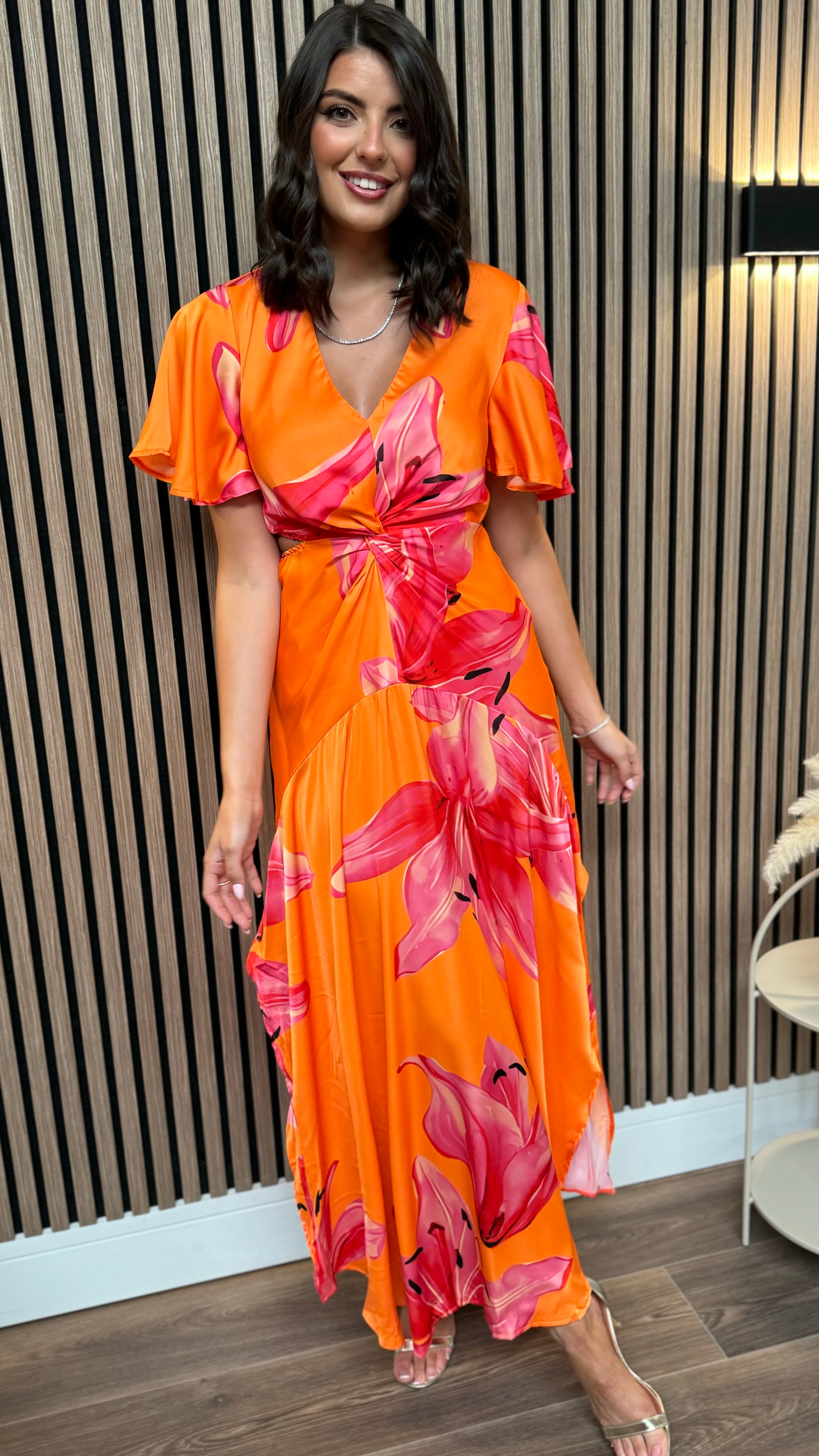 Indulge in luxury with our Alexia Orange & Pink Cut Out Knot Detail Midi Dress. This summer must-have features a vibrant floral print, V neckline, and butterfly sleeves. The front knot waist detail and elasticated waist create a flattering silhouette, while side cut outs and a midi skirt with double side splits add a sultry touch. Perfect for any occasion, pair with sandals or strappy heels to complete the look.