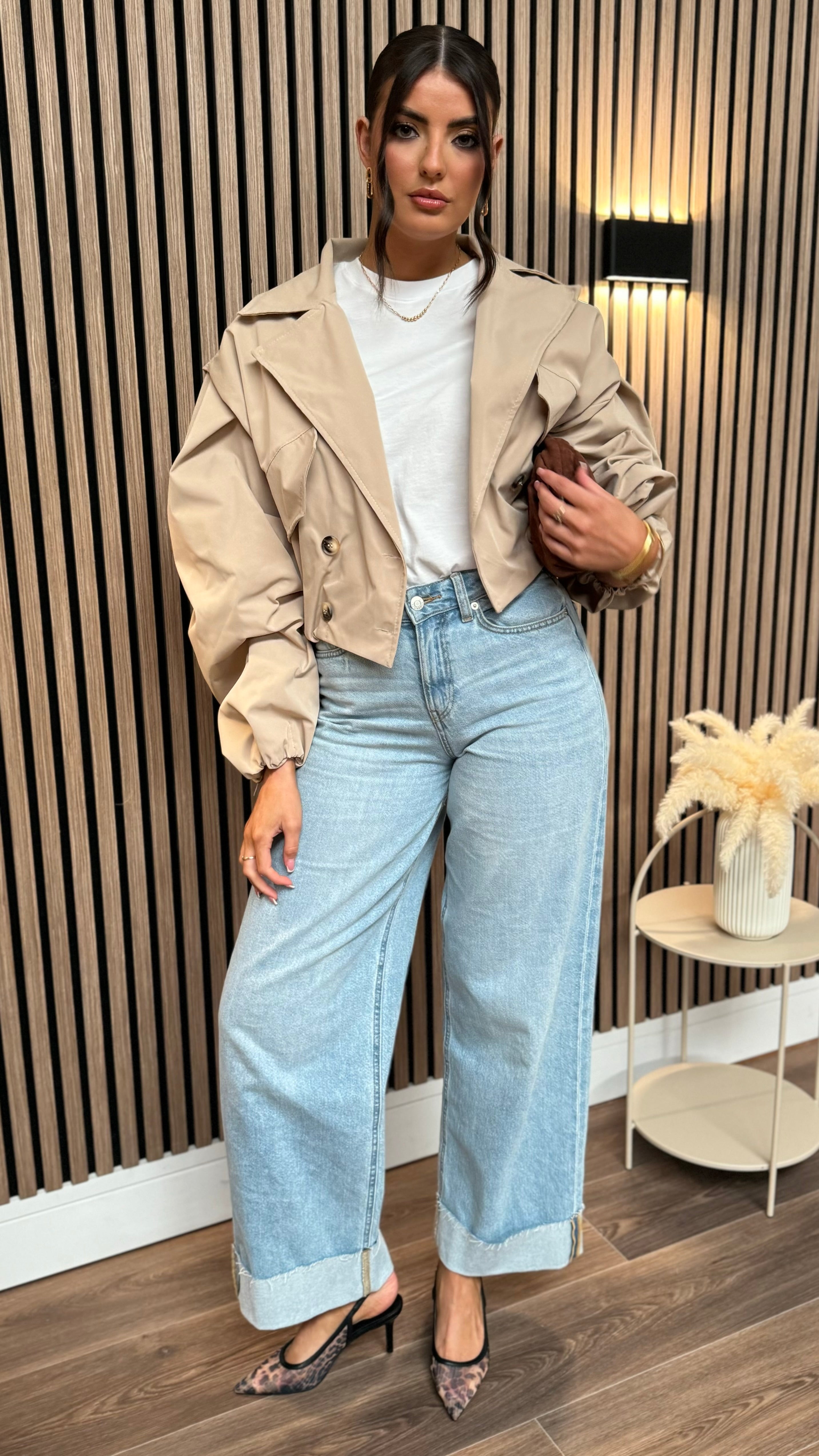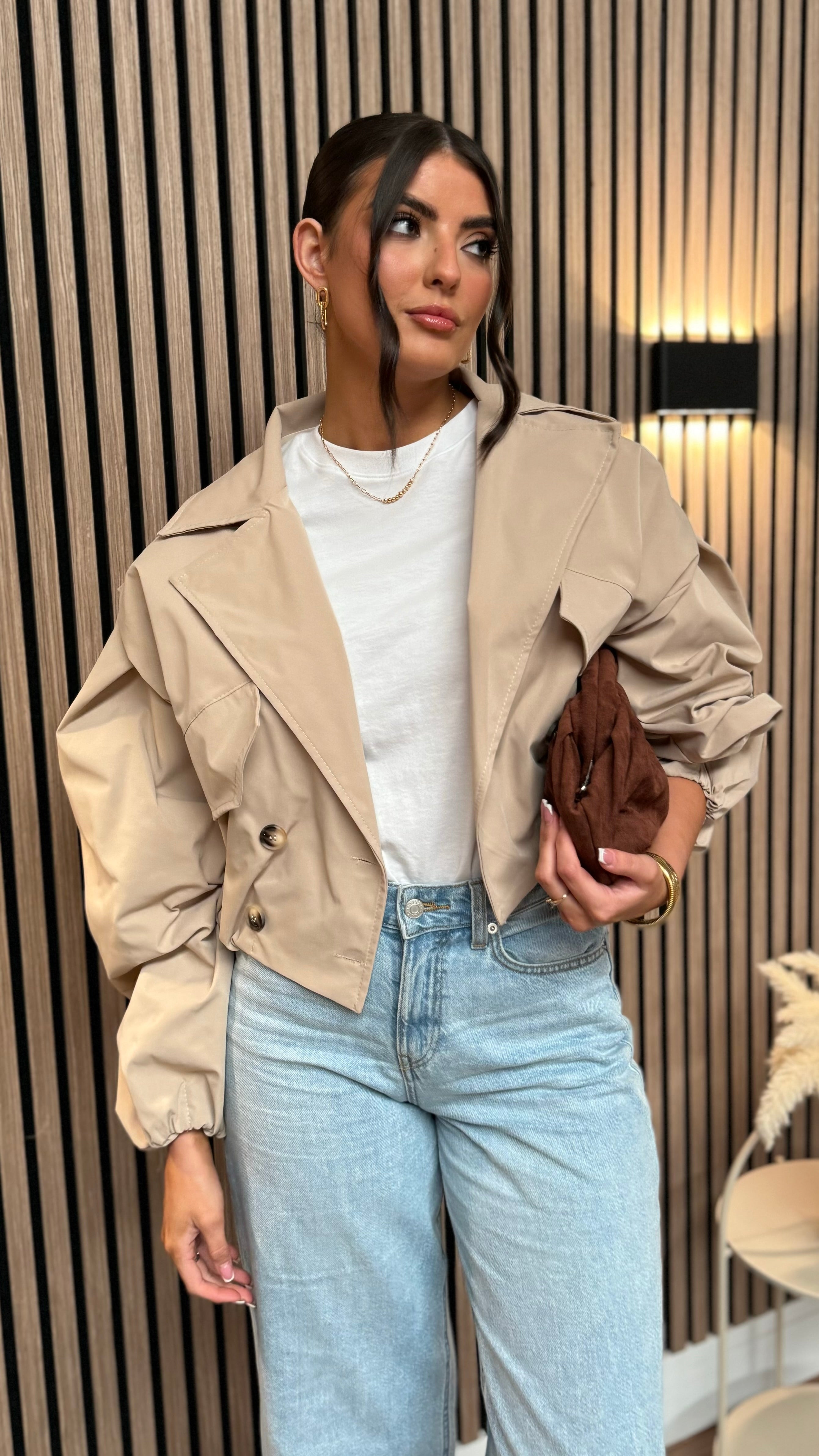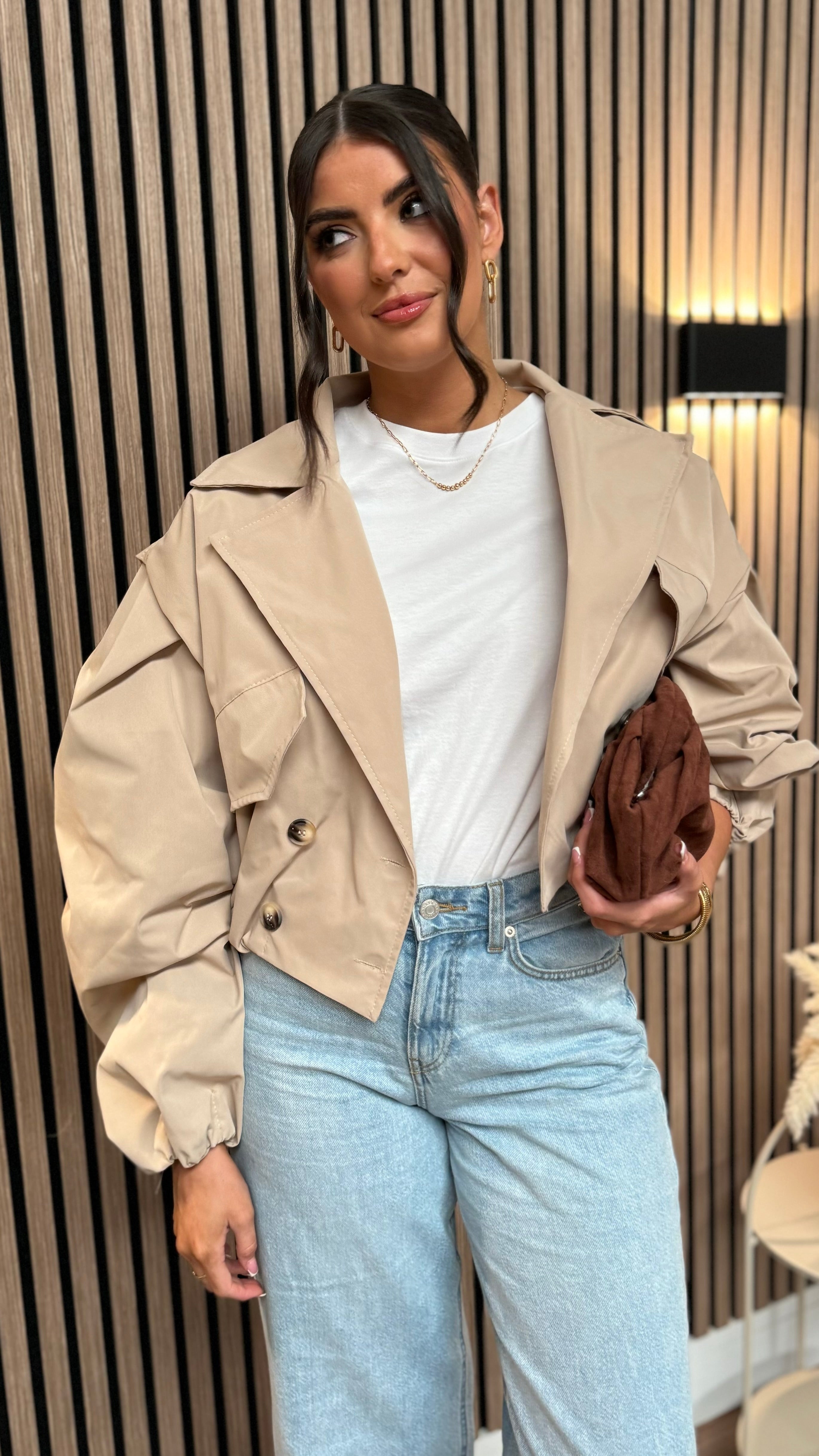 Look chic and playful with the Alyssa Beige Collared Jacket! This stylish jacket features button detailing, wide sleeves, and an elasticated waist and cuffs for a comfortable and flattering fit. Perfect for adding a pop of fun to any outfit. ✨🧥 #FashionForward