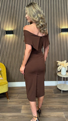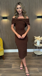 Turn heads with the Avril Chocolate Brown Bow Detail Midi Dress! This playful, off-the-shoulder beauty features a soft scuba crepe fabric that hugs your curves in all the right places. The charming bow design adds a flirty touch, while the back slit and concealed zip fastening make it as practical as it is stylish. Perfect for elevating any occasion with midi-length elegance and a fun twist.