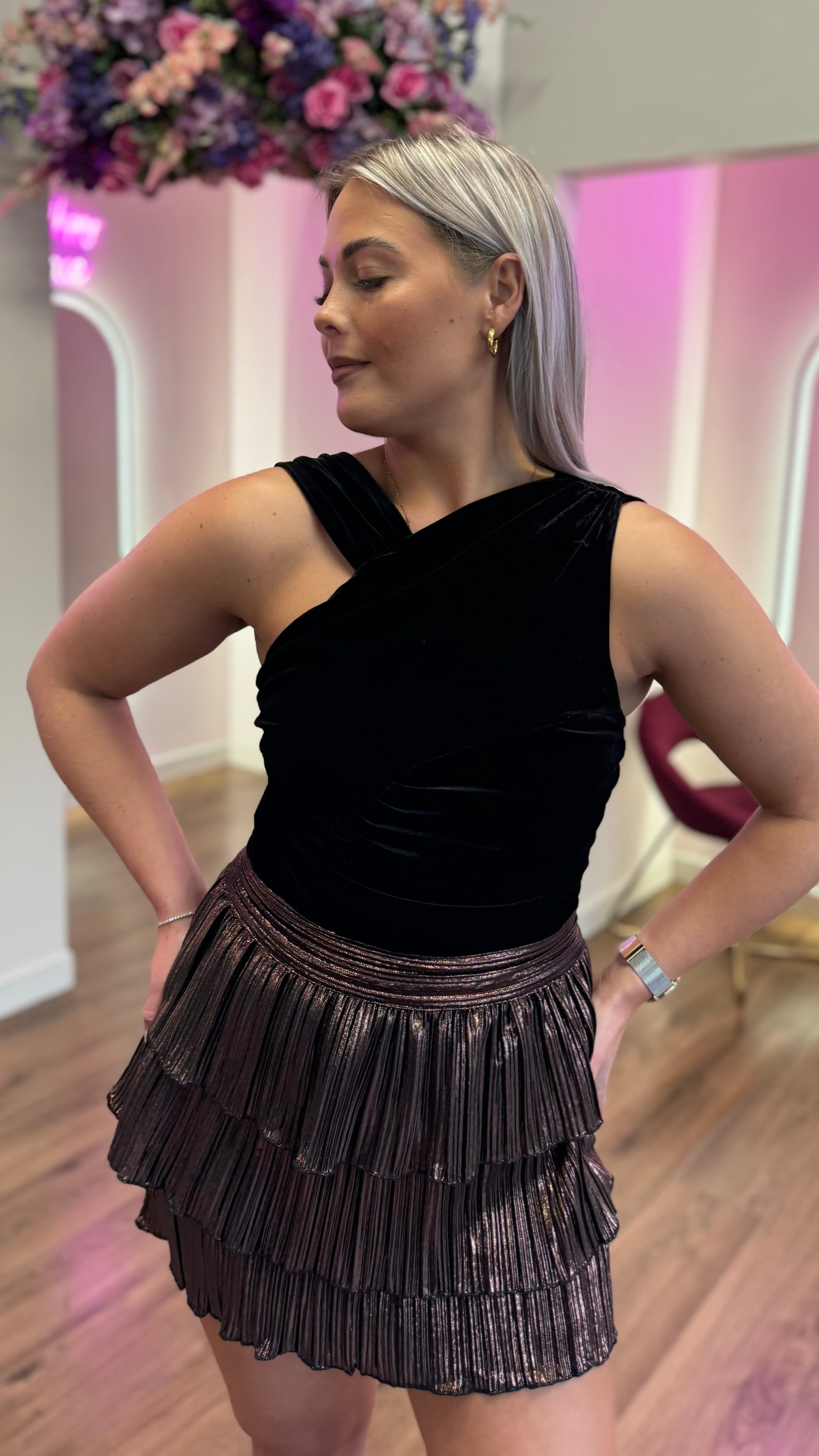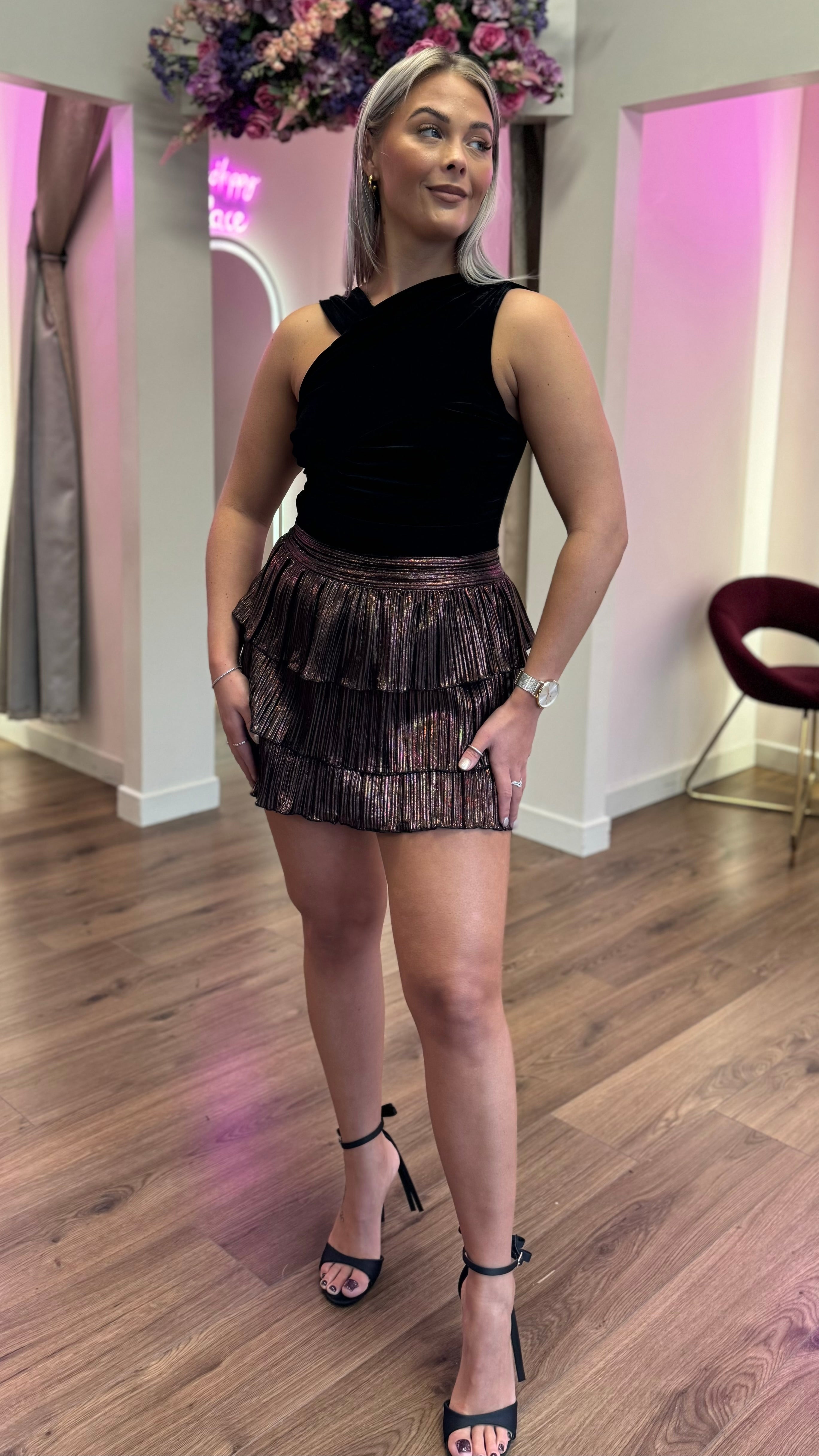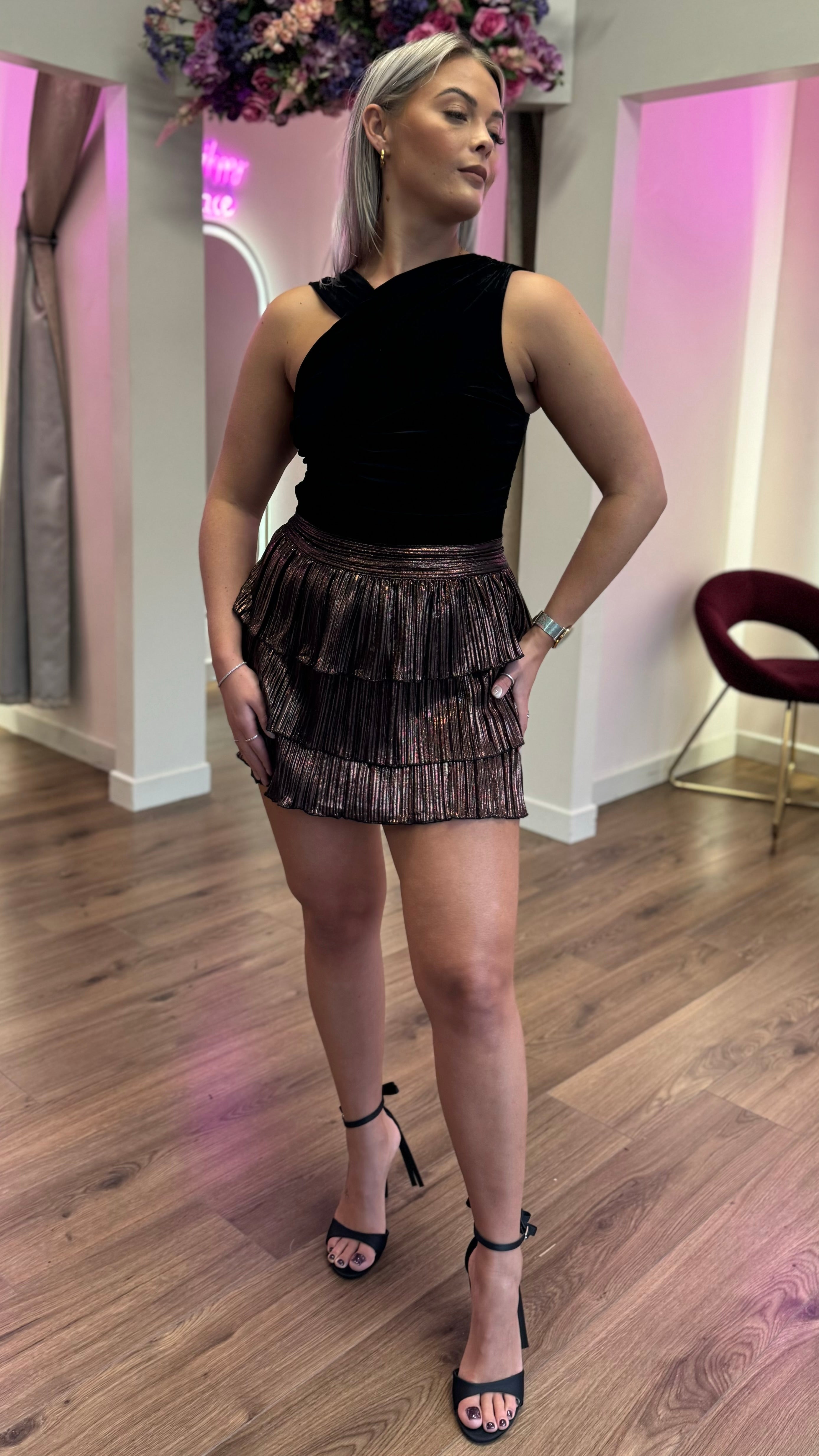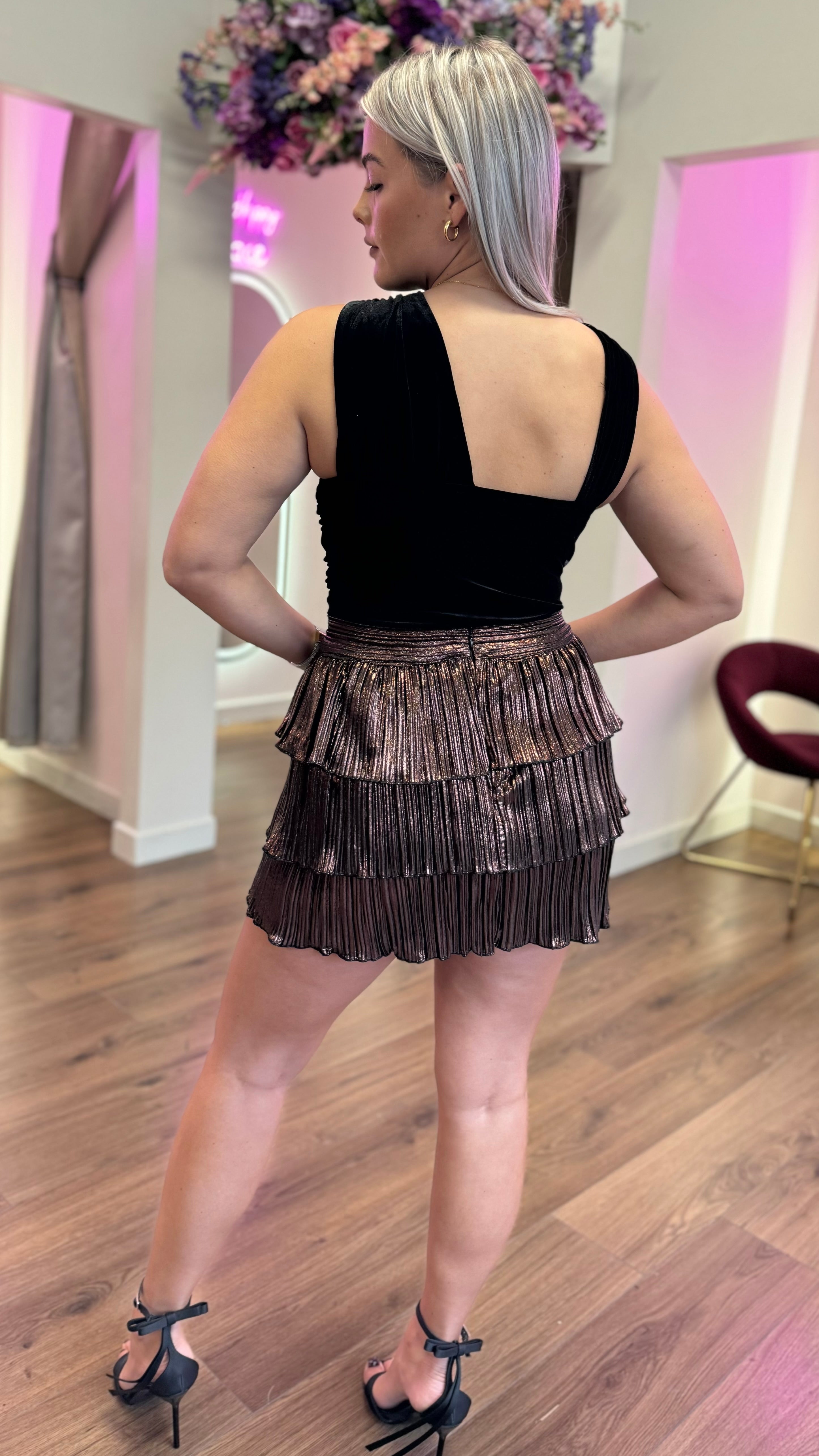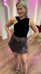 Strut your stuff in this cheeky brown metallic mini that's all about the drama. Tiered layers add serious movement and dimension, while the cinched waist keeps things flattering and fun. Sleek concealed zip means zero fuss—just pure style. Perfect for turning heads at any occasion.