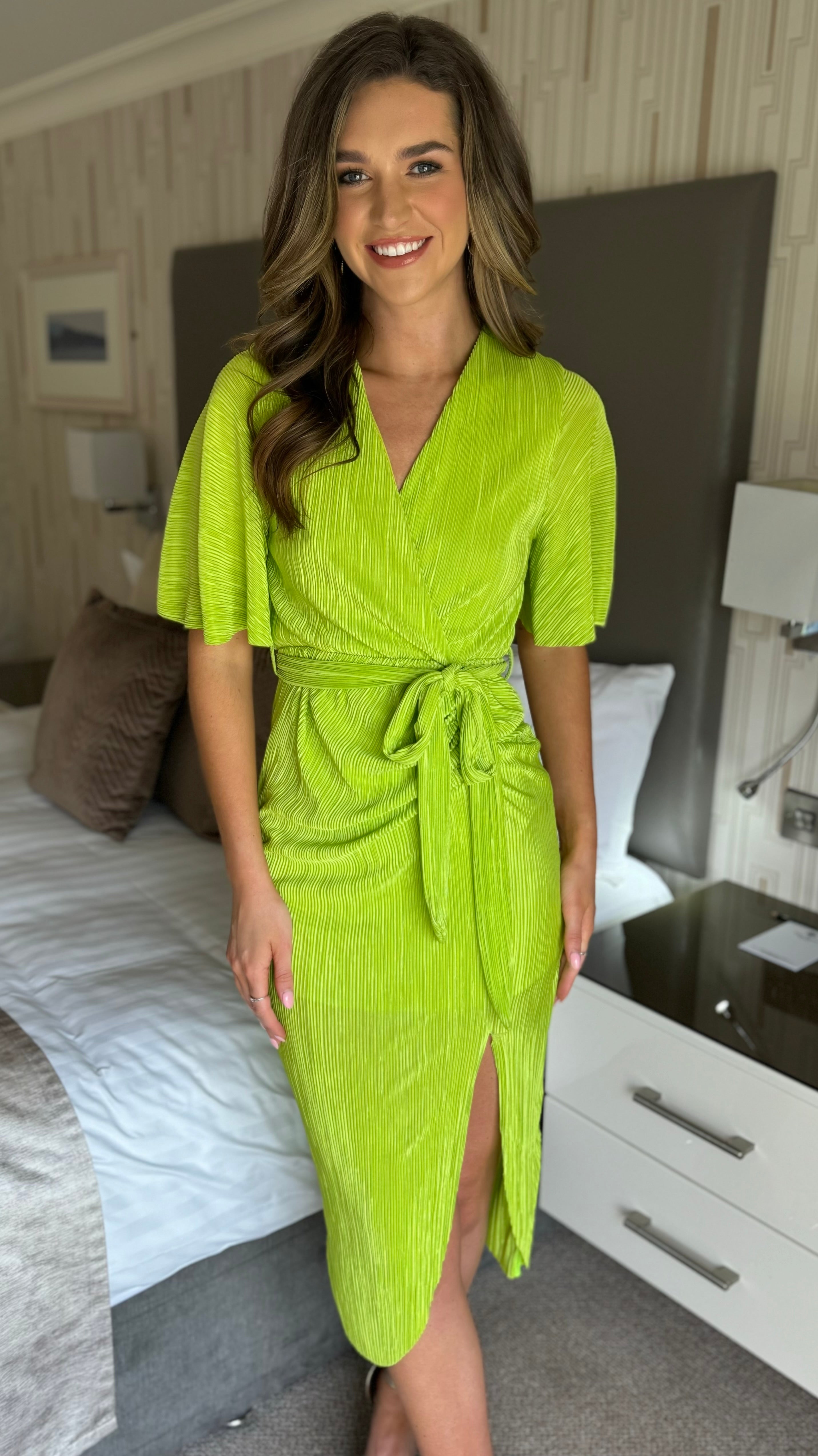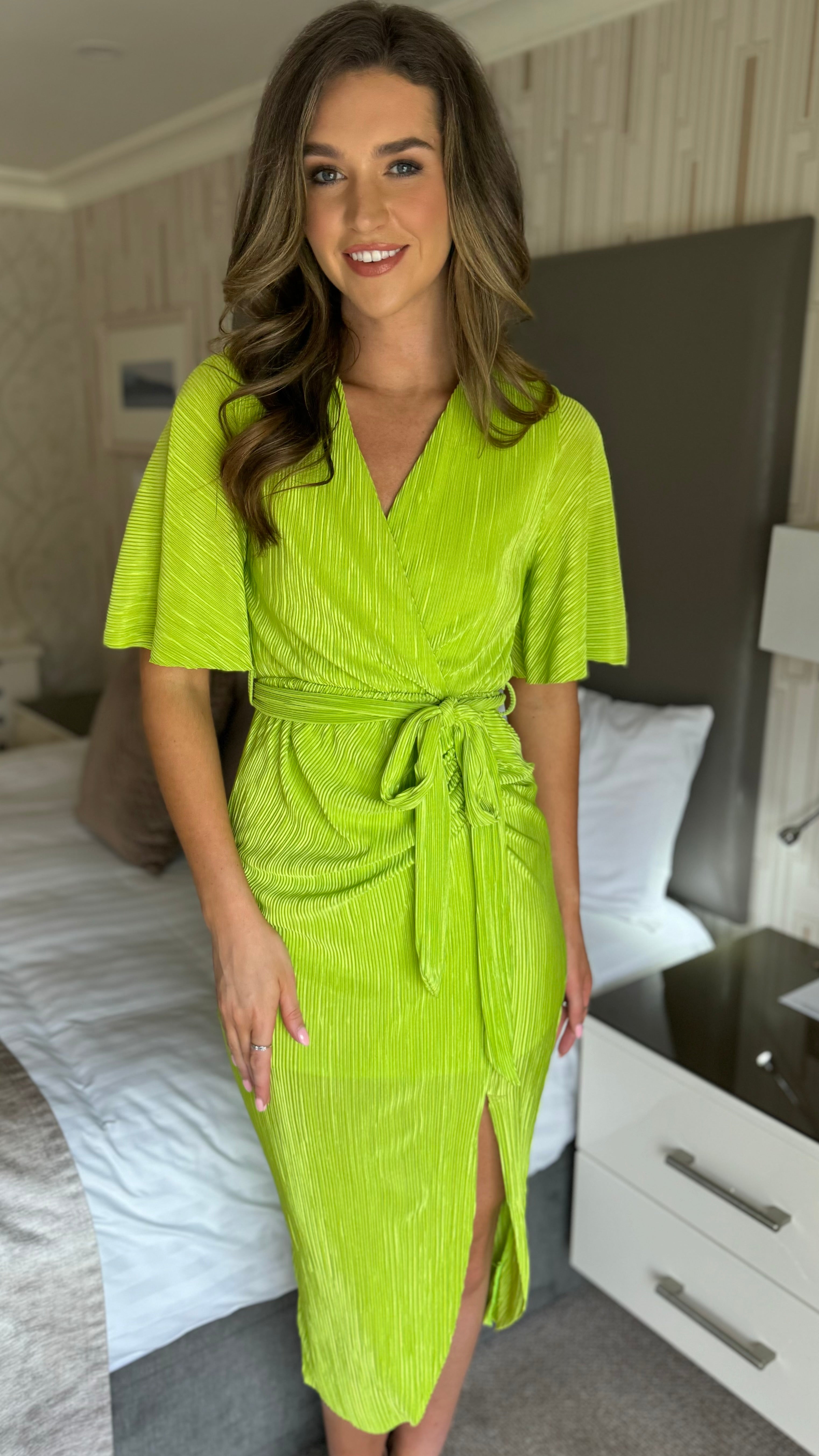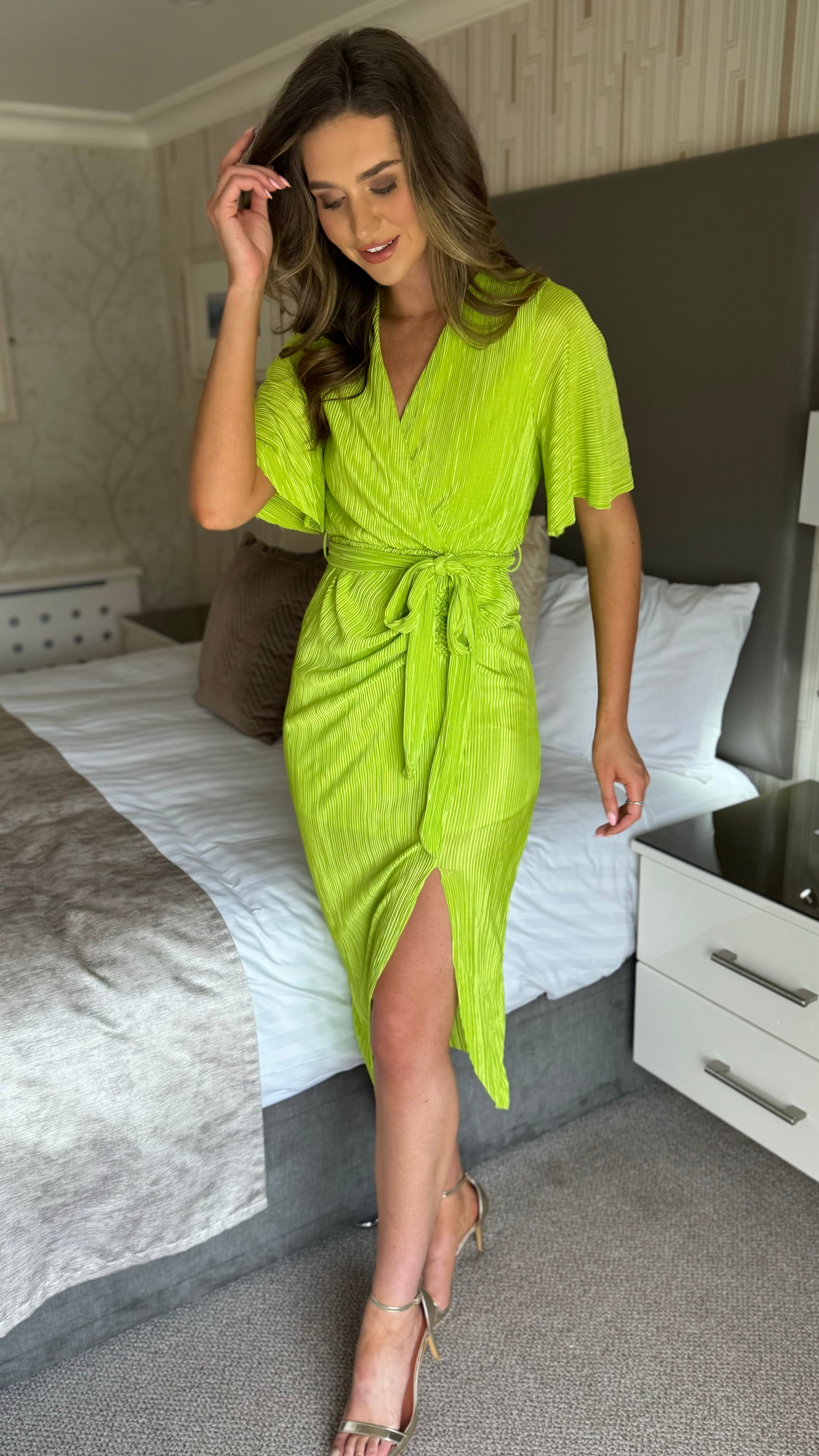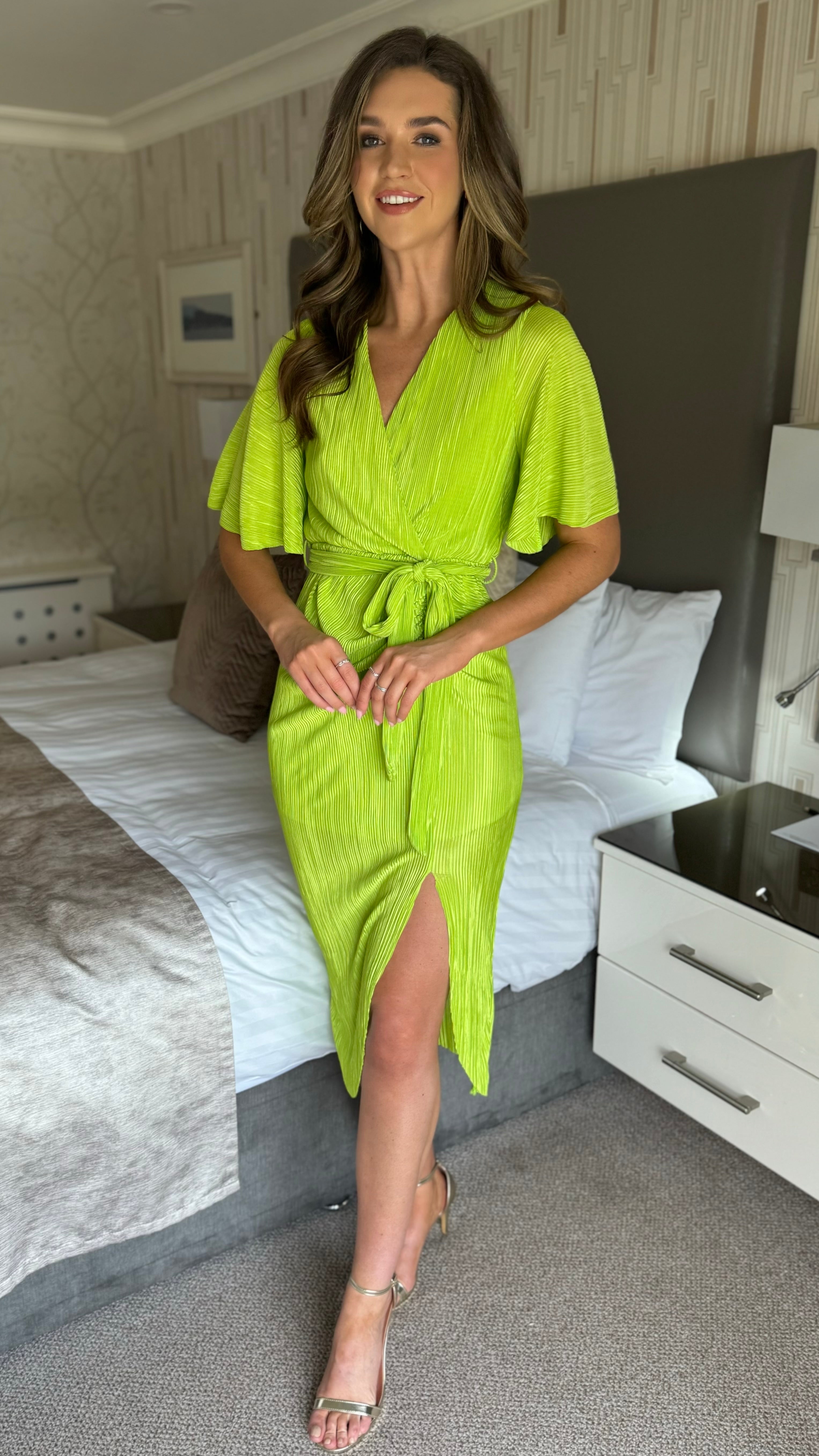 Chrissie Lime Faux Wrap Ruched Midi Dress