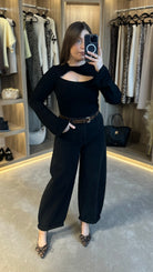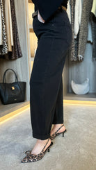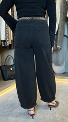 Introducing the Cliona Black Mid-Rise Barrel Jeans – your new go-to for effortless cool. These jeans feature a flattering mid-rise waist paired with a trendy barrel silhouette that's equal parts comfy and chic. The cuffed hems add a playful finishing touch, while practical front and back pockets keep your essentials close. Zip and fly fastening ensures a secure fit every time. Perfect for dressing up or down, these versatile jeans are about to become your wardrobe favourite.