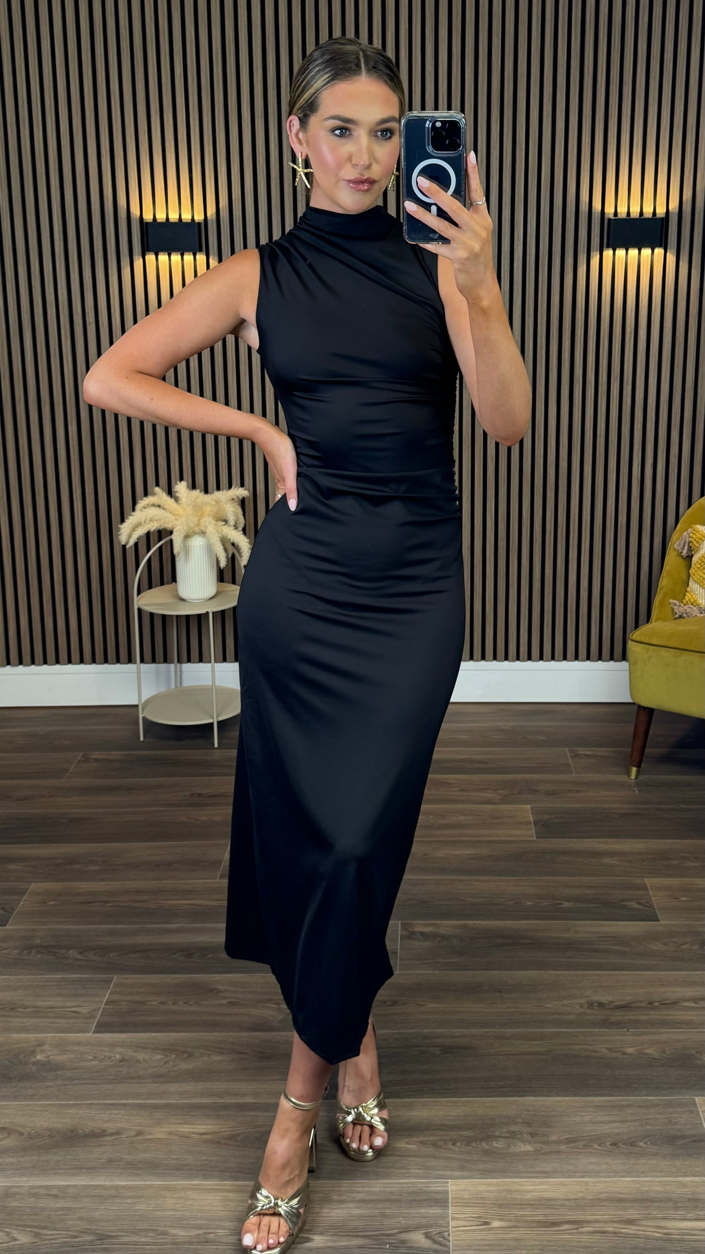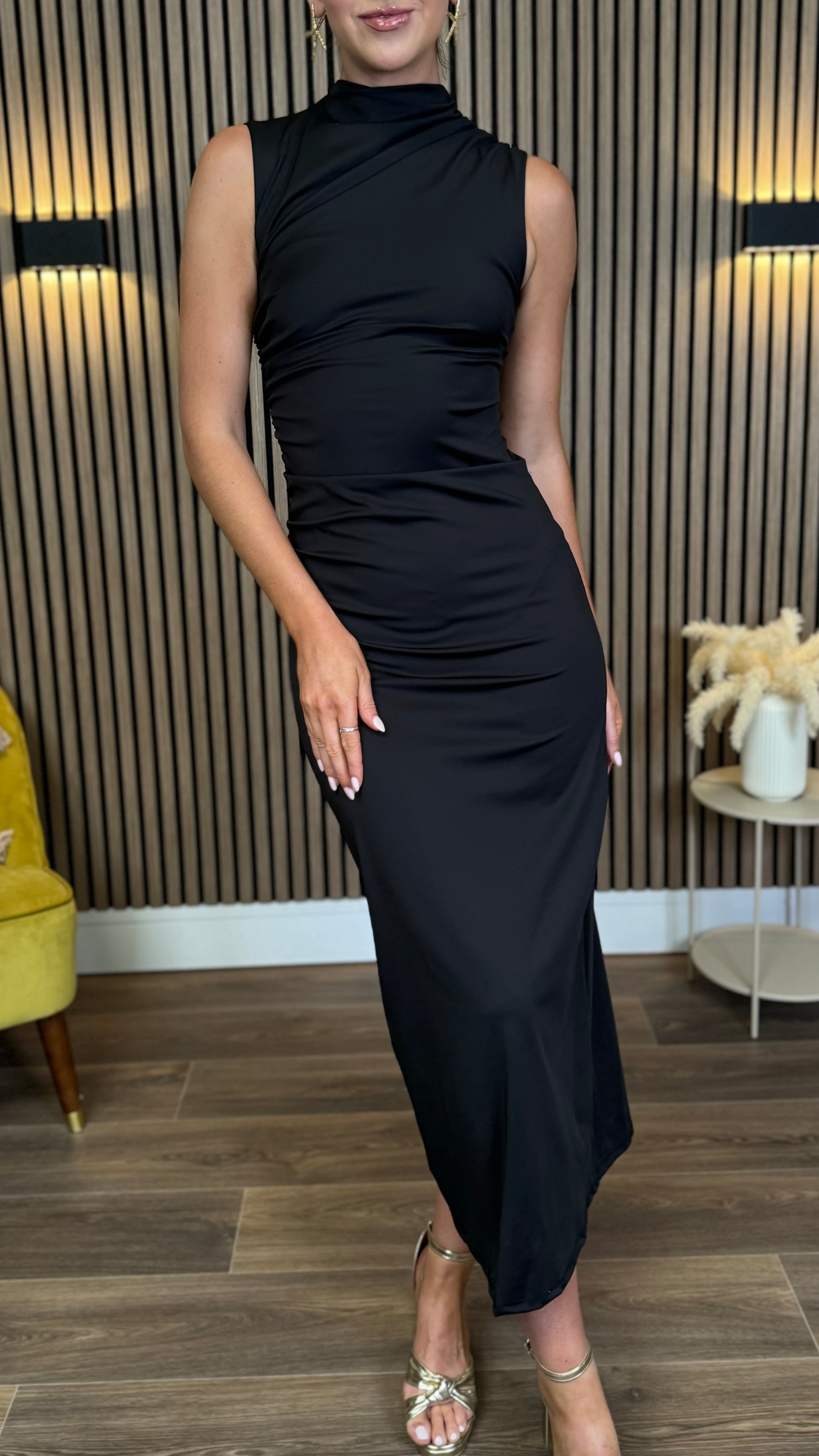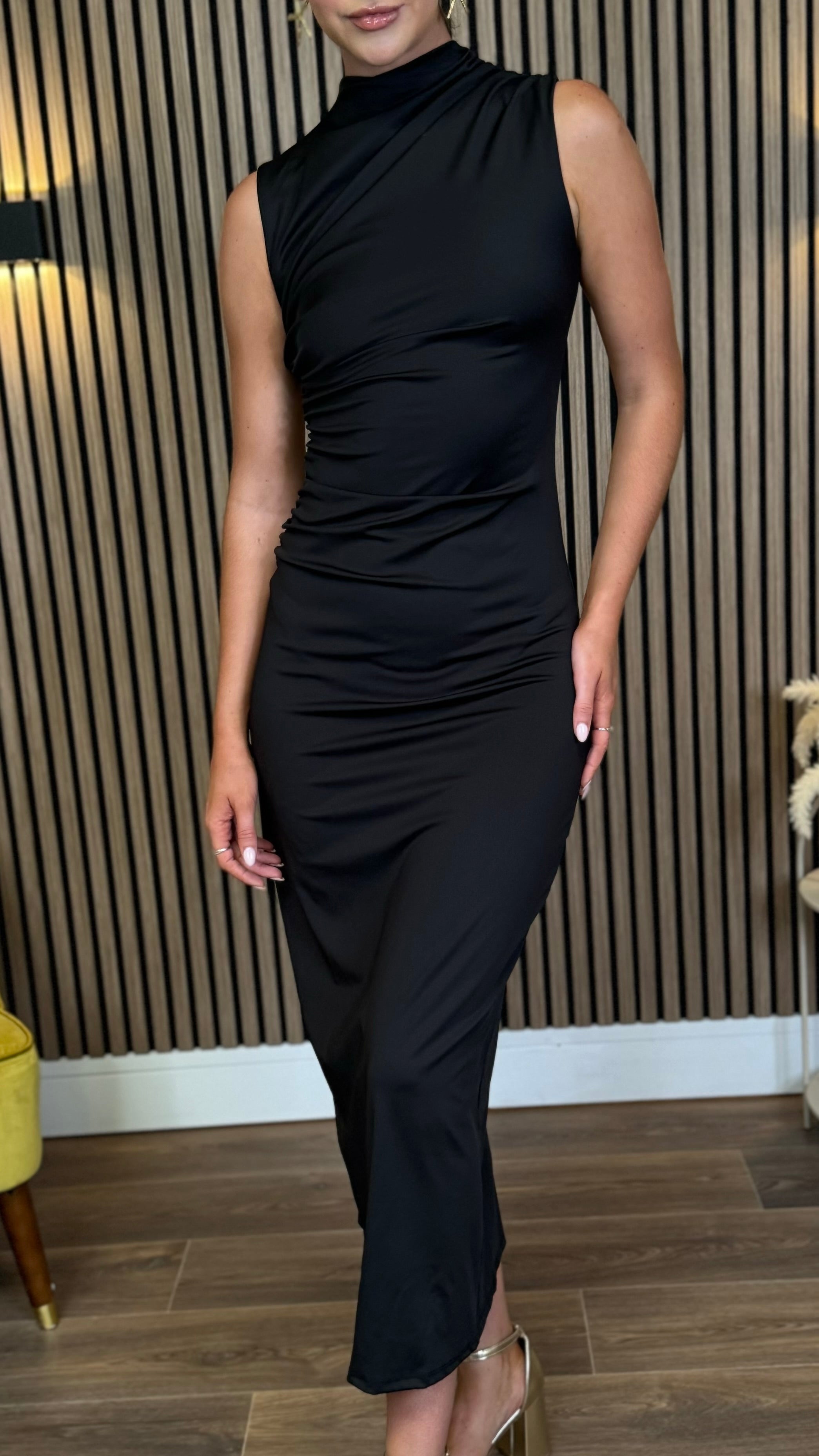 The Clora Black High Neck Ruched Midaxi Dress features a chic high neckline and beautifully ruched detail that flatters your figure. Its midaxi length offers a graceful and modern look, perfect for refined evenings or special events. Designed for comfort and style, this dress adds a polished touch to any wardrobe. 🖤✨