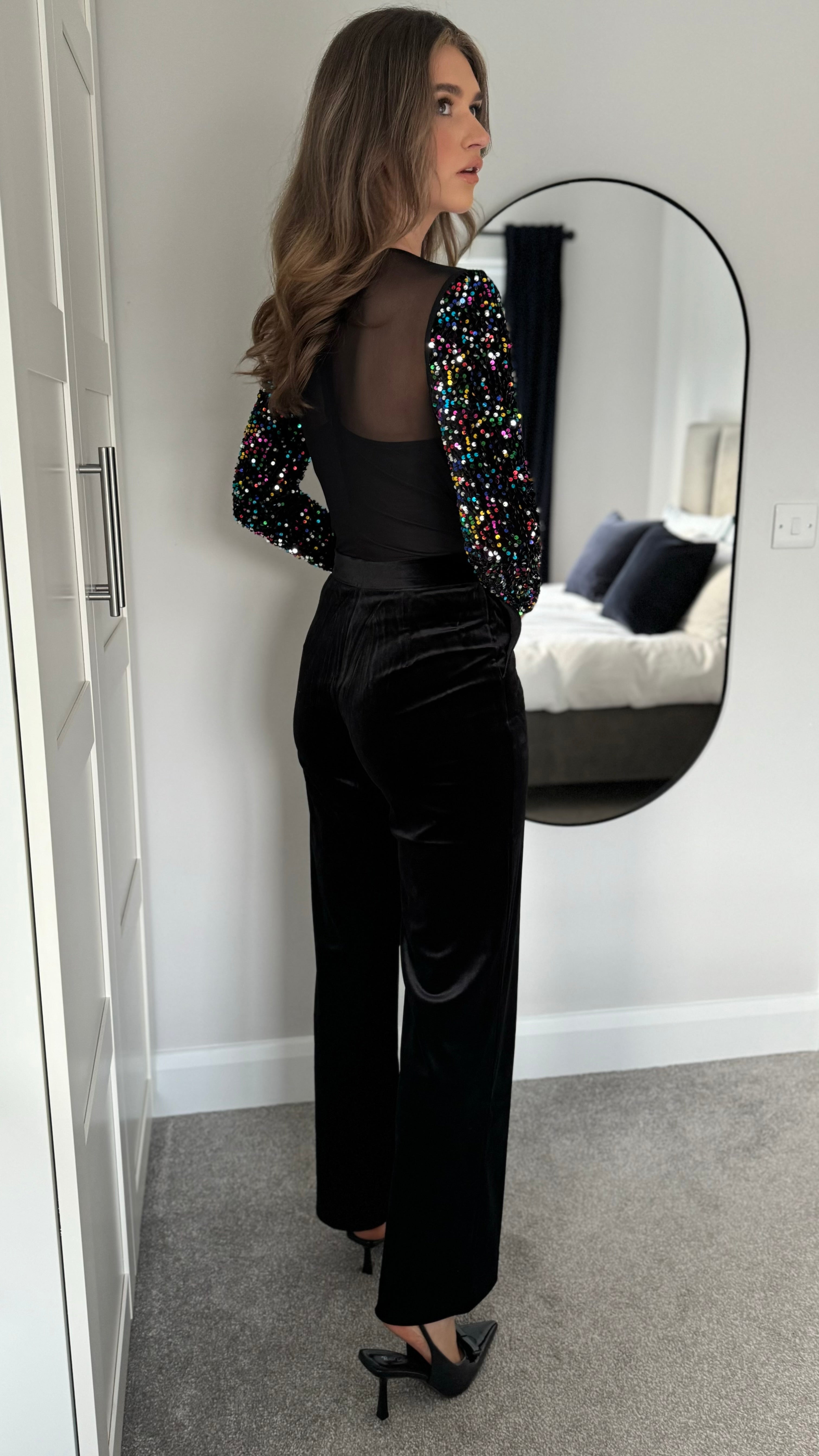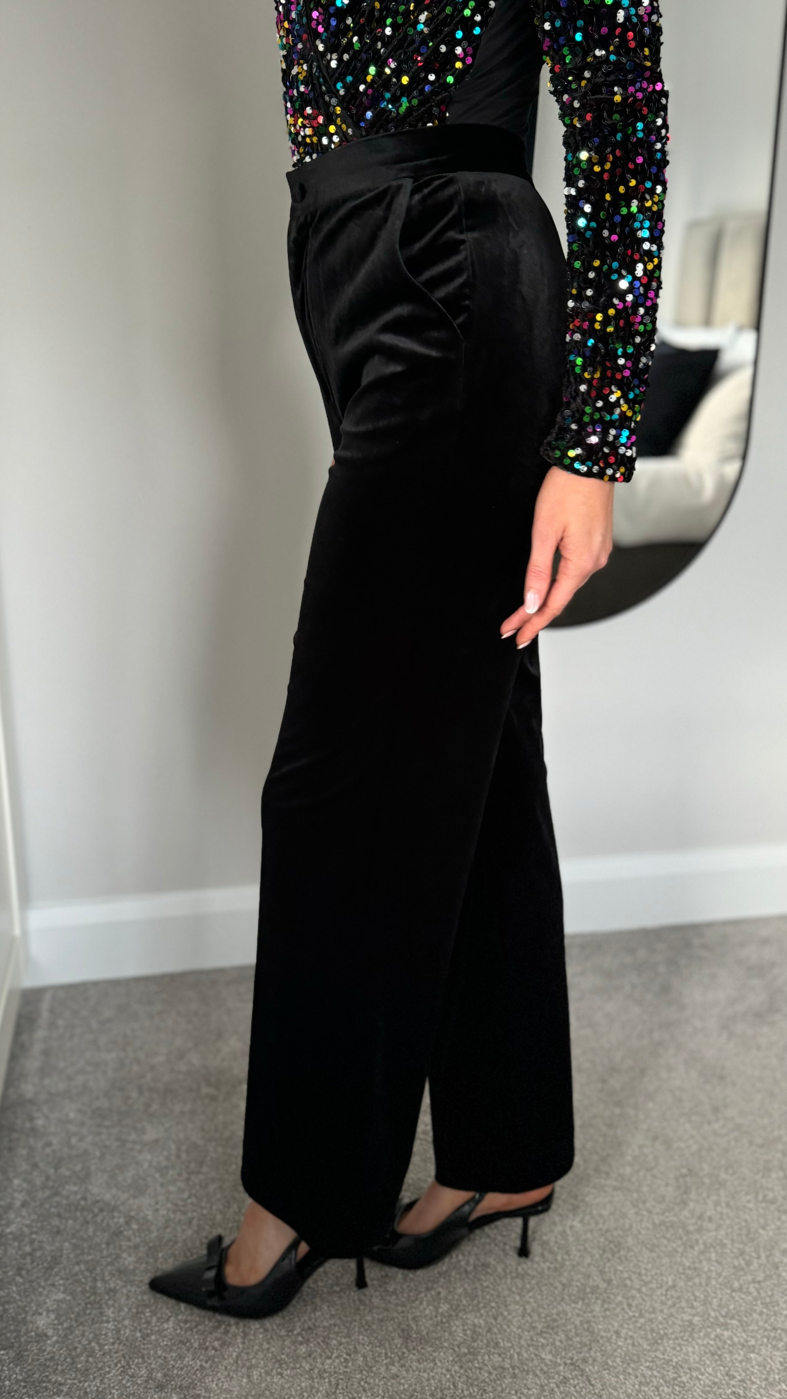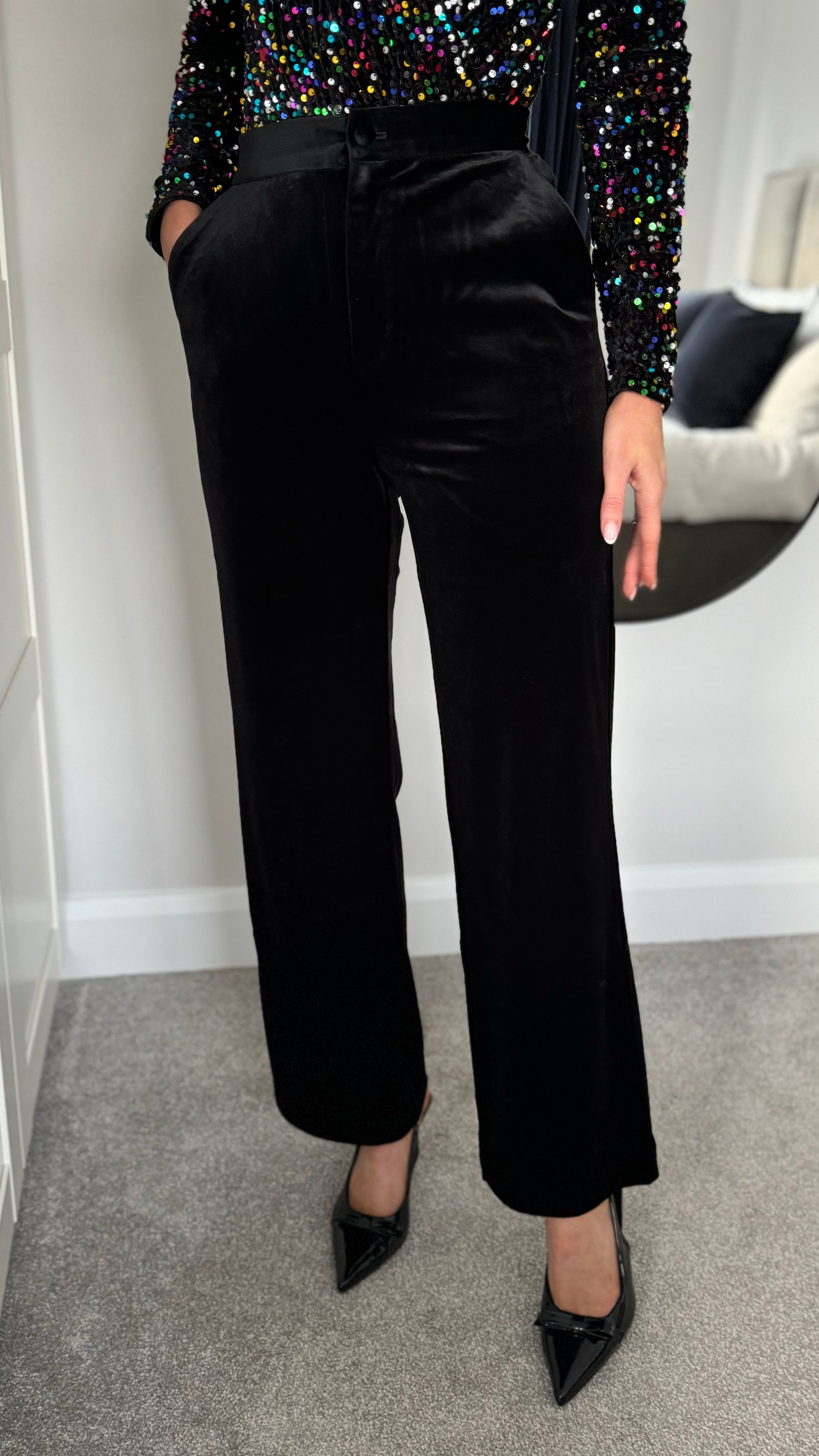 Add a touch of velvet to your wardrobe with Corey Black Velvet Finish Straight Leg Trousers. The slight flare at the bottom adds a hint of playfulness to these sleek and stylish trousers. Perfect for any occasion! 🖤
