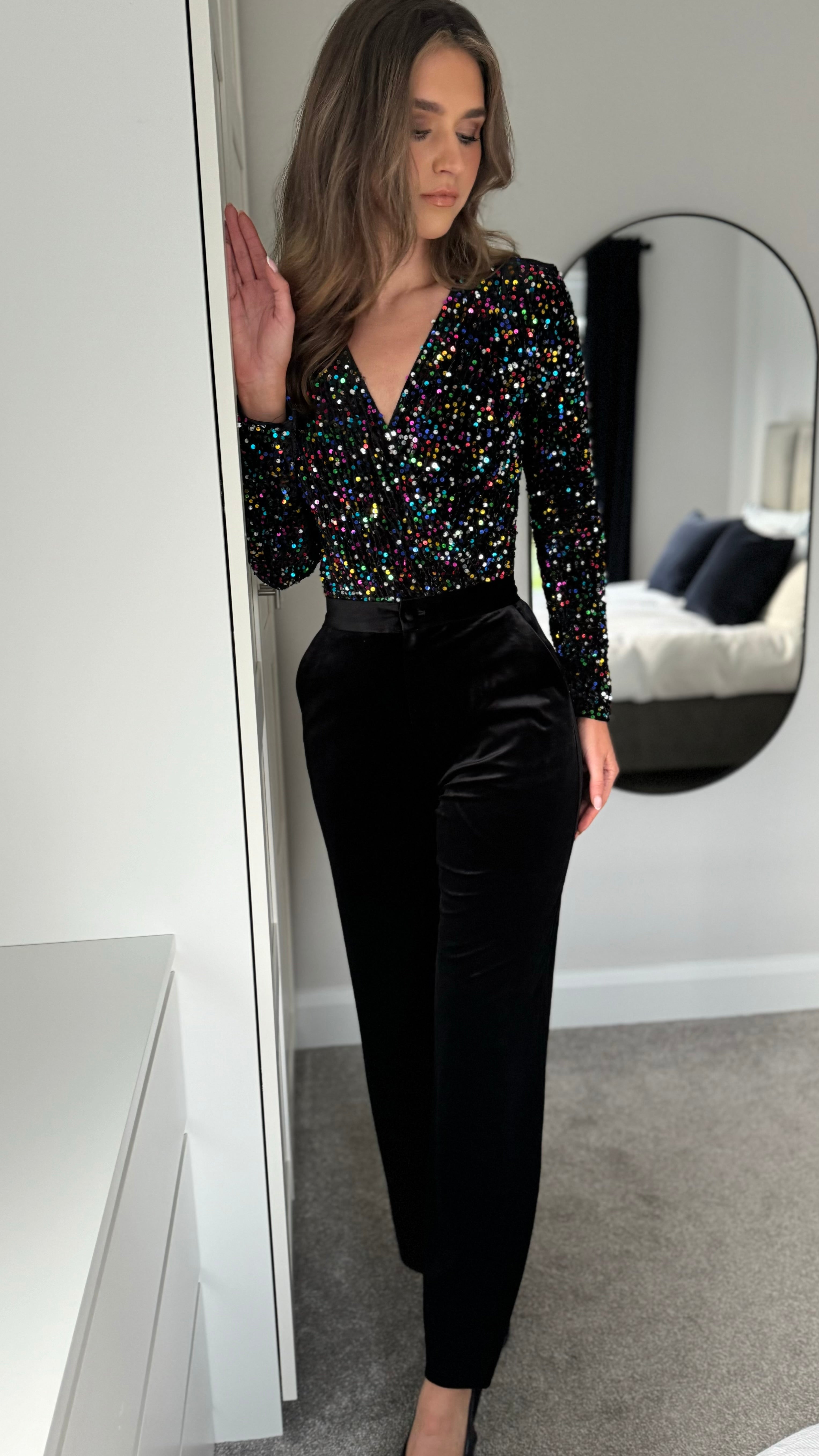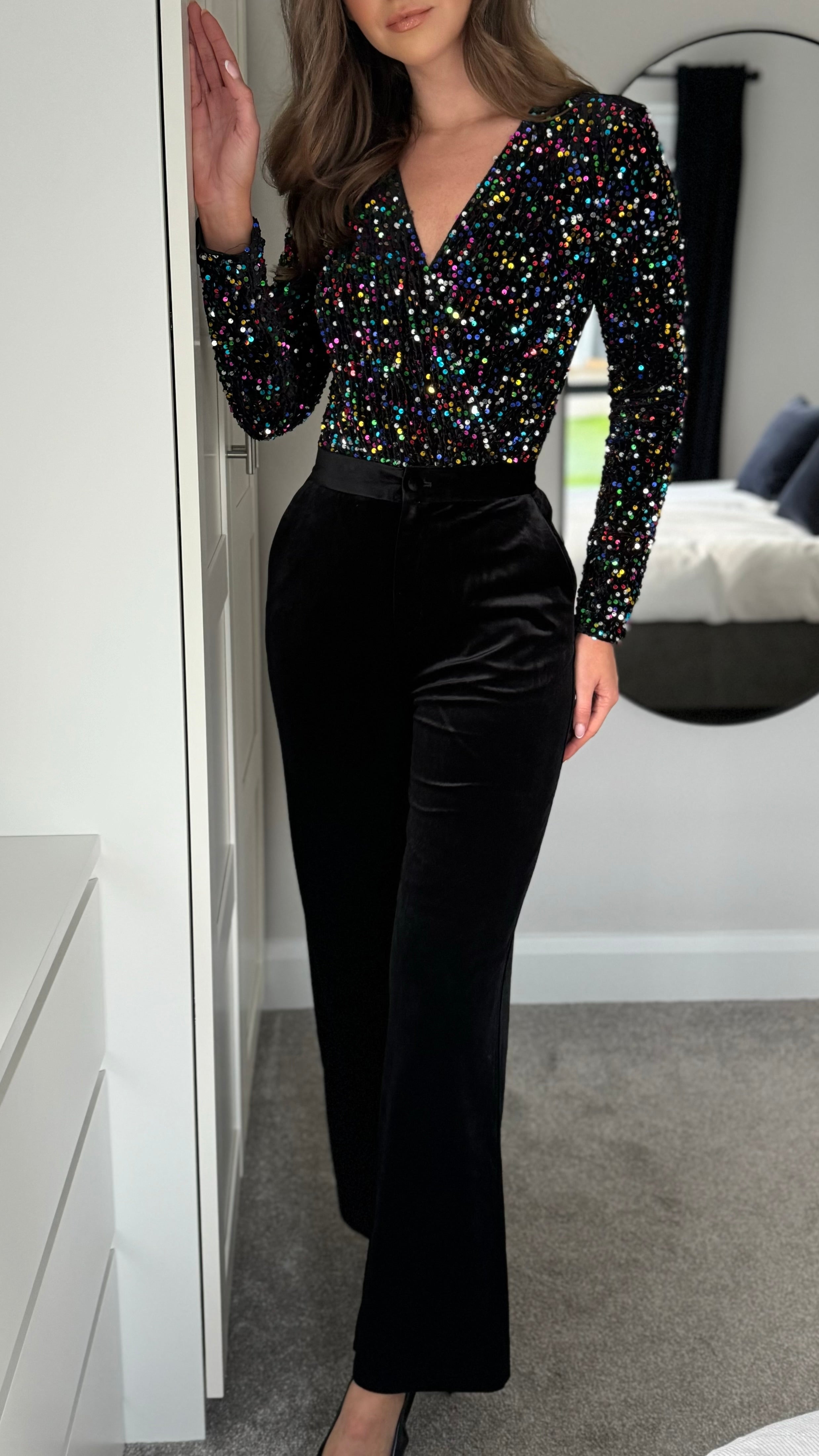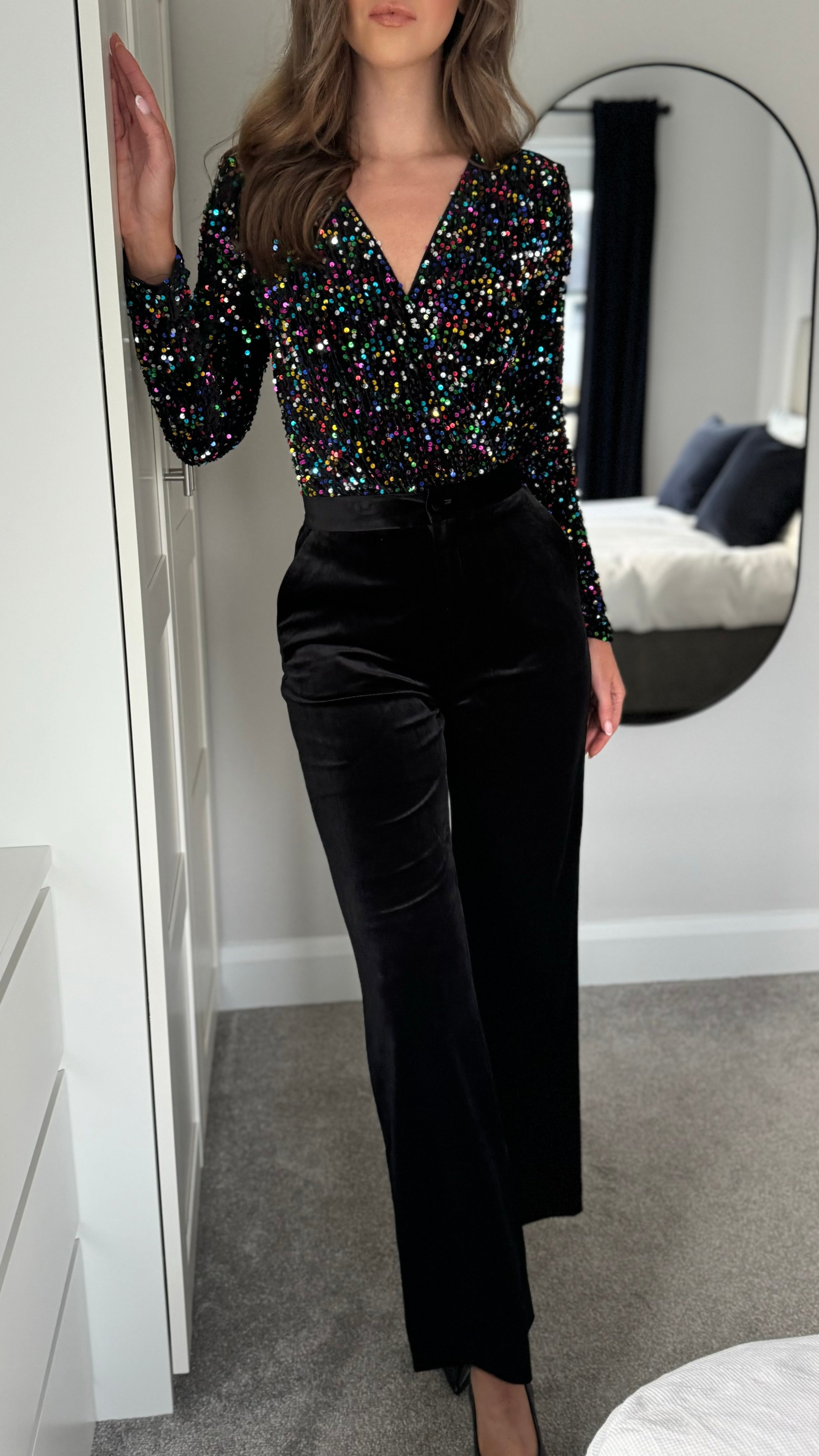 Add a touch of velvet to your wardrobe with Corey Black Velvet Finish Straight Leg Trousers. The slight flare at the bottom adds a hint of playfulness to these sleek and stylish trousers. Perfect for any occasion! 🖤