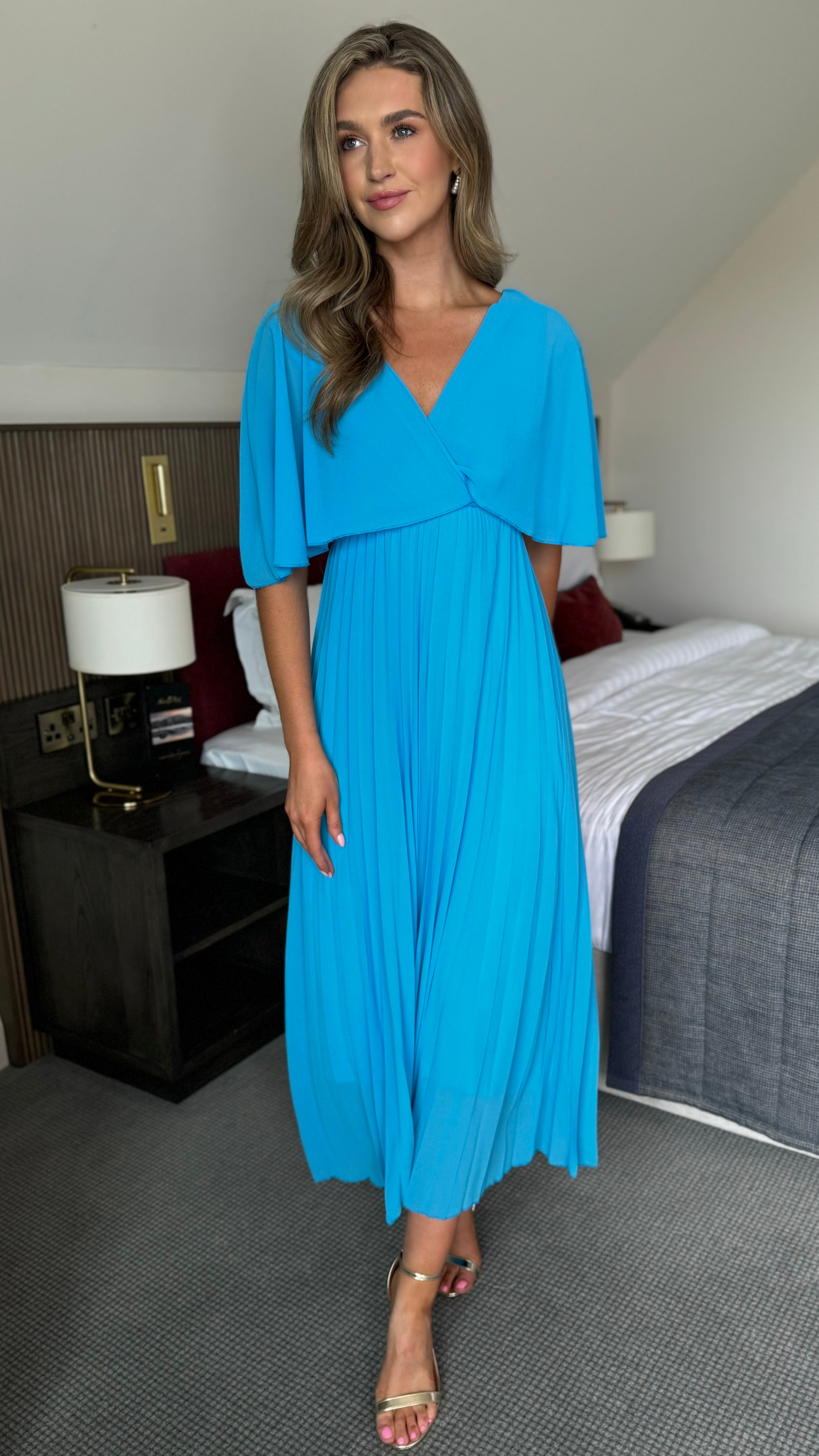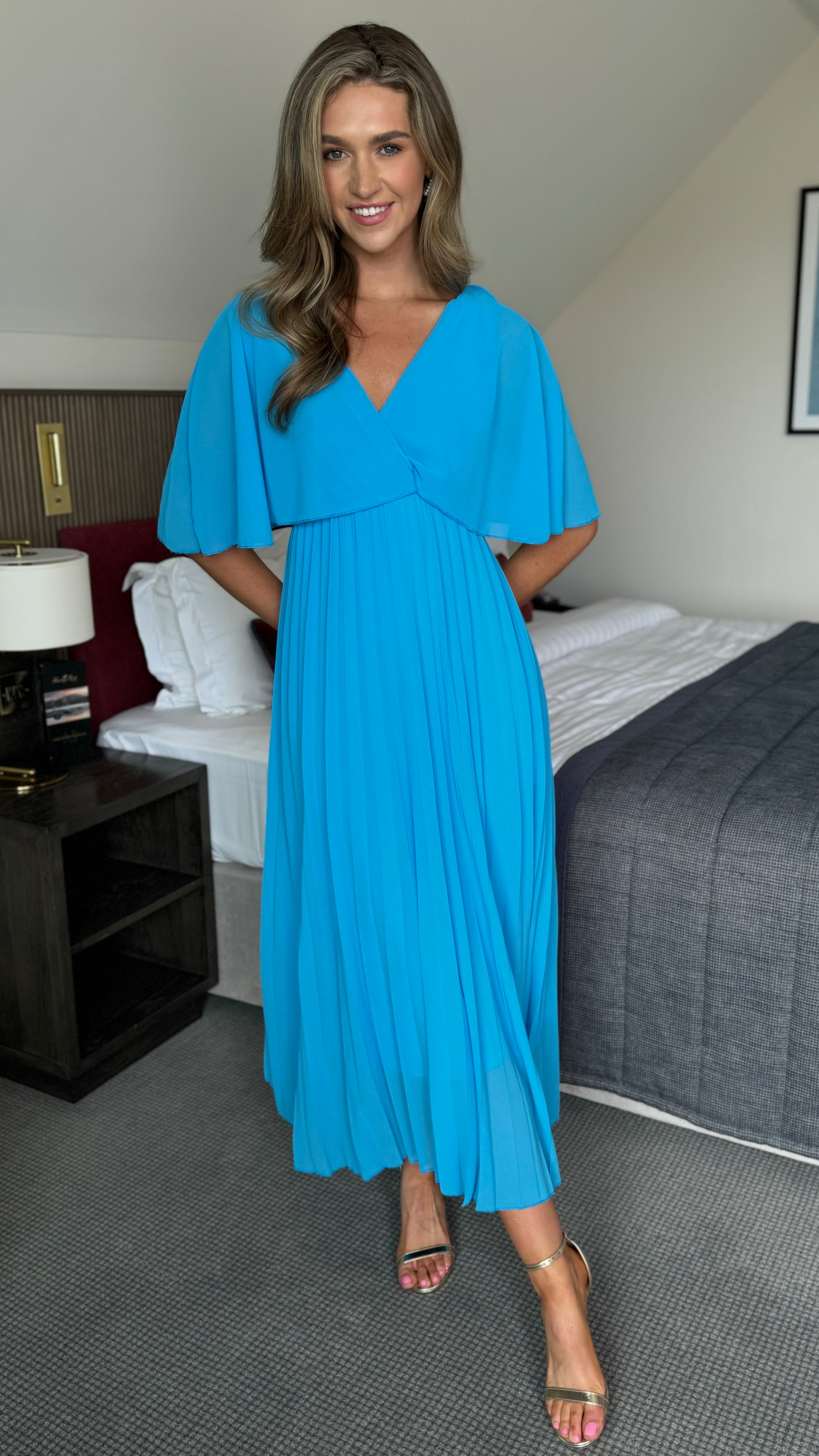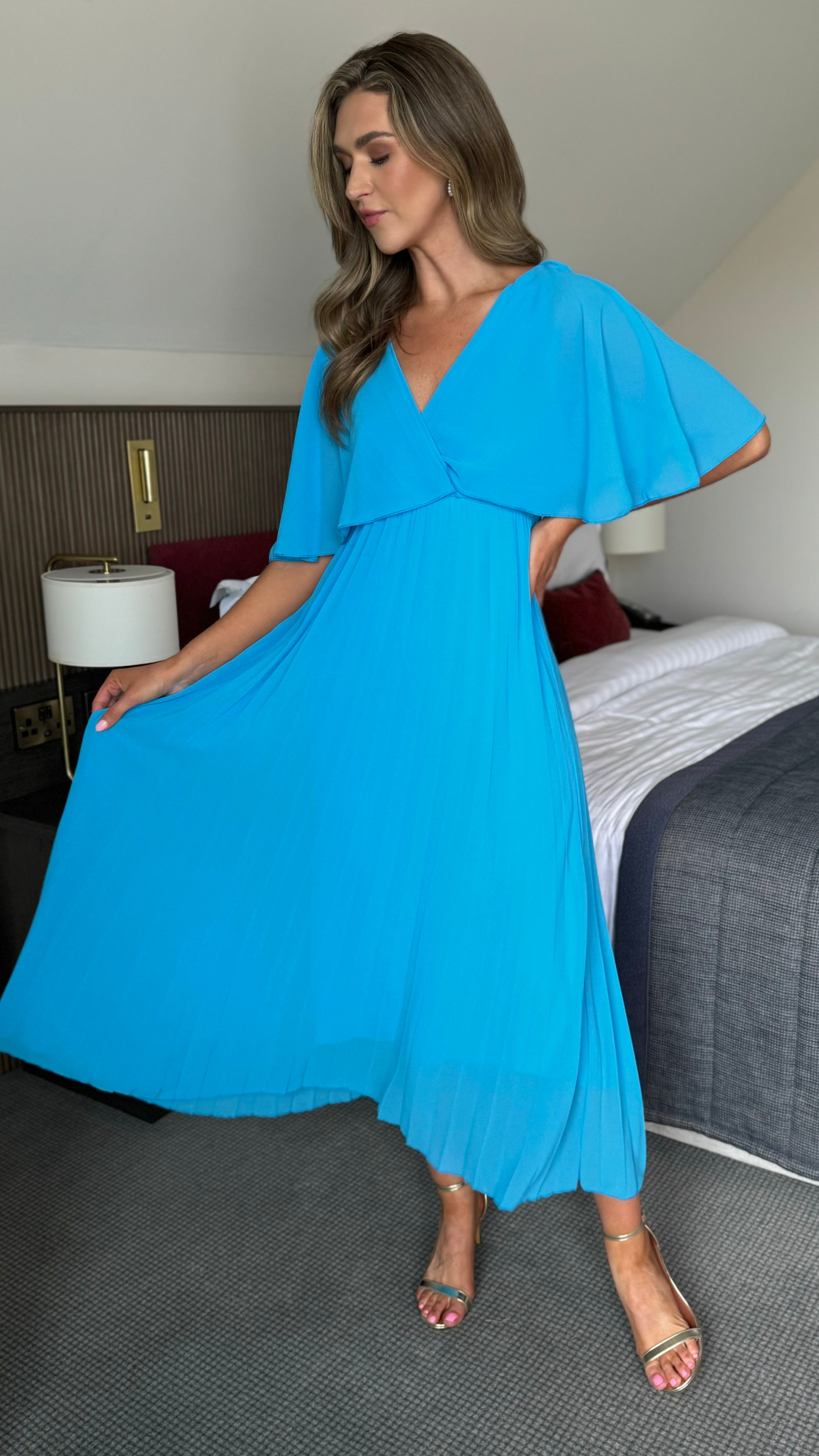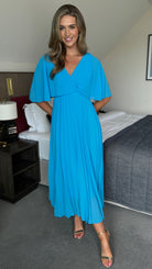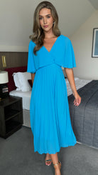 Elevate your style with our Dahlia Aqua Blue V Neck Draped Sleeve Midaxi Dress. With a flattering V neck, draped sleeves, and a midaxi length, this dress exudes elegance and sophistication. It is perfect dress for any occasion, adding a touch of luxury to your wardrobe.💙