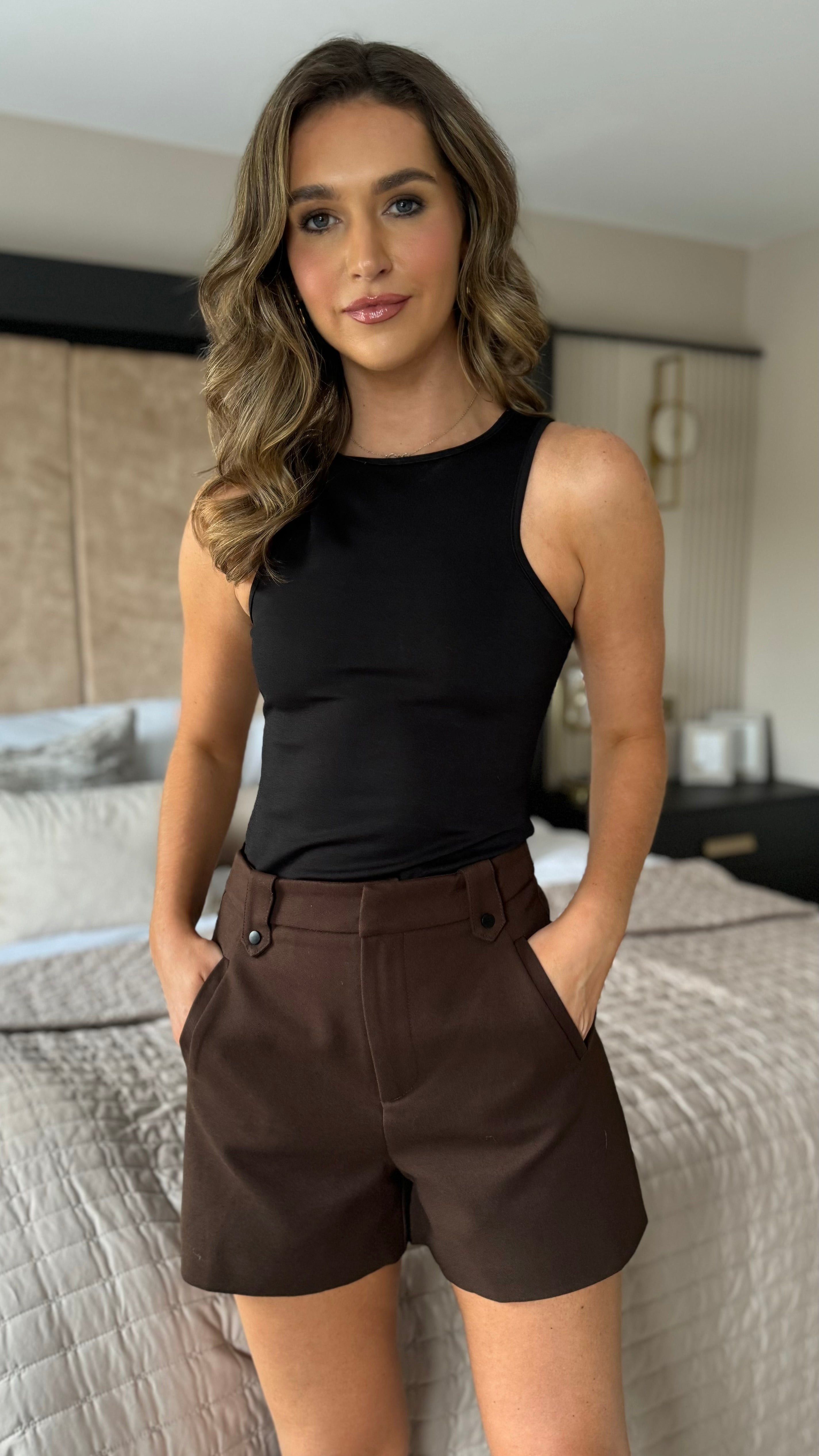 Step out in style with the Daphne Brown High Waisted Tailored Shorts. Featuring a flattering high waist and handy front pockets, these shorts effortlessly blend comfort and chic. Perfect for dressing up with a blazer or keeping it casual with a tee, they’re your go-to piece for any occasion that calls for a playful touch.