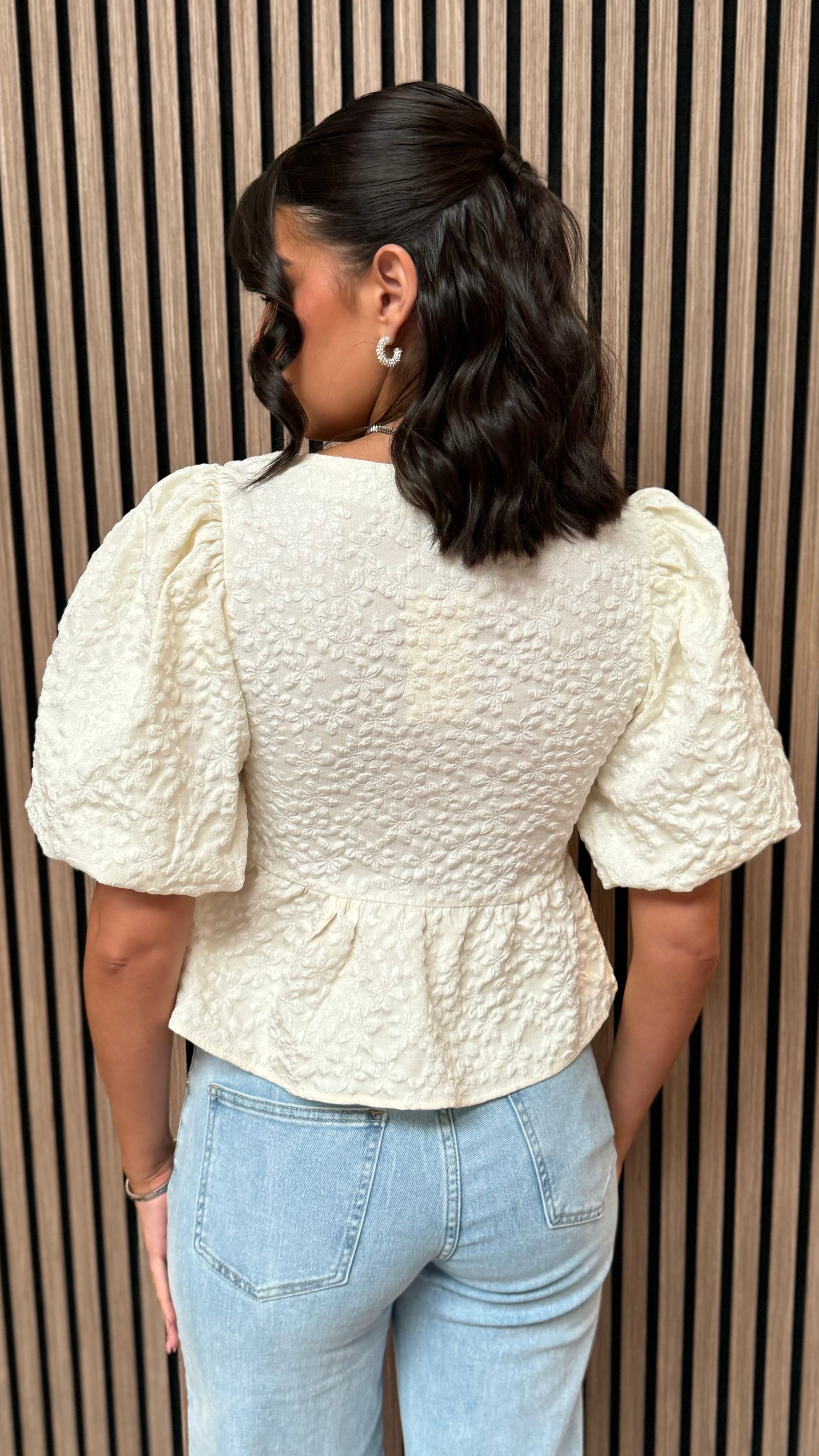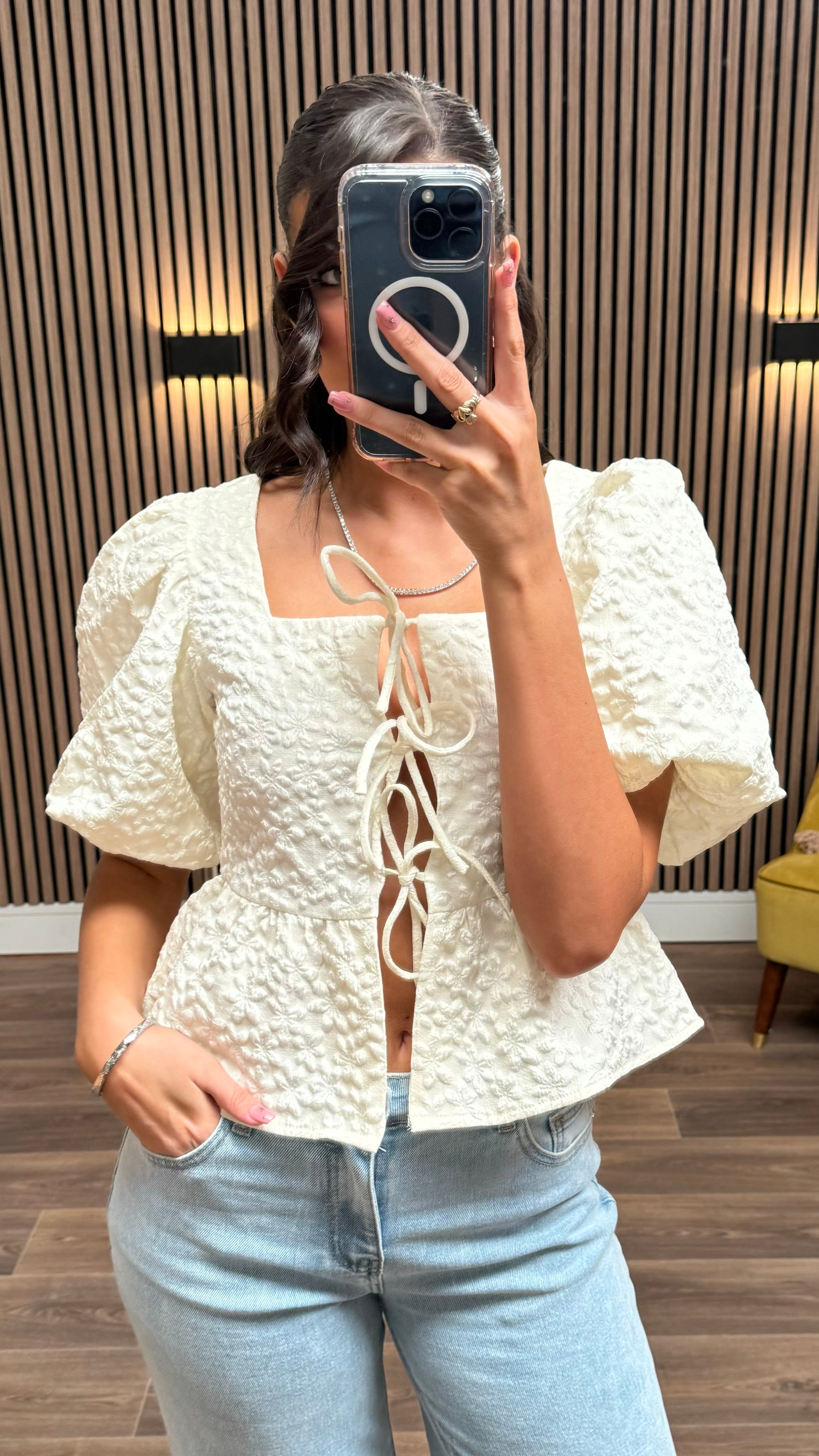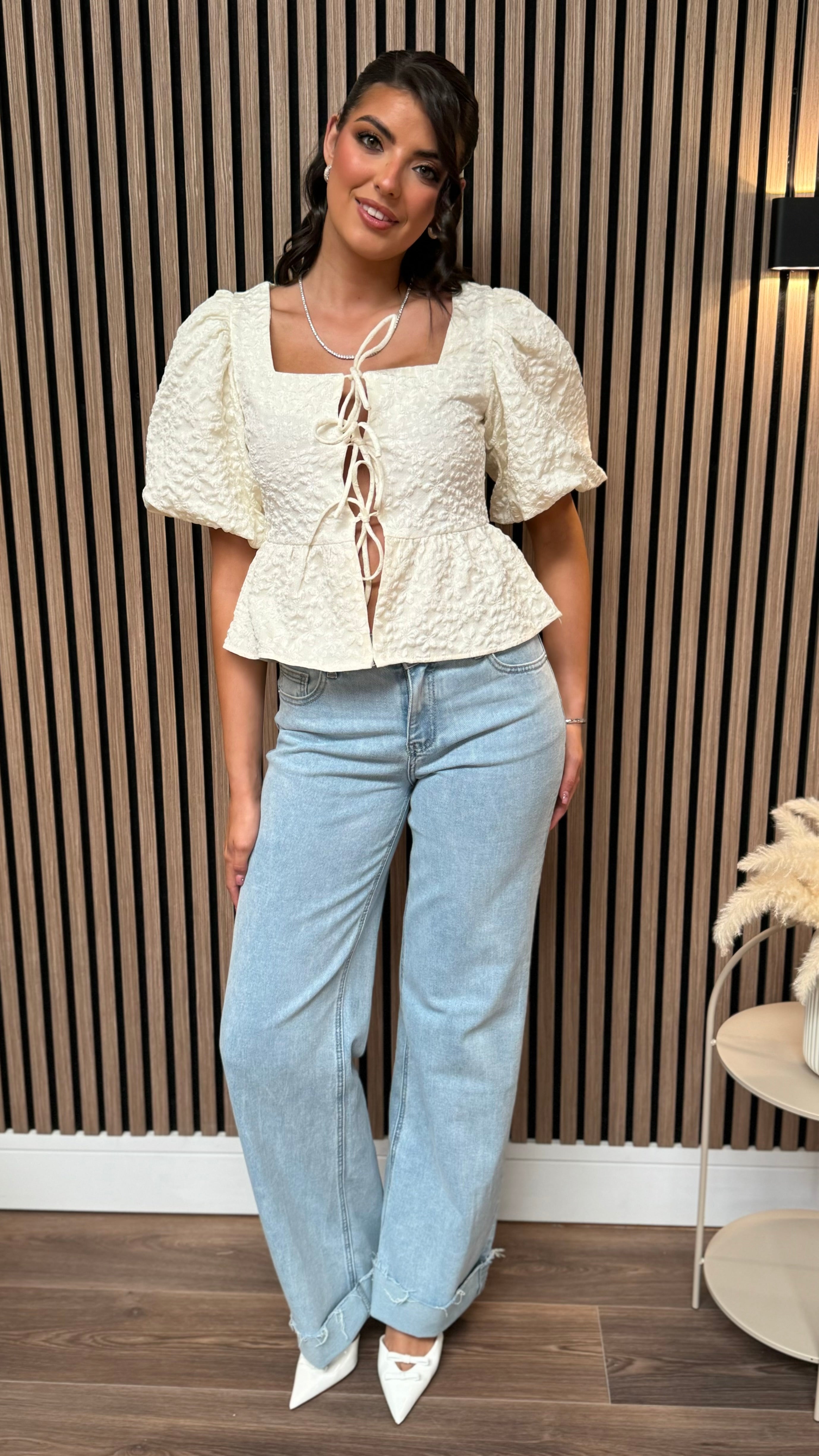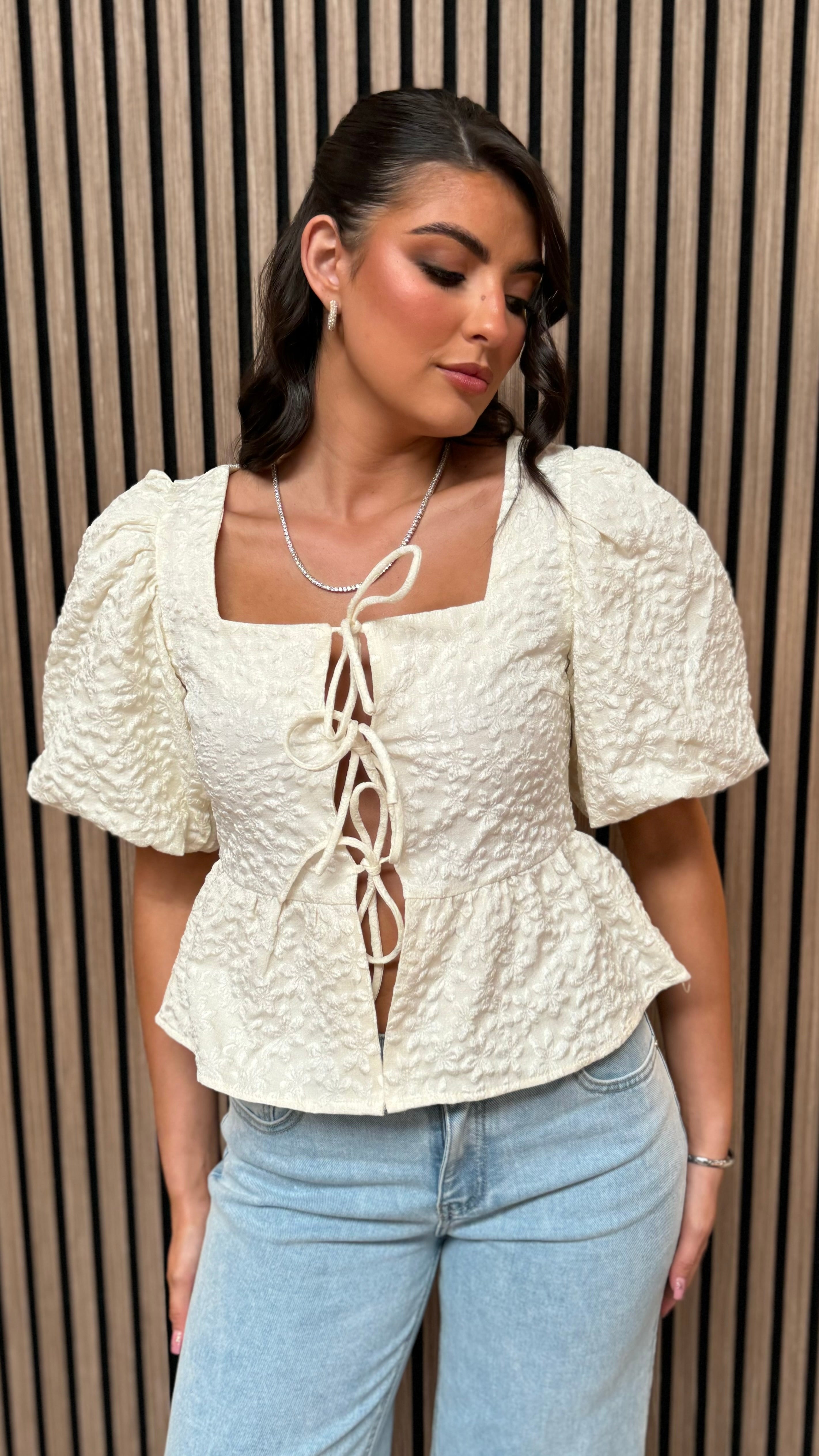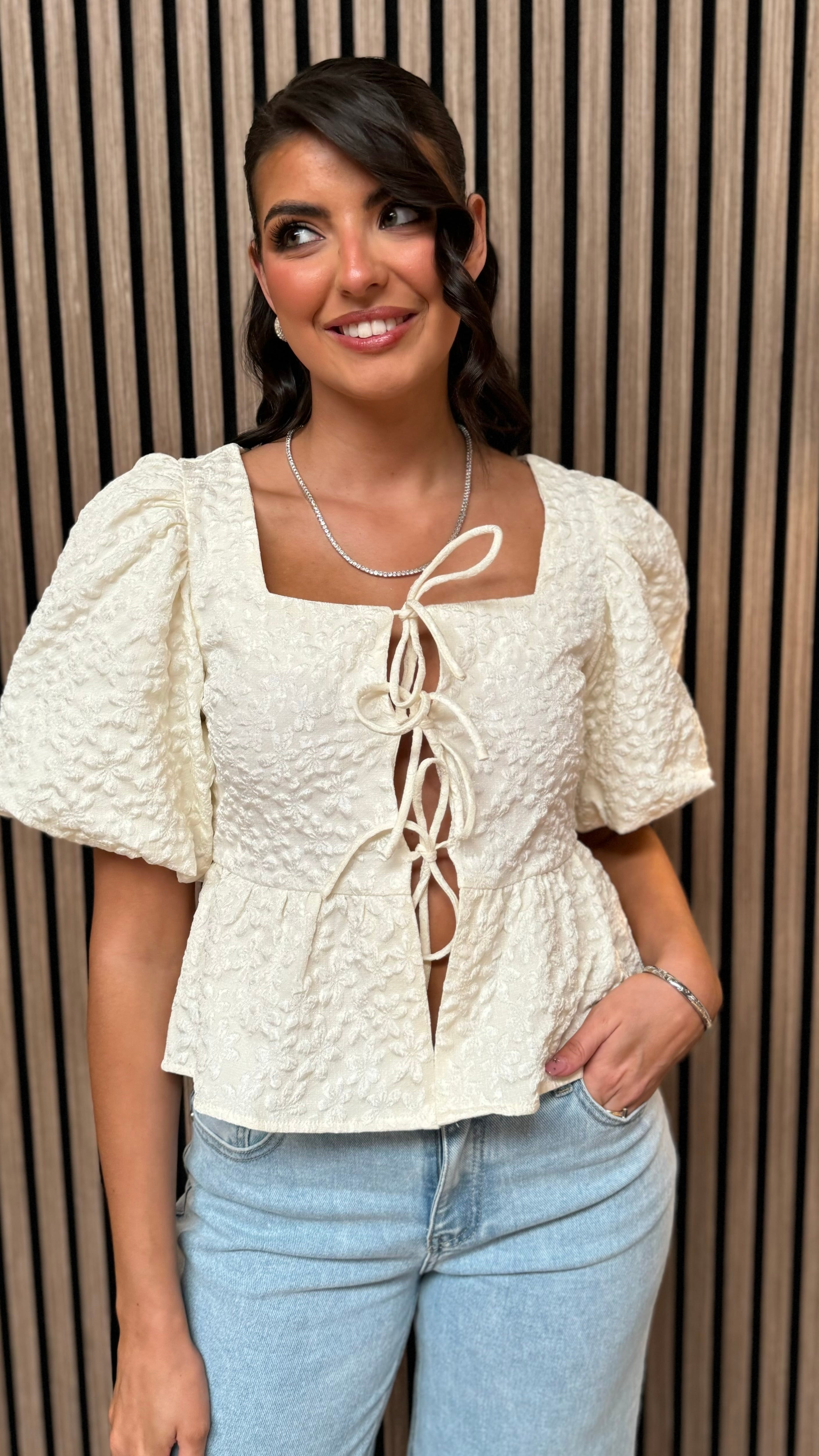 Desiree Cream Textured Tie Detail Puff Sleeve Top
