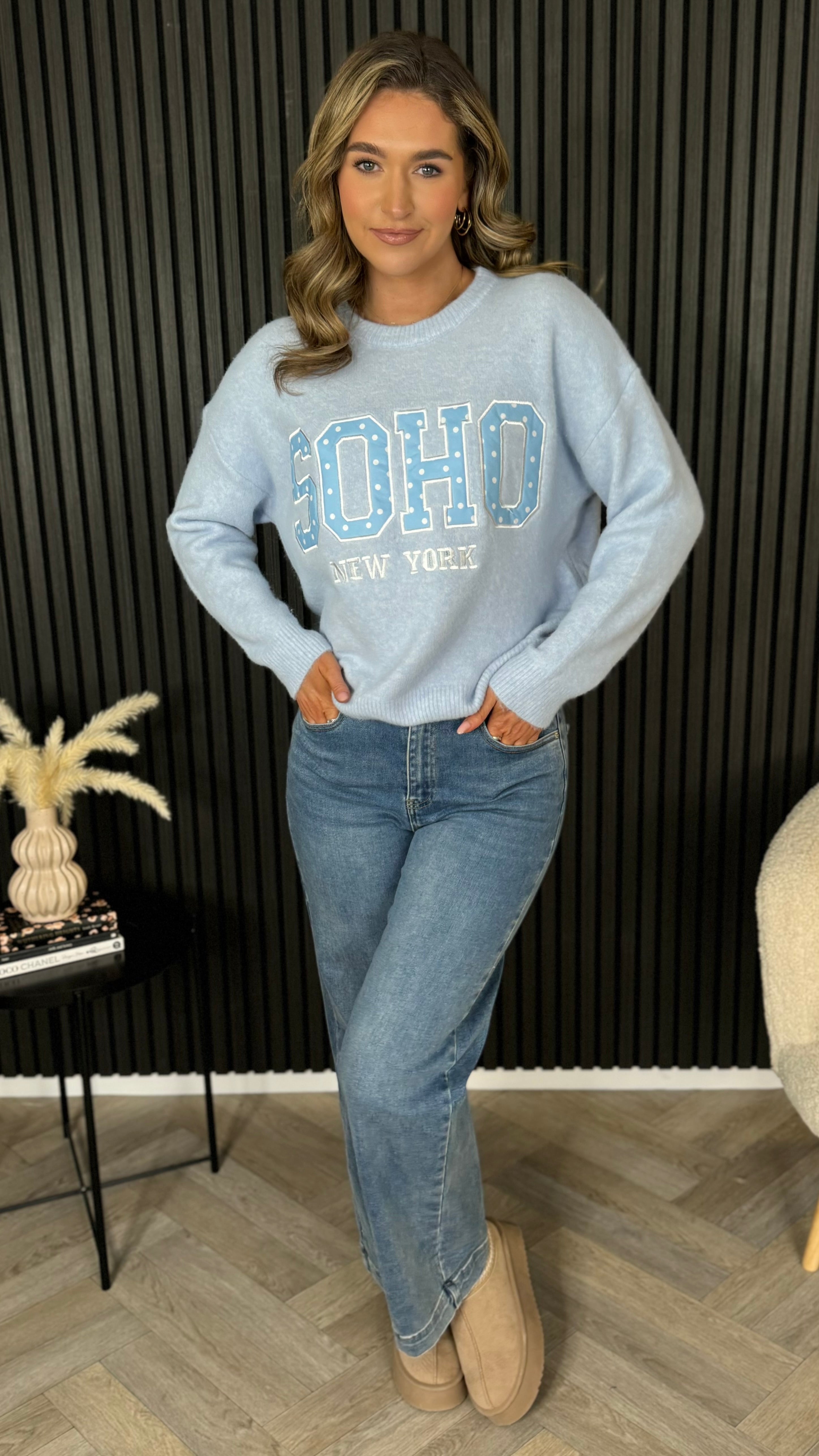 Wrap yourself in comfort with this charming baby blue jumper, featuring a delightful polka dot pattern that brings a touch of whimsy to your wardrobe. The classic crew neck design pairs perfectly with the playful dots, while the soft, cosy fabric makes it an absolute dream to wear.