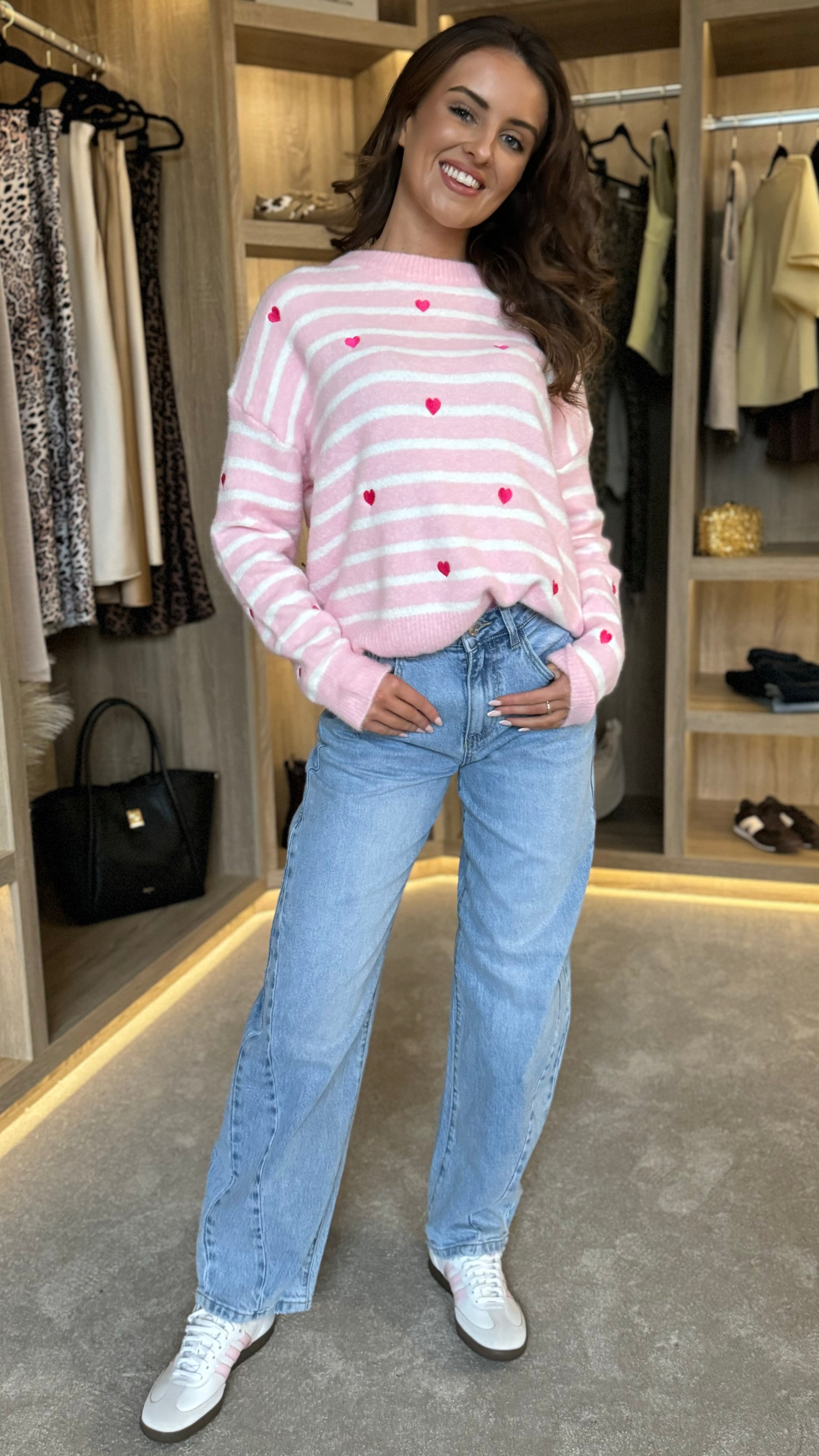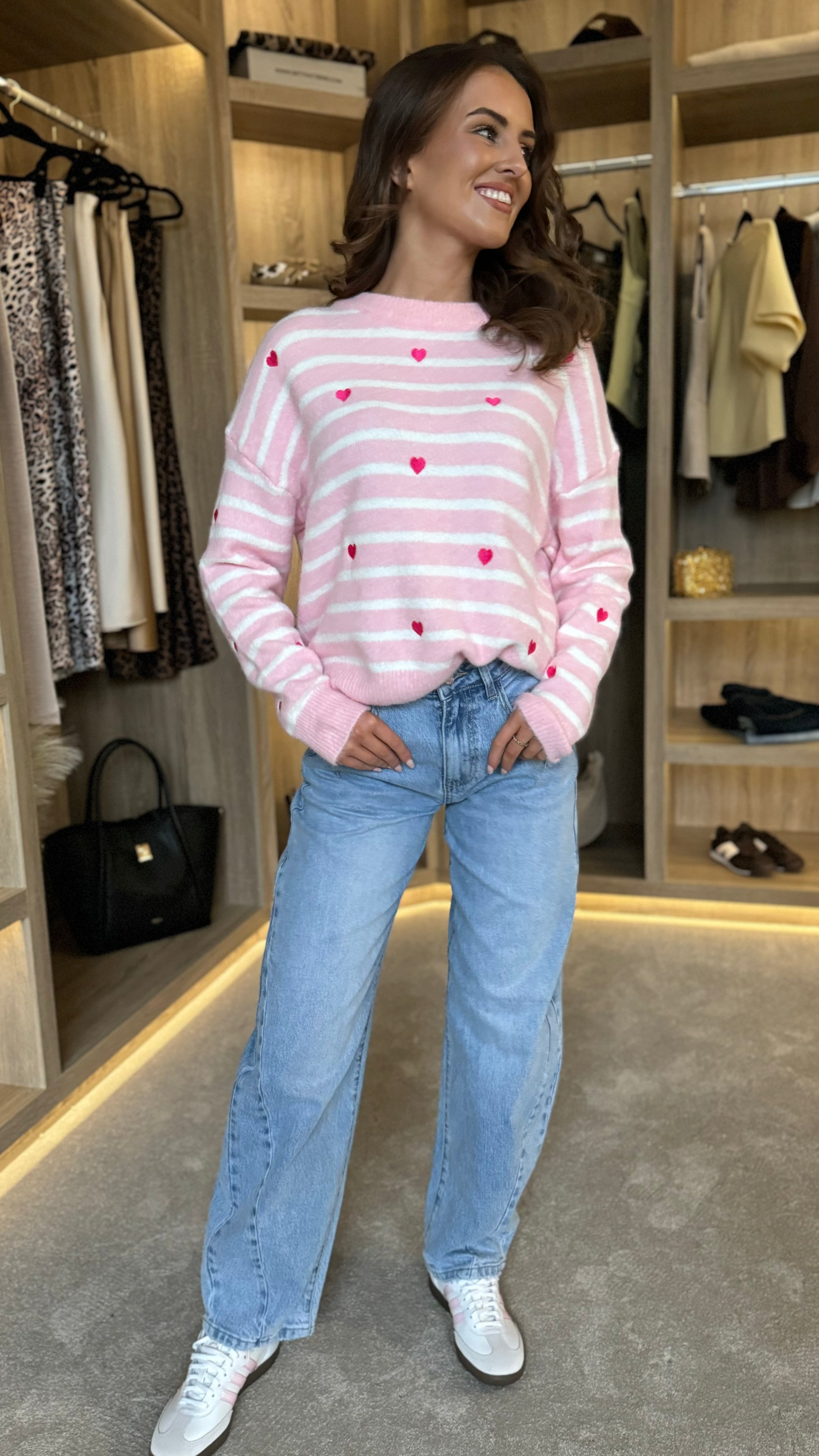 Adorable pink striped jumper featuring a charming heart detail that'll make you smile every time you pull it over your head. Crafted from soft knit fabric, this cosy piece wraps you in comfort while the double knit collar adds a touch of structured style. Perfect for layering or wearing solo, it's the kind of jumper that feels as good as it looks. A playful wardrobe essential that brings a little extra love to your everyday outfits.