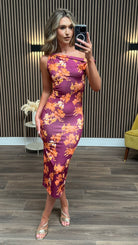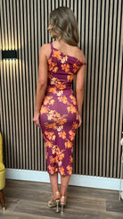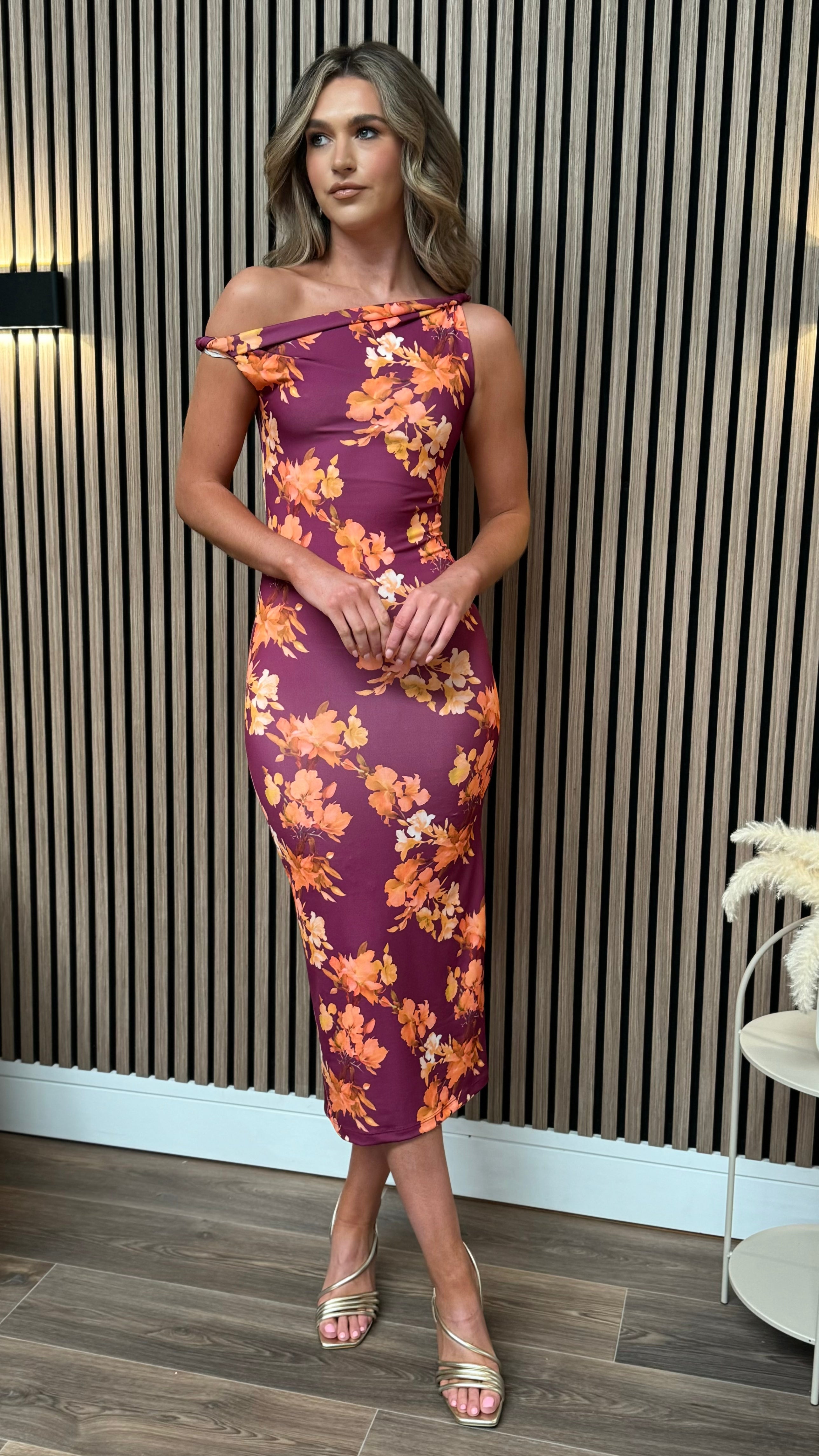 Flaunt your style in the Eabha Midi Dress! This playful piece features a unique asymmetric neckline and eye-catching purple & orange floral pattern. Perfect for summer events or dressed up with accessories for evening occasions.