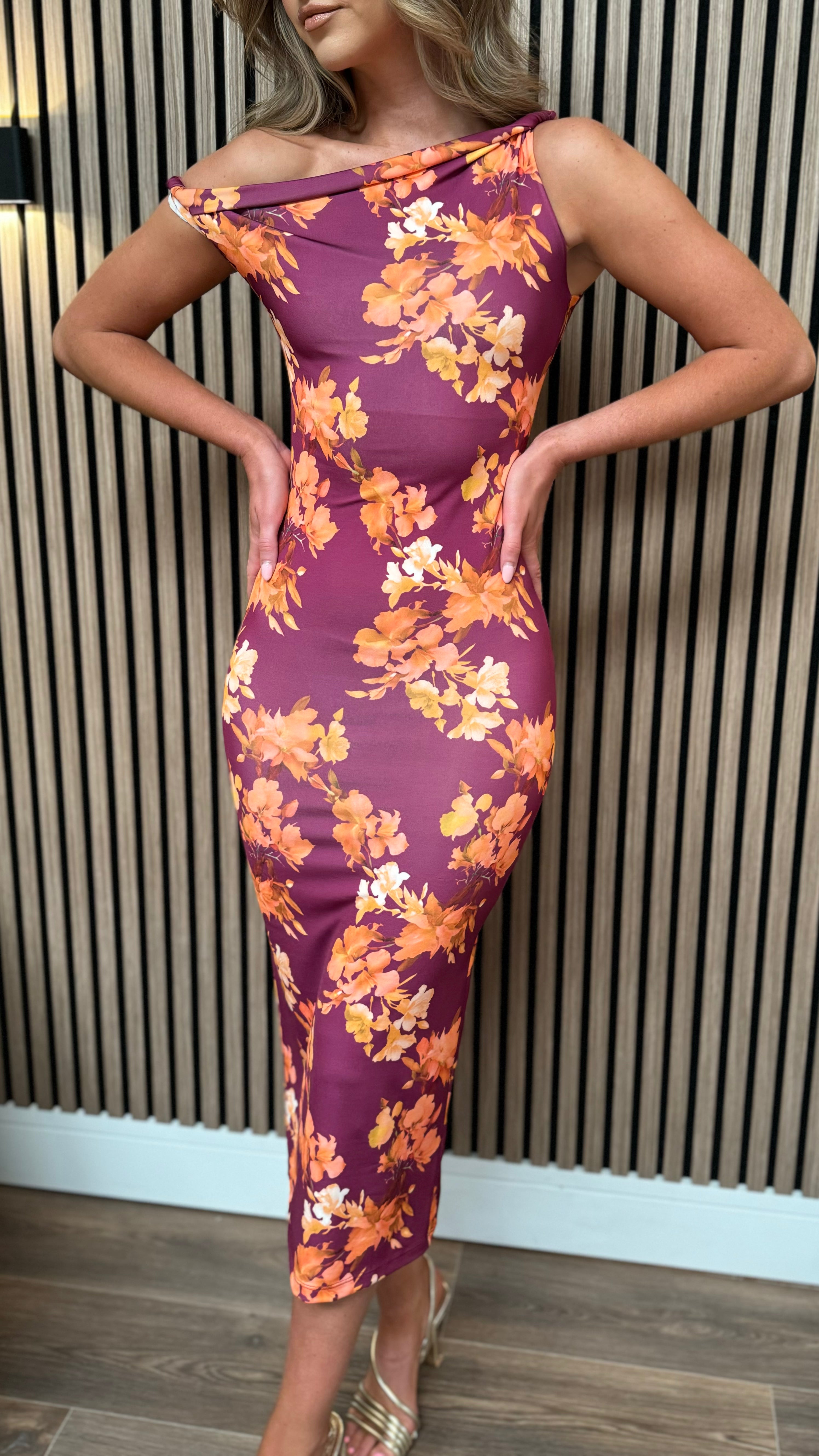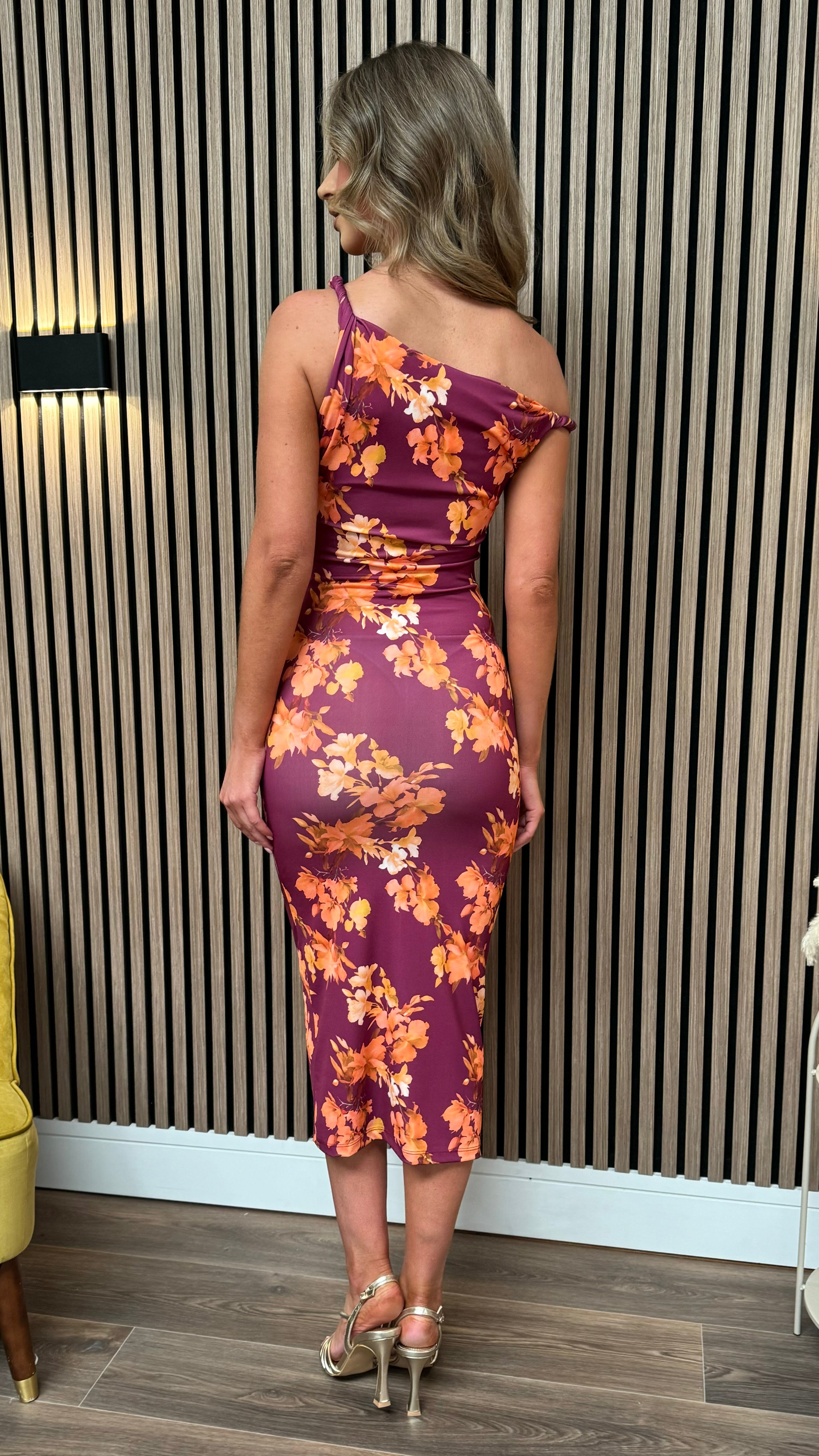 Eabha Purple & Orange Floral Asymmetric Neckline Midi Dress